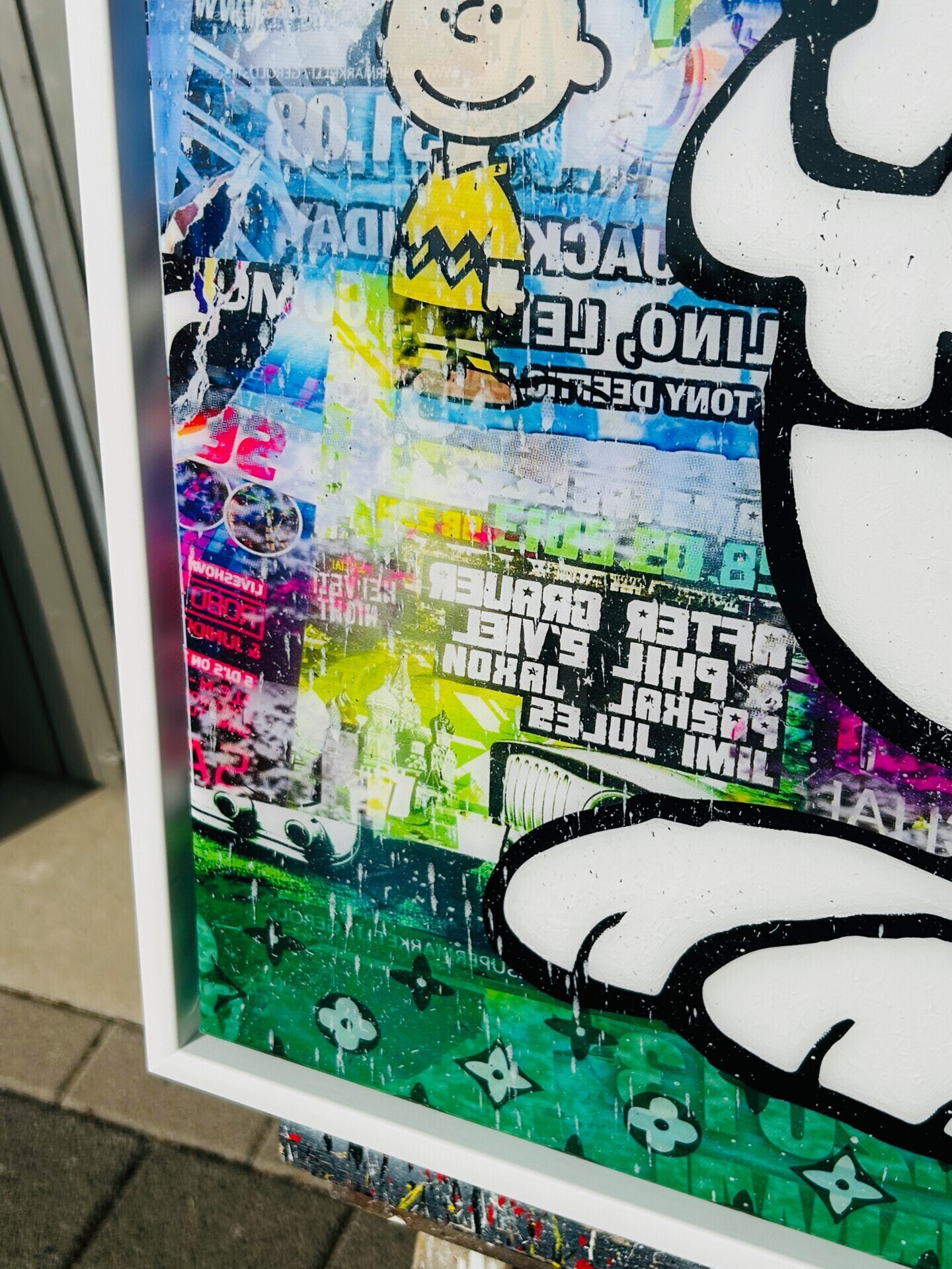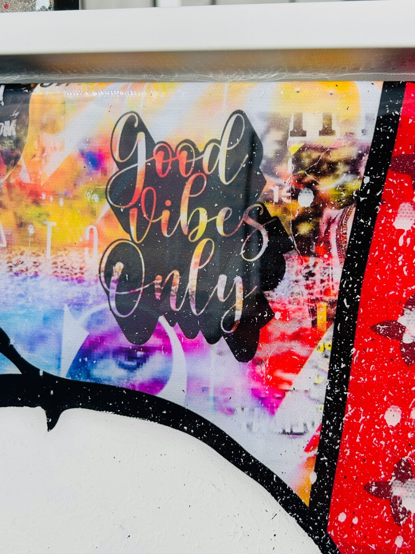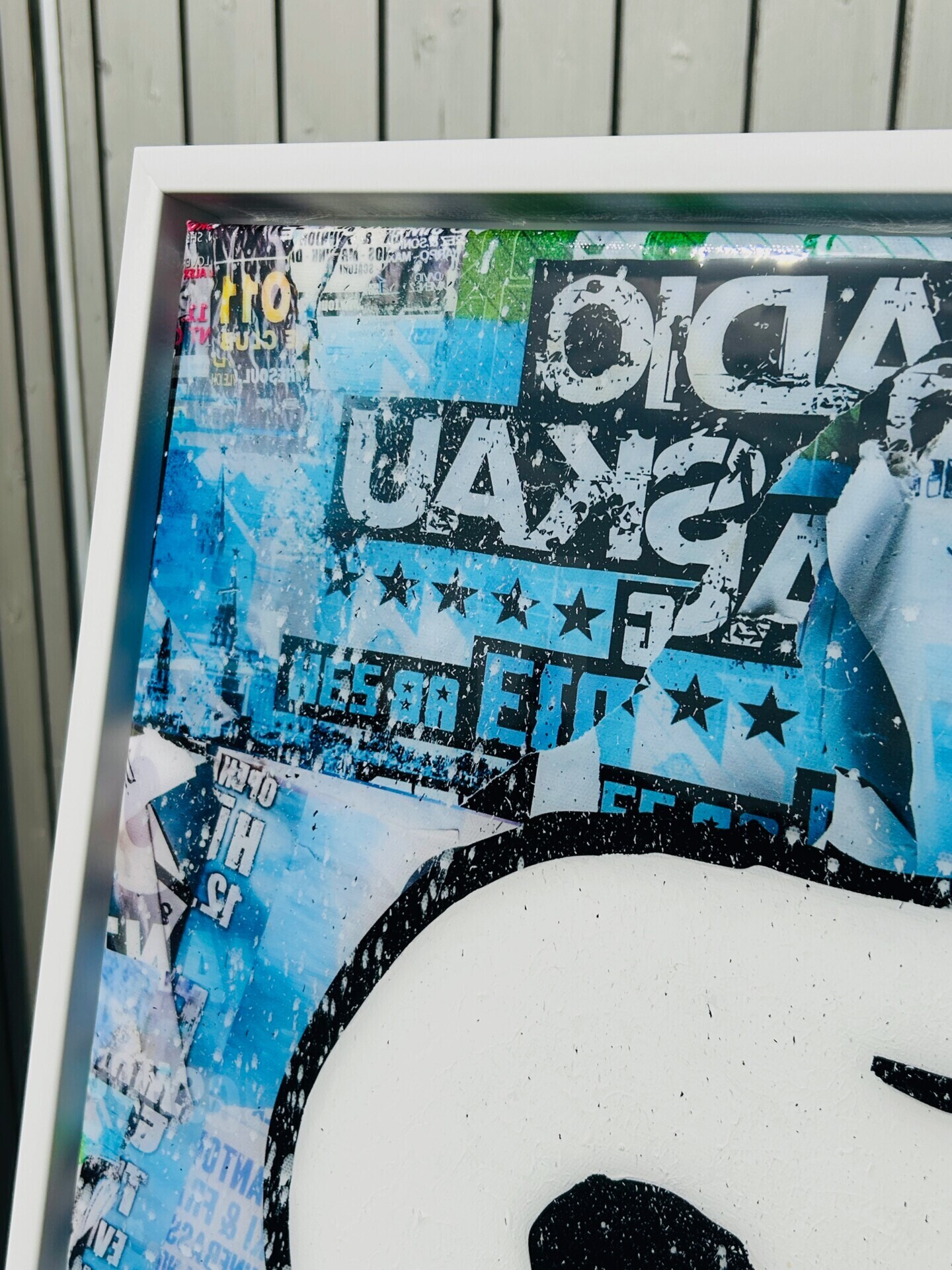El distintivo estilo Pop Art de Cuencas se caracteriza por su ingenioso uso de técnicas de collage. Reúne magistralmente fragmentos de carteles y anuncios antiguos, combinándolos a la perfección en sus composiciones. Para agregar profundidad y textura a sus obras, Cuencas emplea una amplia gama de medios que incluyen pintura en aerosol, brillantina, acrílicos, piedras, lentejuelas, recortes de metal y telas. Su proceso creativo es un viaje táctil y visceral, donde pega, rocía y refina con confianza sus motivos en composiciones cautivadoras. El toque final es una generosa aplicación de barniz epoxi, que sella la superficie con un acabado lustroso que imparte un cautivador efecto de "alto brillo".