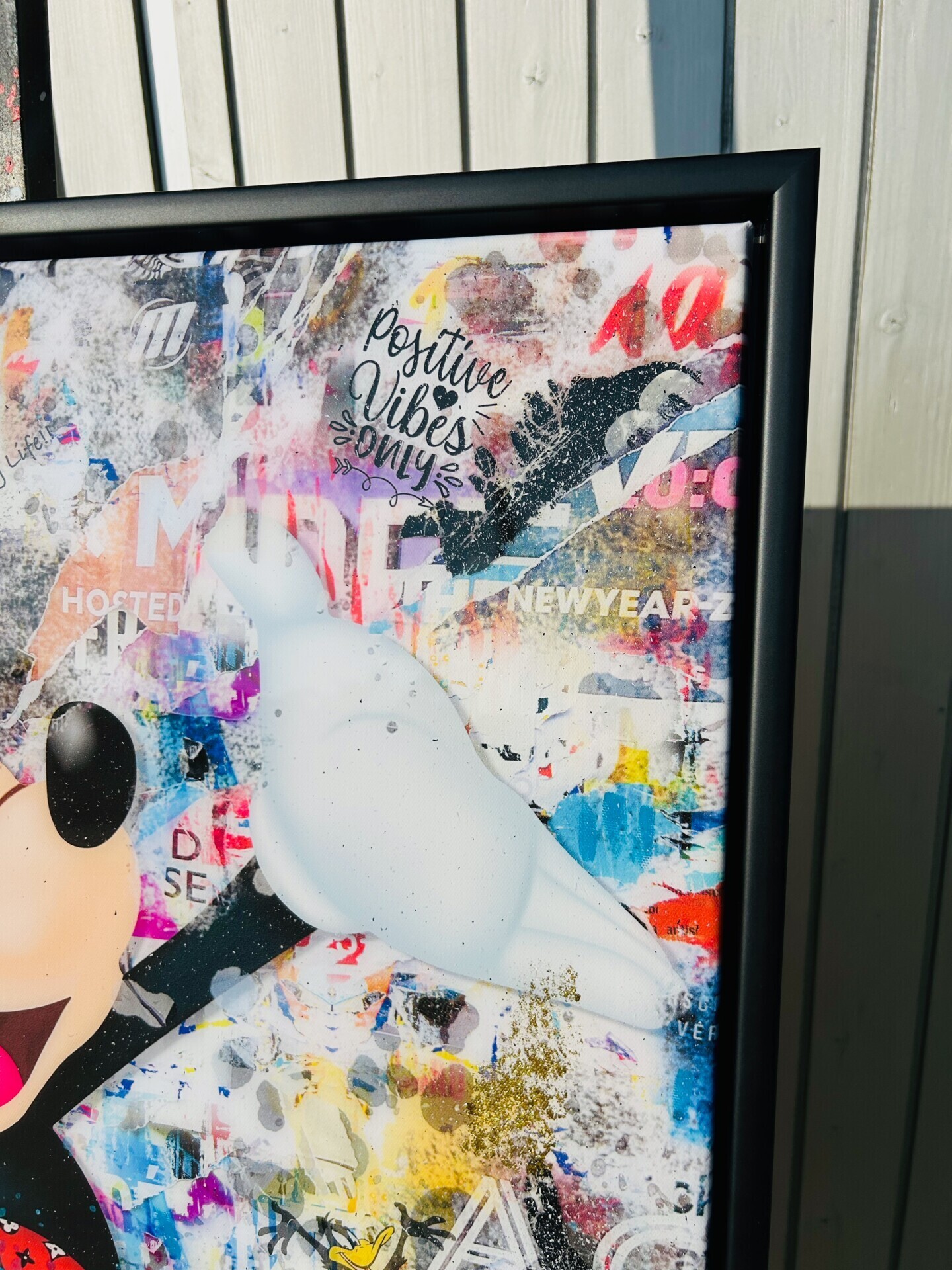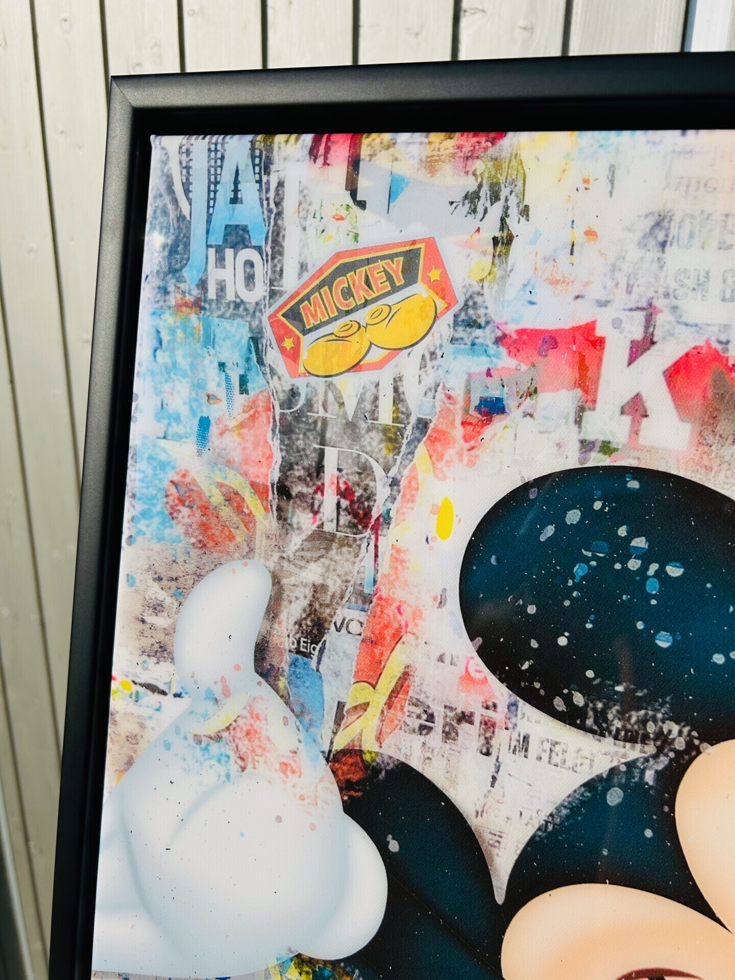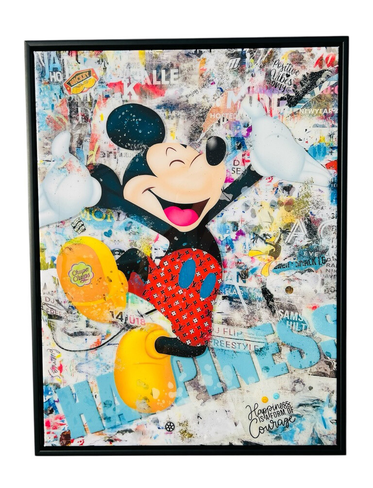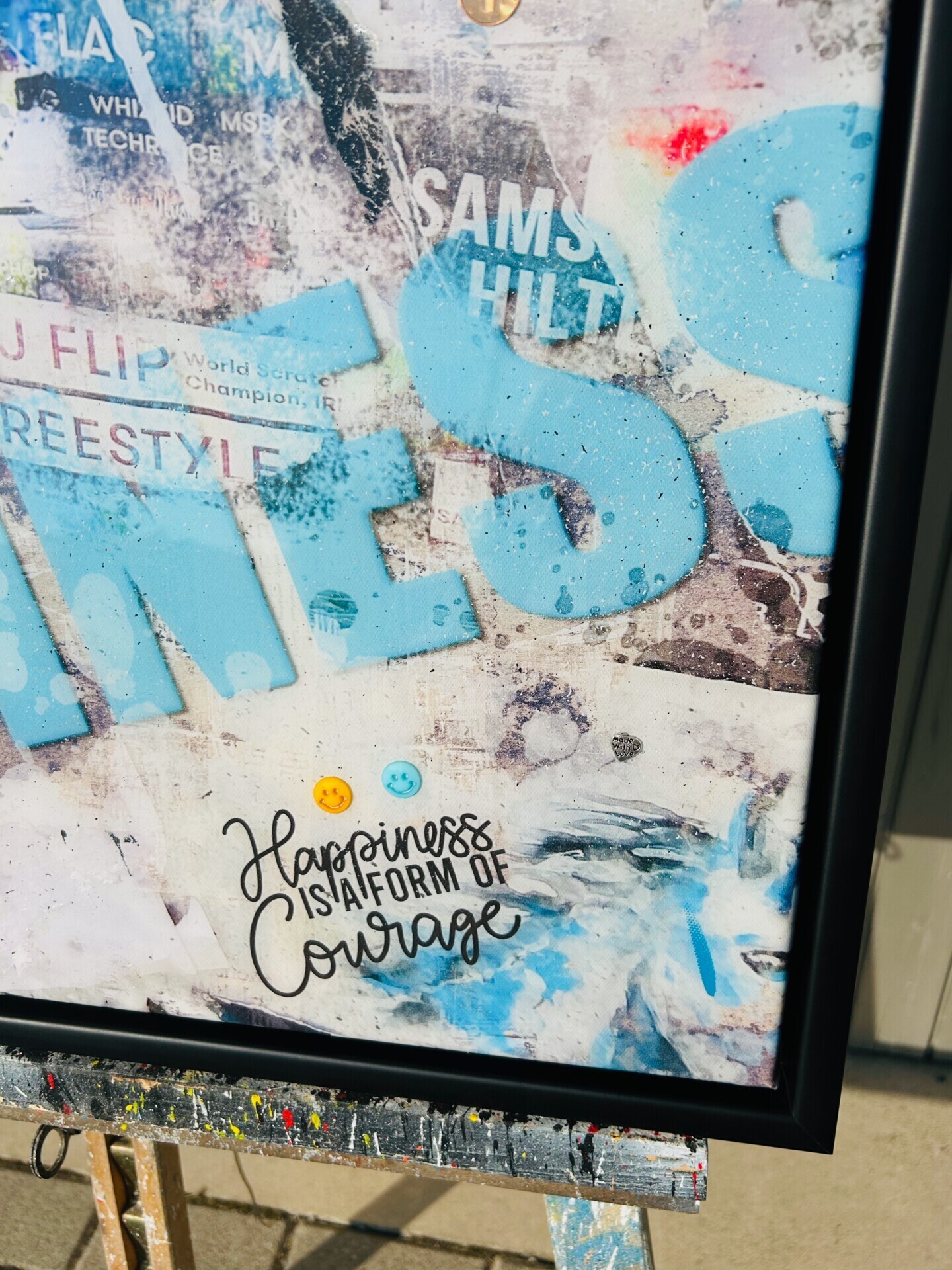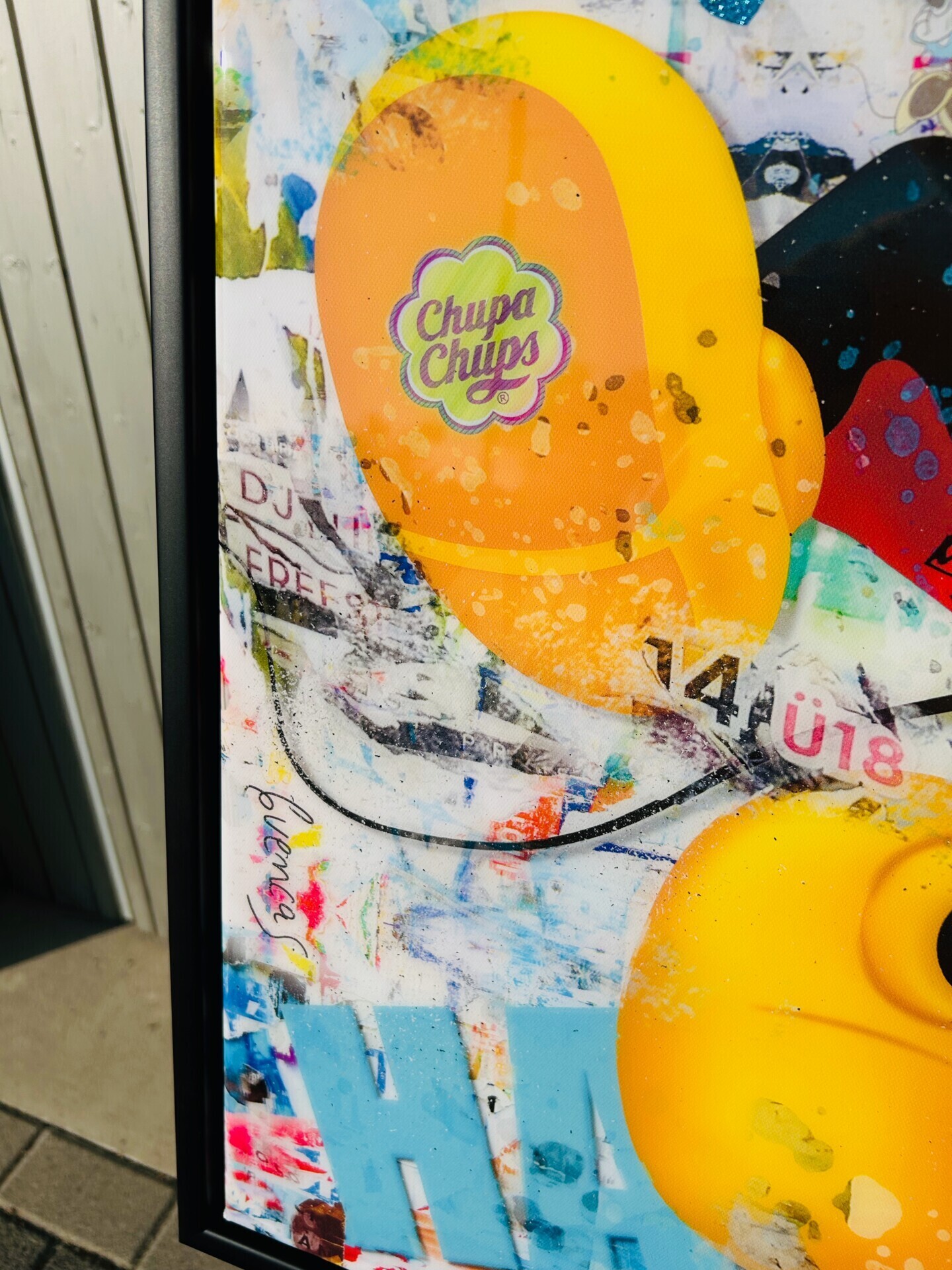 El distintivo estilo Pop Art de Cuencas se caracteriza por su ingenioso uso de técnicas de collage. Reúne magistralmente fragmentos de carteles y anuncios antiguos, combinándolos a la perfección en sus composiciones. Para agregar profundidad y textura a sus obras, Cuencas emplea una amplia gama de medios que incluyen pintura en aerosol, brillantina, acrílicos, piedras, lentejuelas, recortes de metal y telas. Su proceso creativo es un viaje táctil y visceral, donde pega, rocía y refina con confianza sus motivos en composiciones cautivadoras. El toque final es una generosa aplicación de barniz epoxi, que sella la superficie con un acabado lustroso que imparte un cautivador efecto de "alto brillo".