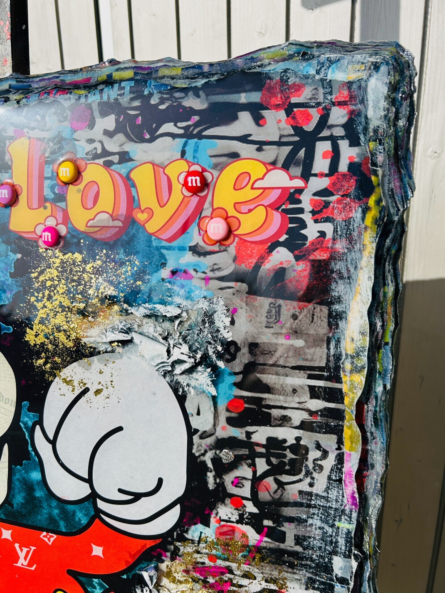 Von Hand veredelt mit Glitzer, Acryl, Spray und und anderen Materialien.