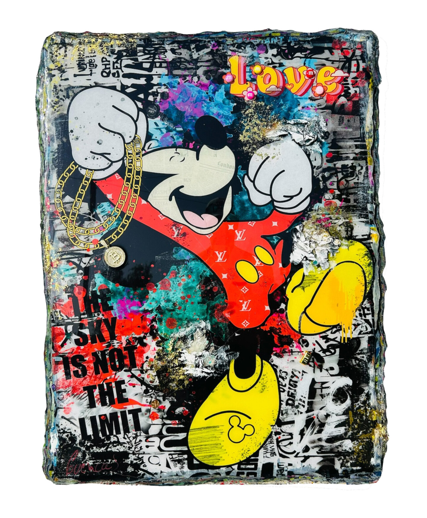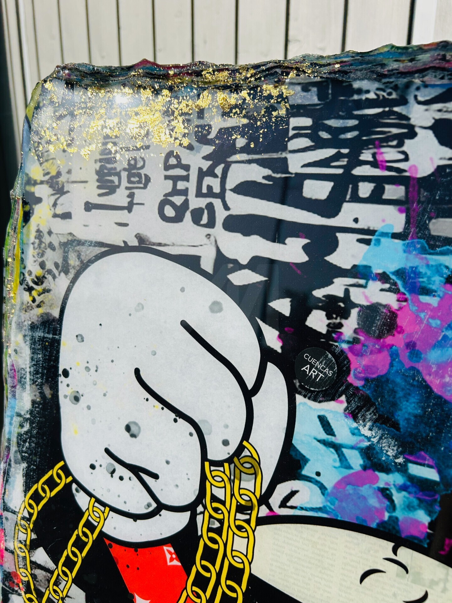 El distintivo estilo Pop Art de Cuencas se caracteriza por su ingenioso uso de técnicas de collage. Reúne magistralmente fragmentos de carteles y anuncios antiguos, combinándolos a la perfección en sus composiciones. Para agregar profundidad y textura a sus obras, Cuencas emplea una amplia gama de medios que incluyen pintura en aerosol, brillantina, acrílicos, piedras, lentejuelas, recortes de metal y telas. Su proceso creativo es un viaje táctil y visceral, donde pega, rocía y refina con confianza sus motivos en composiciones cautivadoras. El toque final es una generosa aplicación de barniz epoxi, que sella la superficie con un acabado lustroso que imparte un cautivador efecto de "alto brillo".