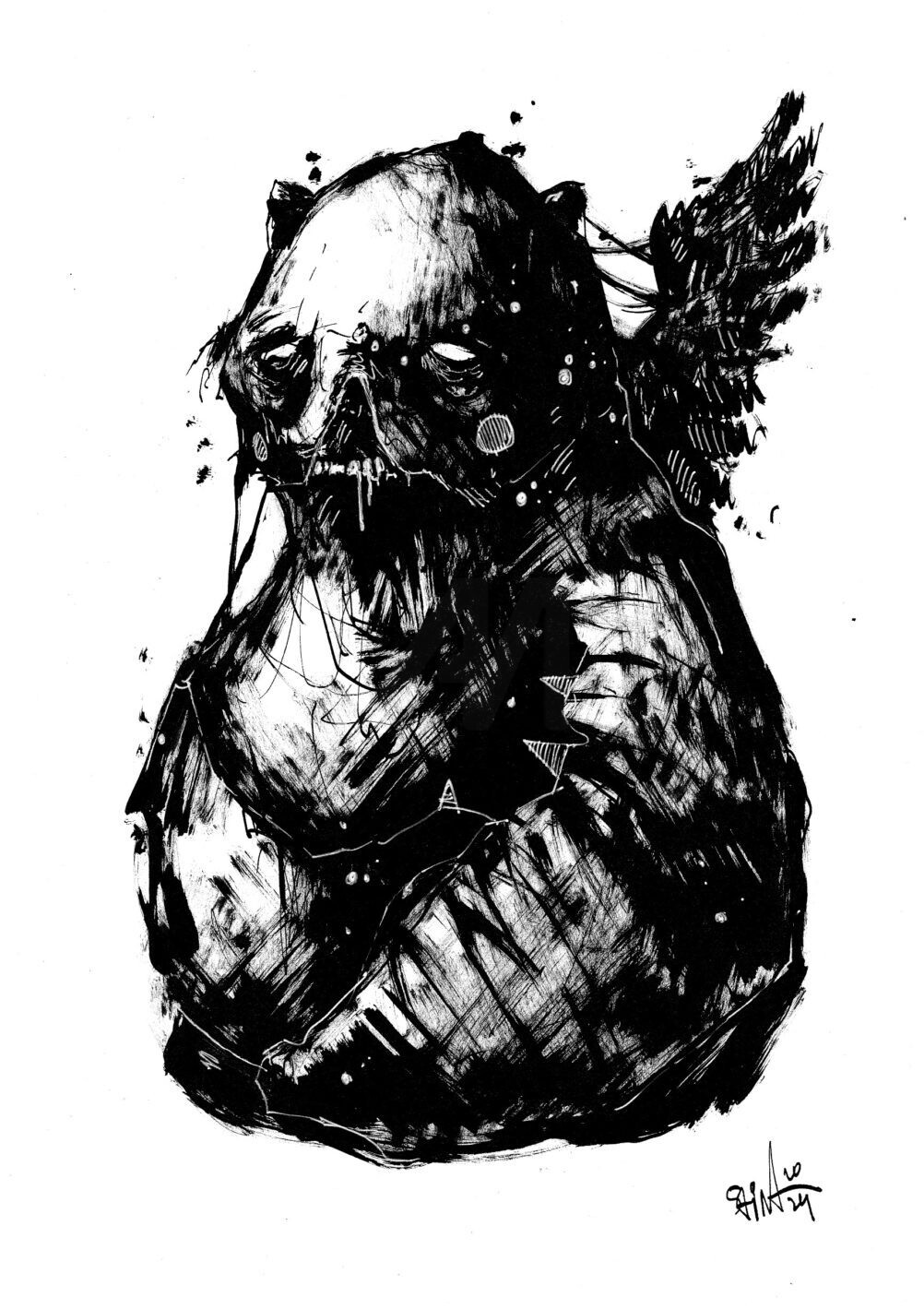 Мрачная и изуродованная вселенная в работах образовалась как реакция на внешние факторы в 2022 году и навеяна вкусами на которые повлияли хоррор и фантастические кинофильмы 1980-90х, комиксы, анимационные фильмы и тяжелая музыка. Почти все образы рождаются спонтанно и случайно без предварительного плана и подготовки, не несут никакой идеи и смысловой нагрузки, в 95% случаев я просто транслирую что то из головы на бумагу или холст.