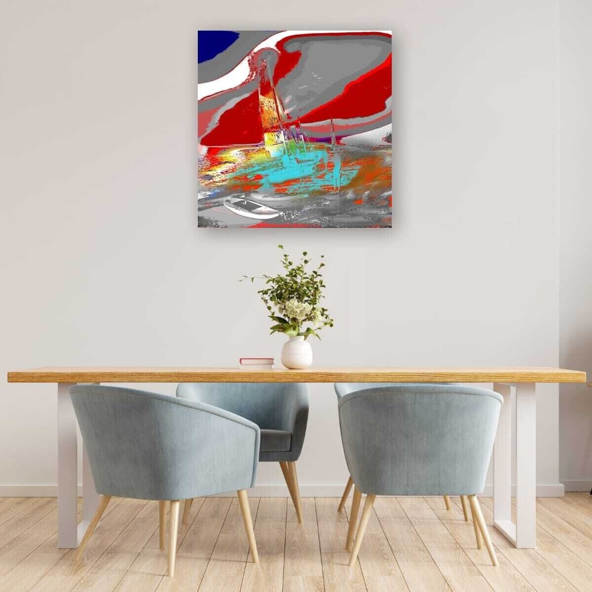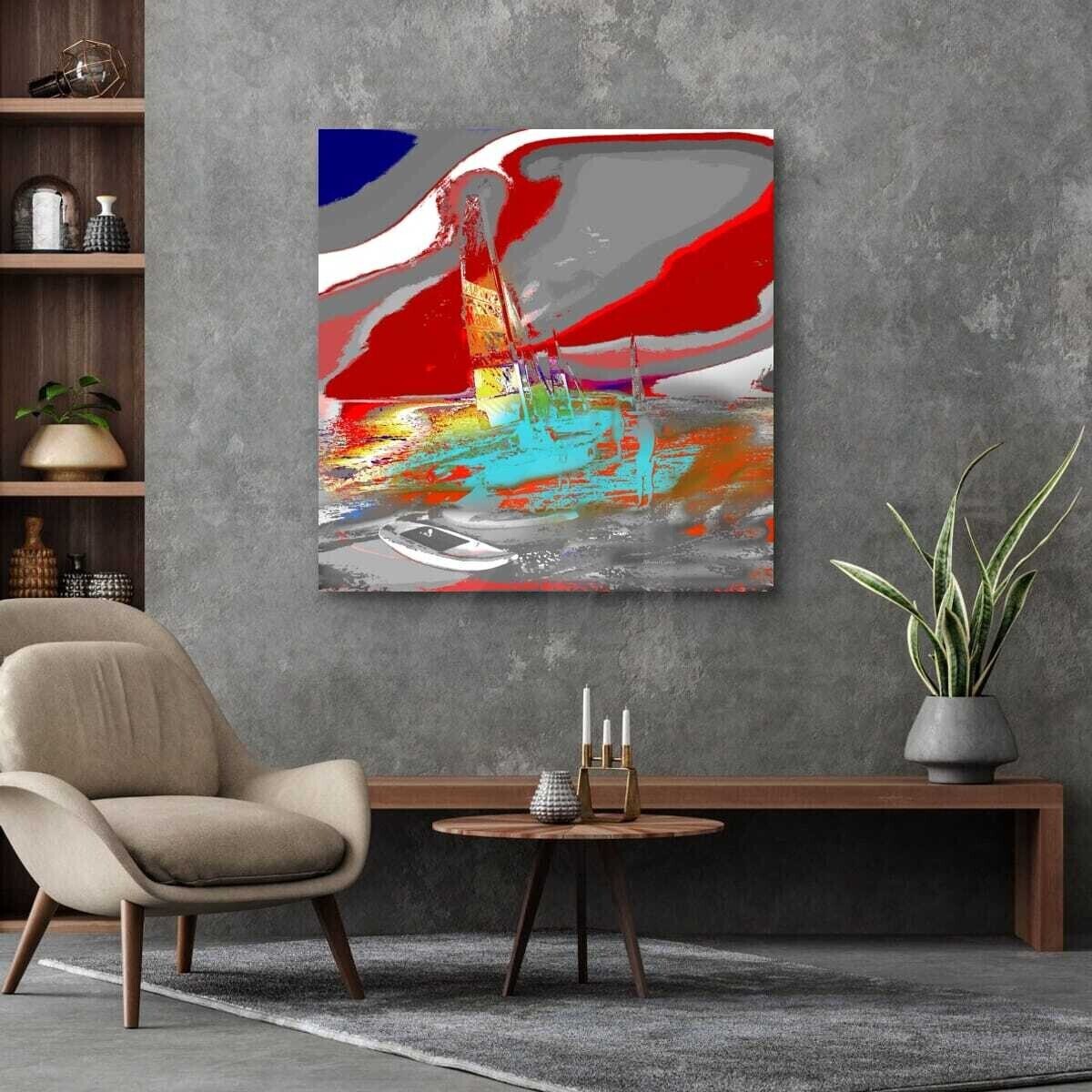 This abstract artwork presents a dynamic interplay of colors, where vibrant hues of red, blue, and turquoise converge to create a surreal seascape. Sailing vessels emerge from the swirling patterns, their sails catching the light in a dance of reflection and movement. The ocean's surface shimmers with a blend of colors, evoking a sense of adventure and freedom. This piece invites contemplation and adds a striking focal point to any space, making it a captivating addition to your collection.
