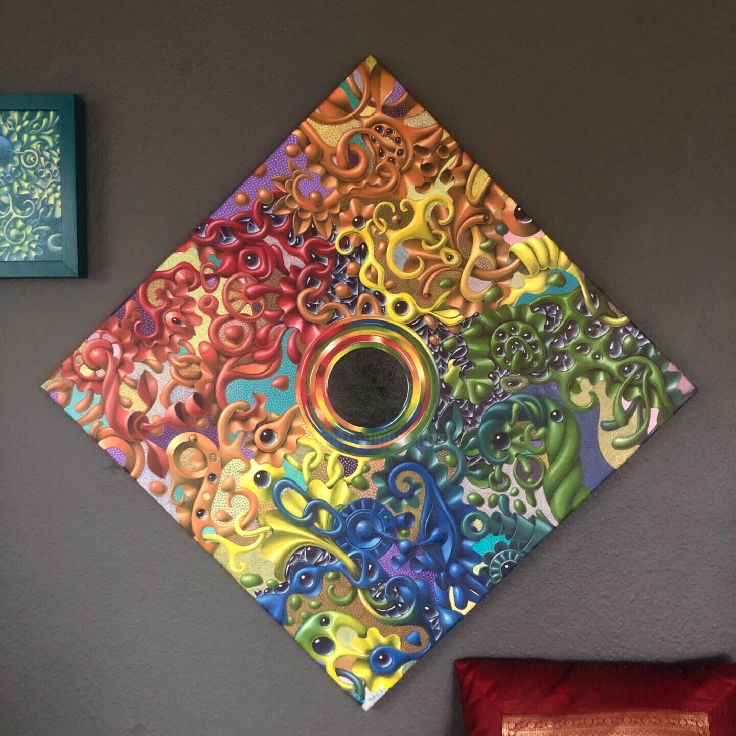 Most of her paintings are unplanned. They are born from meditative states, where silence opens the door to vivid inner visions. These sensations—often too complex or subtle to express in words—flow naturally through her hands and onto the canvas. Once the process begins, it becomes almost automatic, intuitive. The final image remains a mystery until the very last drop of paint falls into place.
