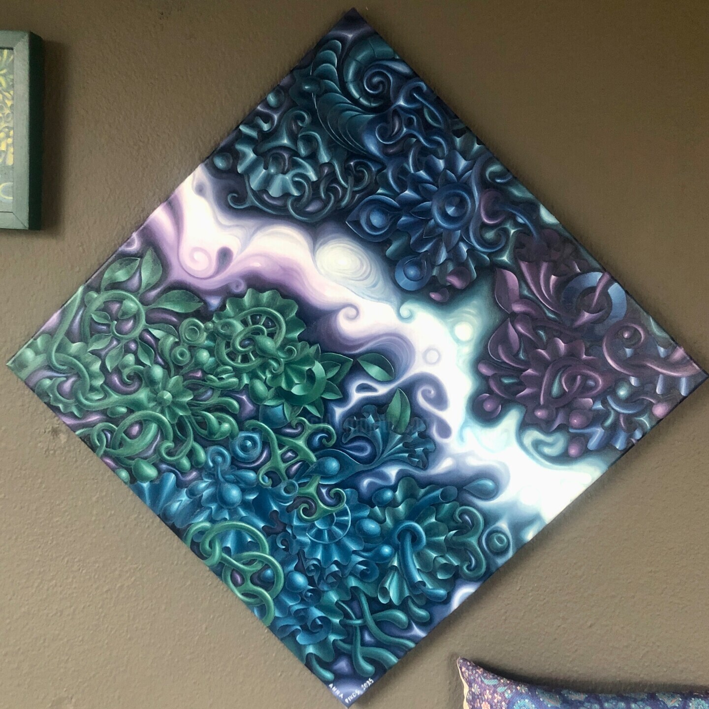 Most of her paintings are unplanned. They are born from meditative states, where silence opens the door to vivid inner visions. These sensations—often too complex or subtle to express in words—flow naturally through her hands and onto the canvas. Once the process begins, it becomes almost automatic, intuitive. The final image remains a mystery until the very last drop of paint falls into place.