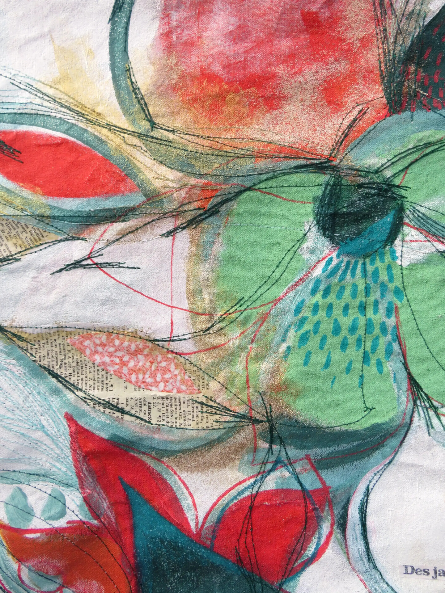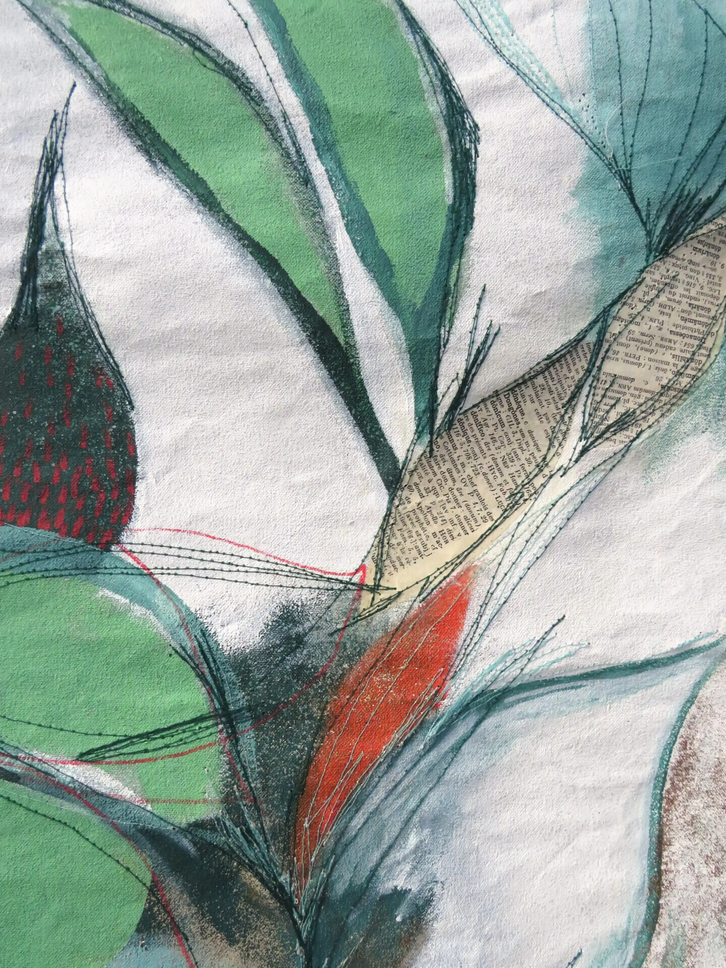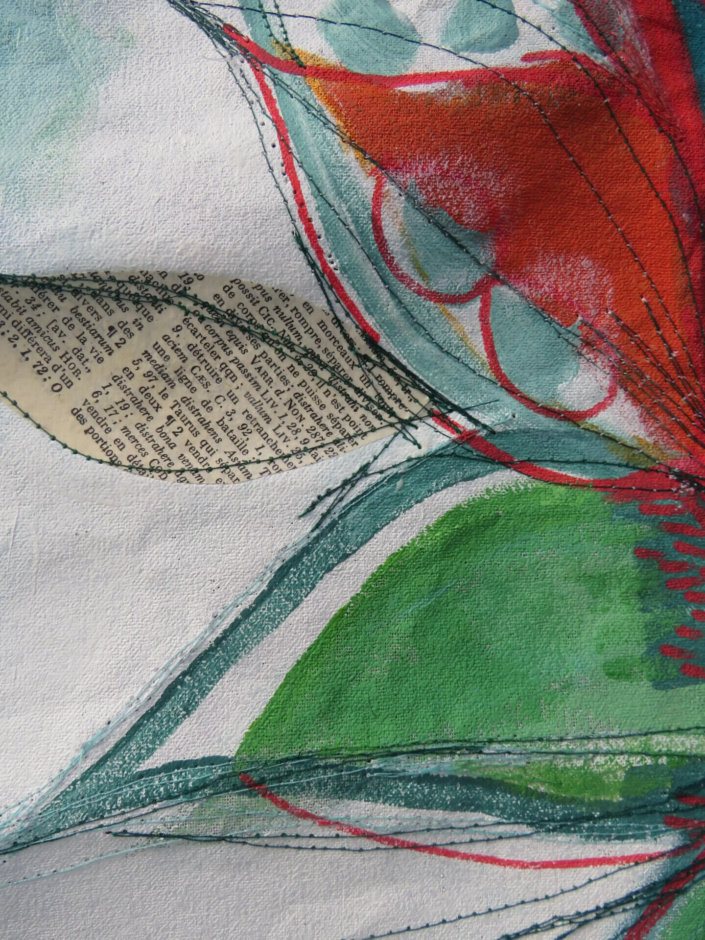 Mon travail explore la mémoire, la nature et les émotions à travers des techniques mixtes (mixed media). Jecrée des œuvres sensibles et poétiques mêlant collage, peinture, couture sur papier et fragments de textes anciens.