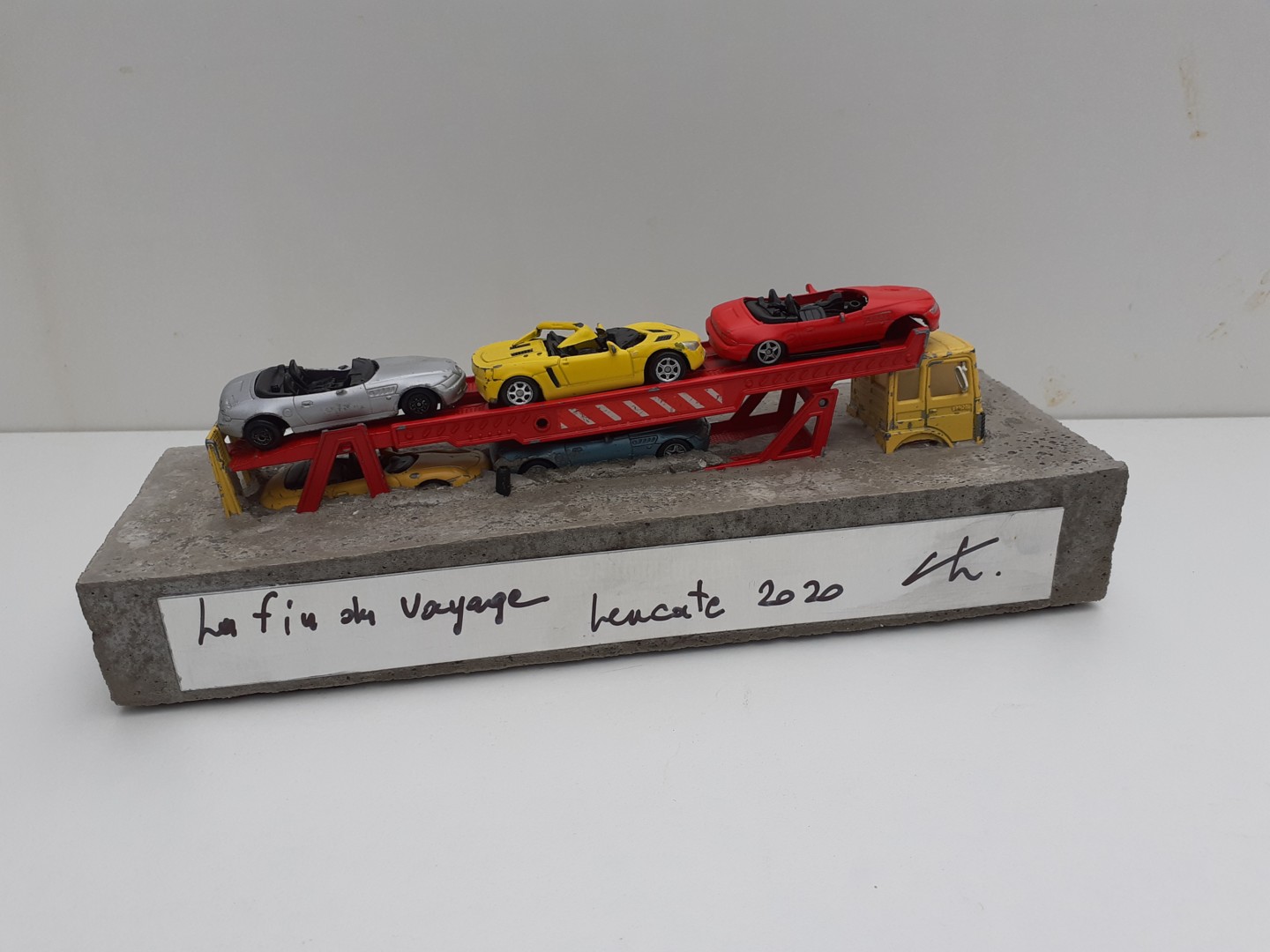 dans le béton : instruments de musique, autos miniatures , modules informatiques.