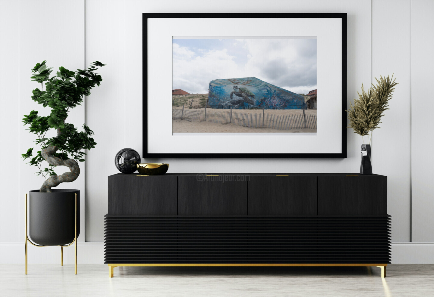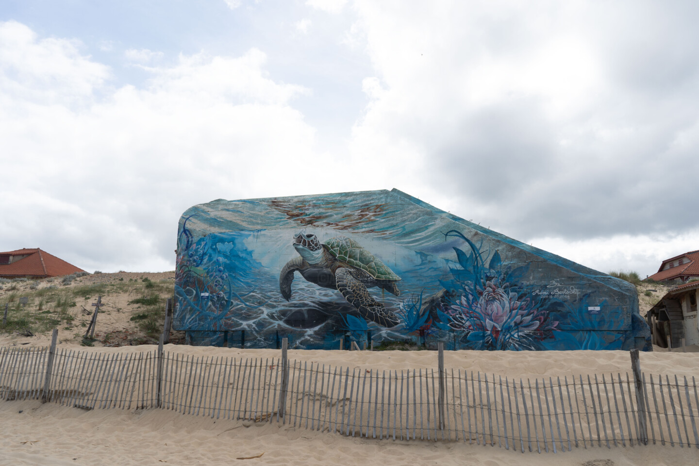 Sur la plage de Vieux-Boucau, là où le vent sculpte les dunes et où l’océan murmure des souvenirs de sel, un blockhaus repose, à demi enfoui dans le sable, comme un géant oublié. Jadis symbole de guerre, il est aujourd’hui couvert de silence, rongé par le temps, adouci par la lumière. Sur l’un de ses flancs rugueux, une tortue a été dessinée — non...