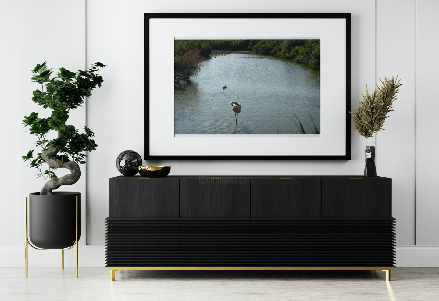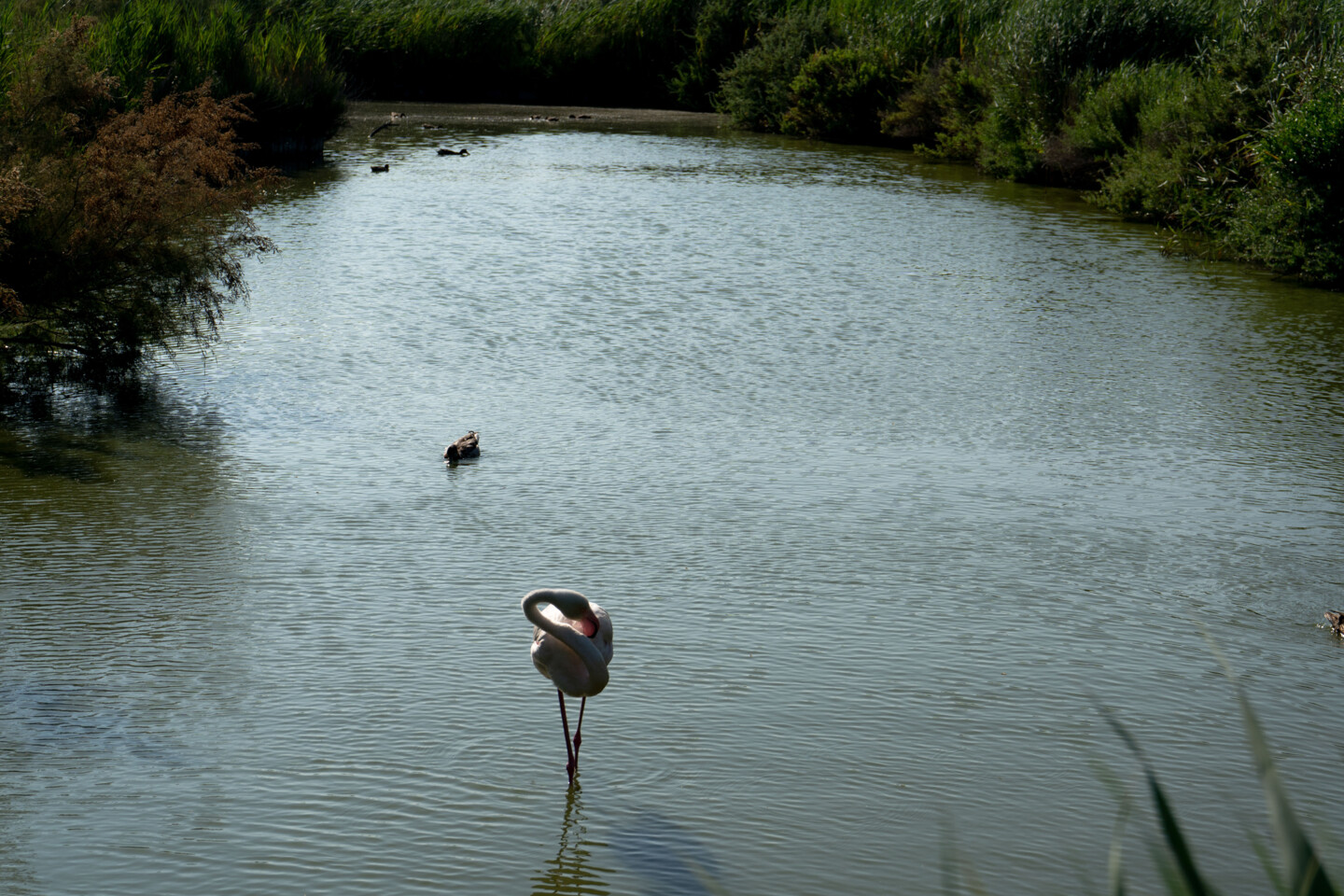 Le flamant, symbole de la région, se distingue par sa silhouette gracile et ses couleurs vives qui contrastent magnifiquement avec les teintes douces des rizières et des reflets de l'eau. Dans cette scène, l'oiseau semble se plonger dans un moment de sérénité, prenant soin de son plumage tout en faisant onduler son cou en une courbe harmonieuse. Cette posture ne montre pas seulement la délicatesse de l'animal, mais évoque également une danse silencieuse, une poésie visuelle au cœur de la nature.