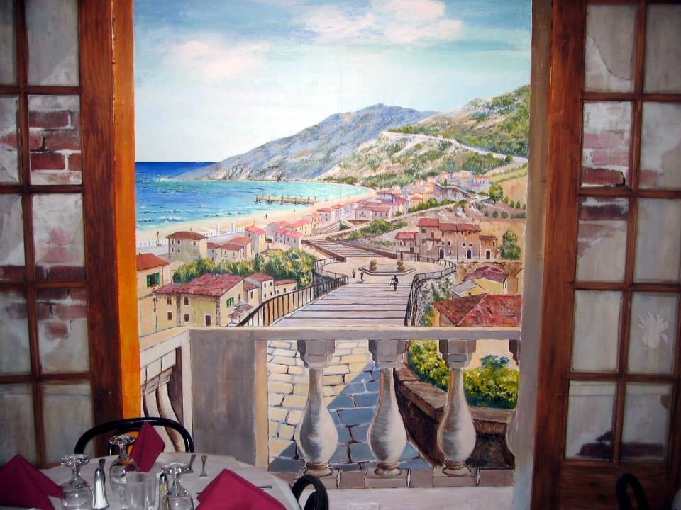 Trompe l'oeil di finta finestra con veduta di paesaggio marittimo italiano. About this artwork: Classification, Techniques & Styles. Acrylic. Paint using traditional pigments mixed with synthetic resins. Technic Painting. Painting is an art form of painting on a surface by aesthetically applying colored fluids. Painters represent a very personal expression...