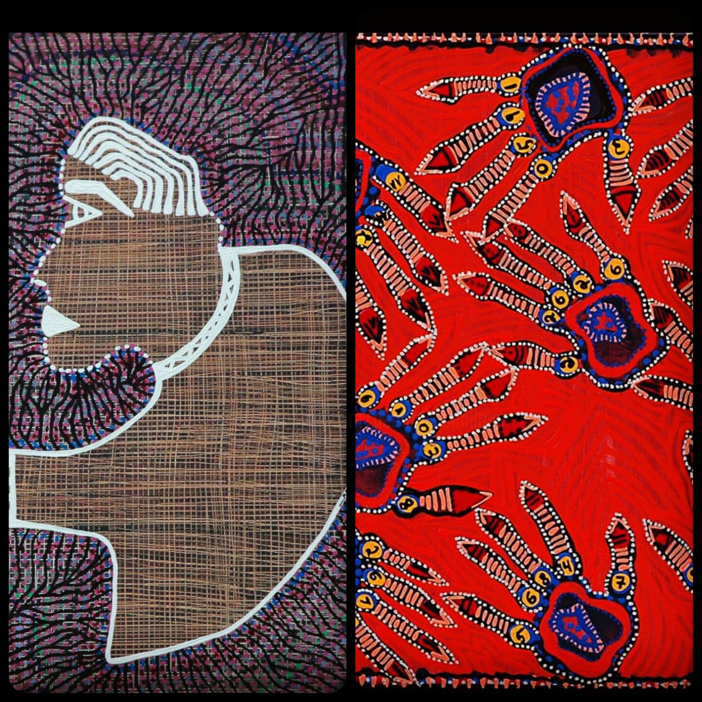 She brought the acrylic into her world of lines and dots; she went back to painting women and masks that appeared in her childhood paintings and flooded them with lines and dots without separating body and background.