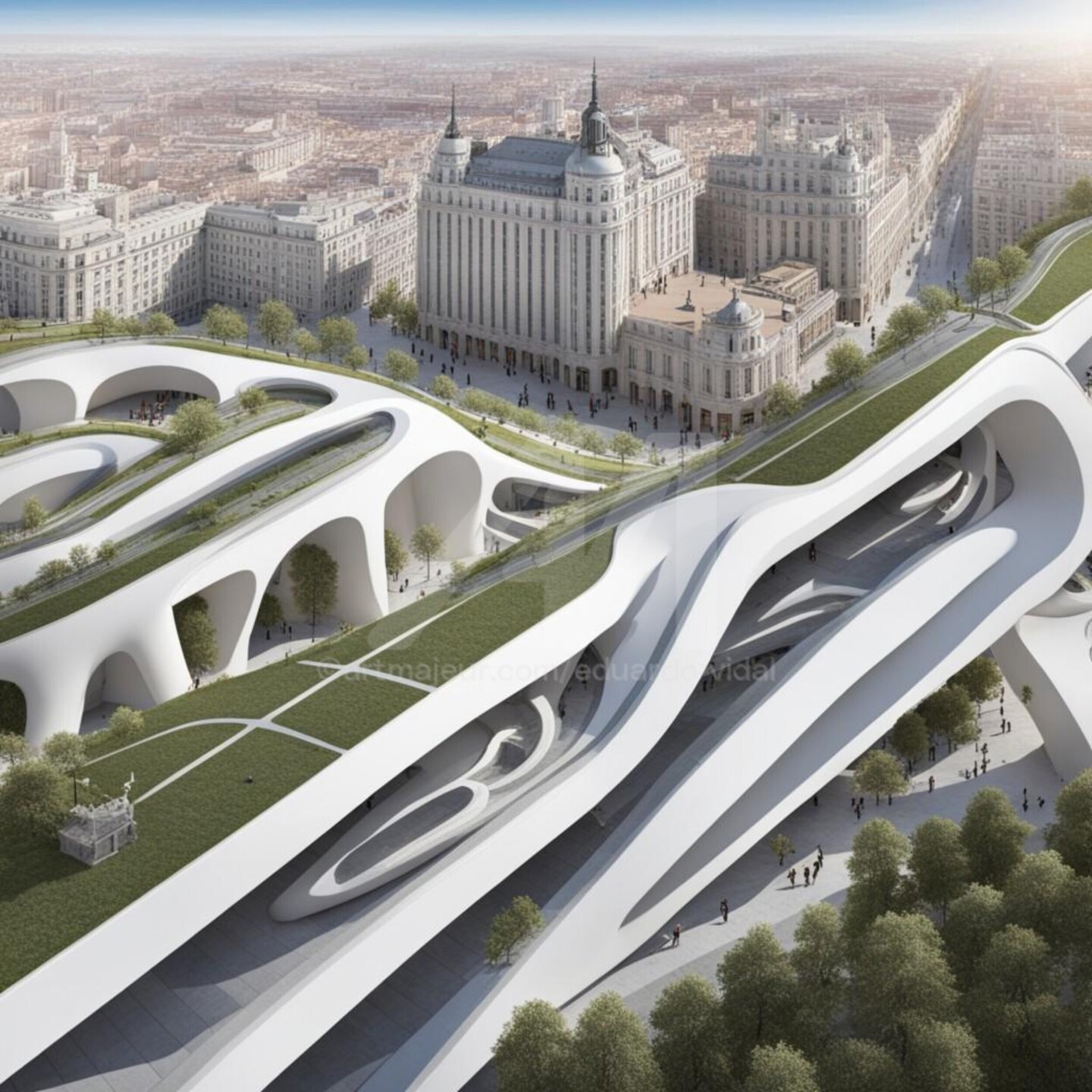 This work describes well what Madrid will be like, the capital city of Spain, outstanding parks in the city. A futuristic trend will change direction urban architecture.