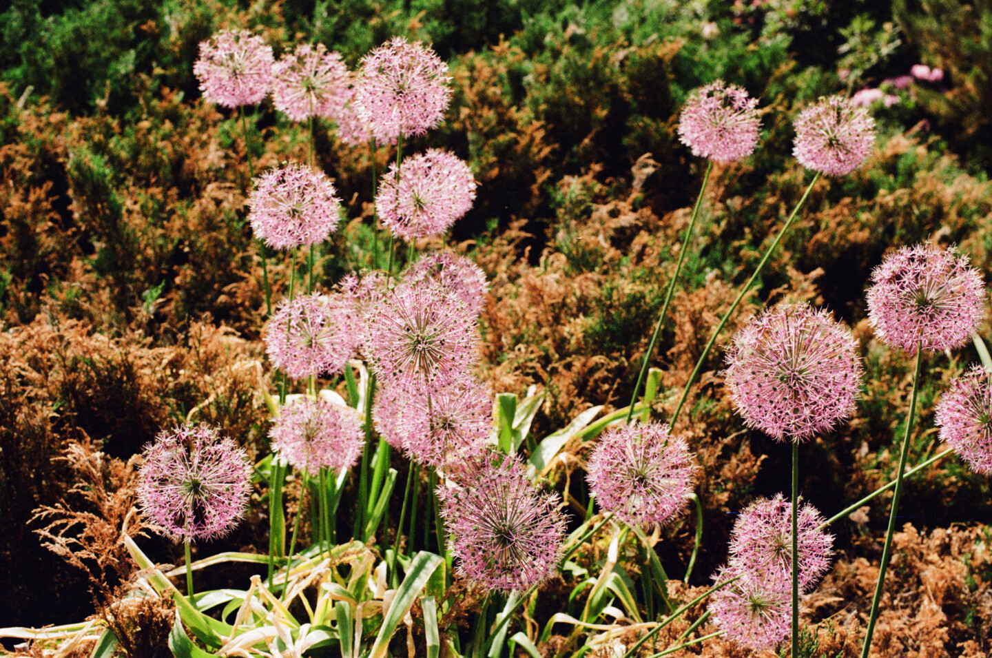 Sanat resim bankasıAnalog Color Film PhotoHorizontal PictureHot SummerPink Rose FlowersFlowering Ornamental Onion