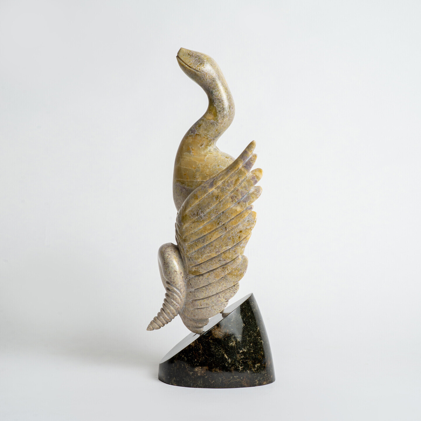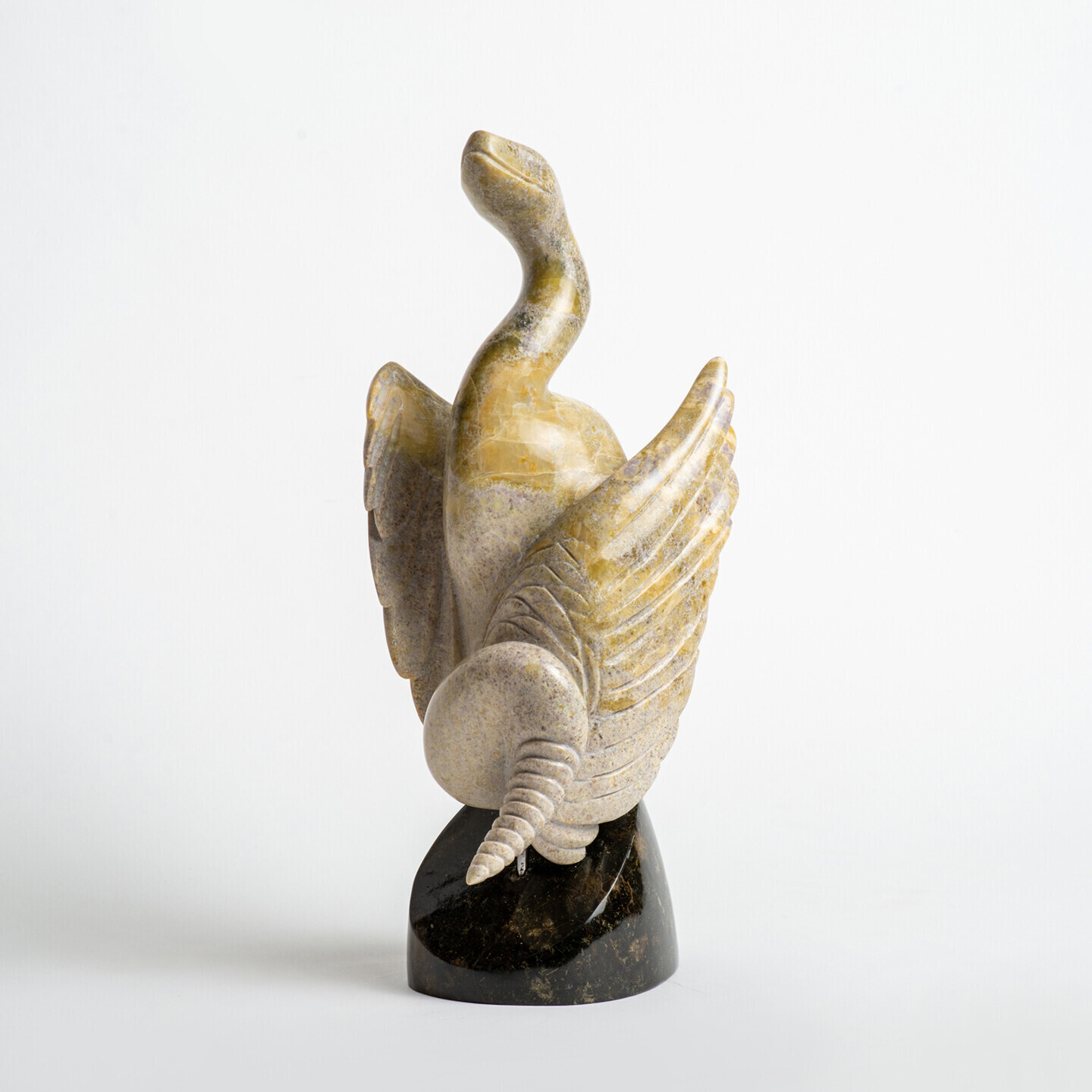 Esta inceible obra, se destaca por la complejidad del diseño, elaborado en serpentinta verde clara, con tintes marrones y detalles de textura y brillos en distintos sectores, combinan a la perfección con su base de Harzburgita, de intenso color verde y zonas iridiscentes. Las curvas y calados logrados en esta escultura, denotan la habilidad del artista,...
