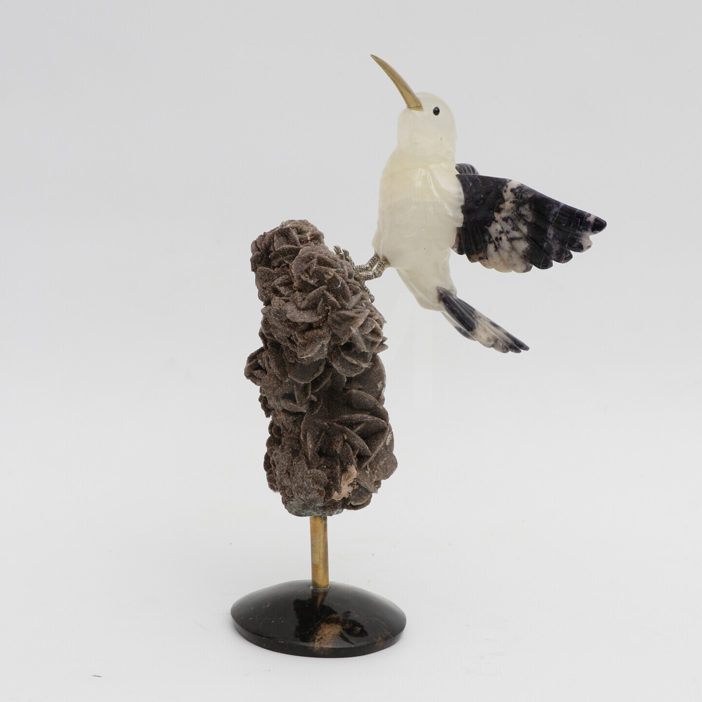 El cuerpo de cuarzo blanco simboliza la pureza y la esencia vital, mientras que las alas de fluorita representan los cambios de luz y color en el horizonte desértico. La rosa del desierto como base conecta el ave con la tierra árida, recordando que de los ambientes más hostiles también surgen formas de belleza inesperada.