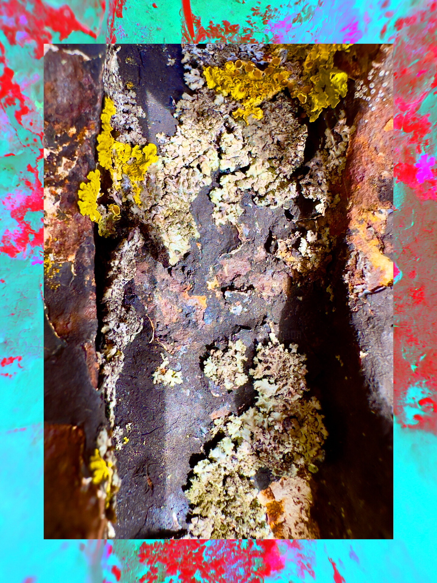 Die Darstellung von Baumrinden oder Felsen mit lebendigen Farben schafft eine interessante Spannung zwischen der natürlichen Struktur und der abstrakten Farbgebung. Die Verwendung von kräftigen Farben, wie Türkis und Rot, in Kombination mit natürlichen Brauntönen, erzeugt einen dynamischen Kontrast. Die feinen Details der natürlichen Oberflächen werden durch die Makroaufnahme hervorgehoben. Das Werk fängt die organischen Formen ein und präsentiert sie in einem neuen, künstlerischen Licht. Es zeigt, wie Kunst und Natur harmonieren können, indem es auf subtile Weise die Schönheit und Komplexität der natürlichen Welt betont. Diese Serie lädt den Betrachter ein, die oft übersehenen Details der Natur zu schätzen. Sie wirft auch Fragen zur Beziehung zwischen Mensch und Natur auf, indem sie natürliche Elemente in einem künstlerischen Kontext darstellt. Die farbigen Ränder des Bildes verleihen dem Kunstwerk eine zusätzliche Dimension von Tiefe und Intensität.