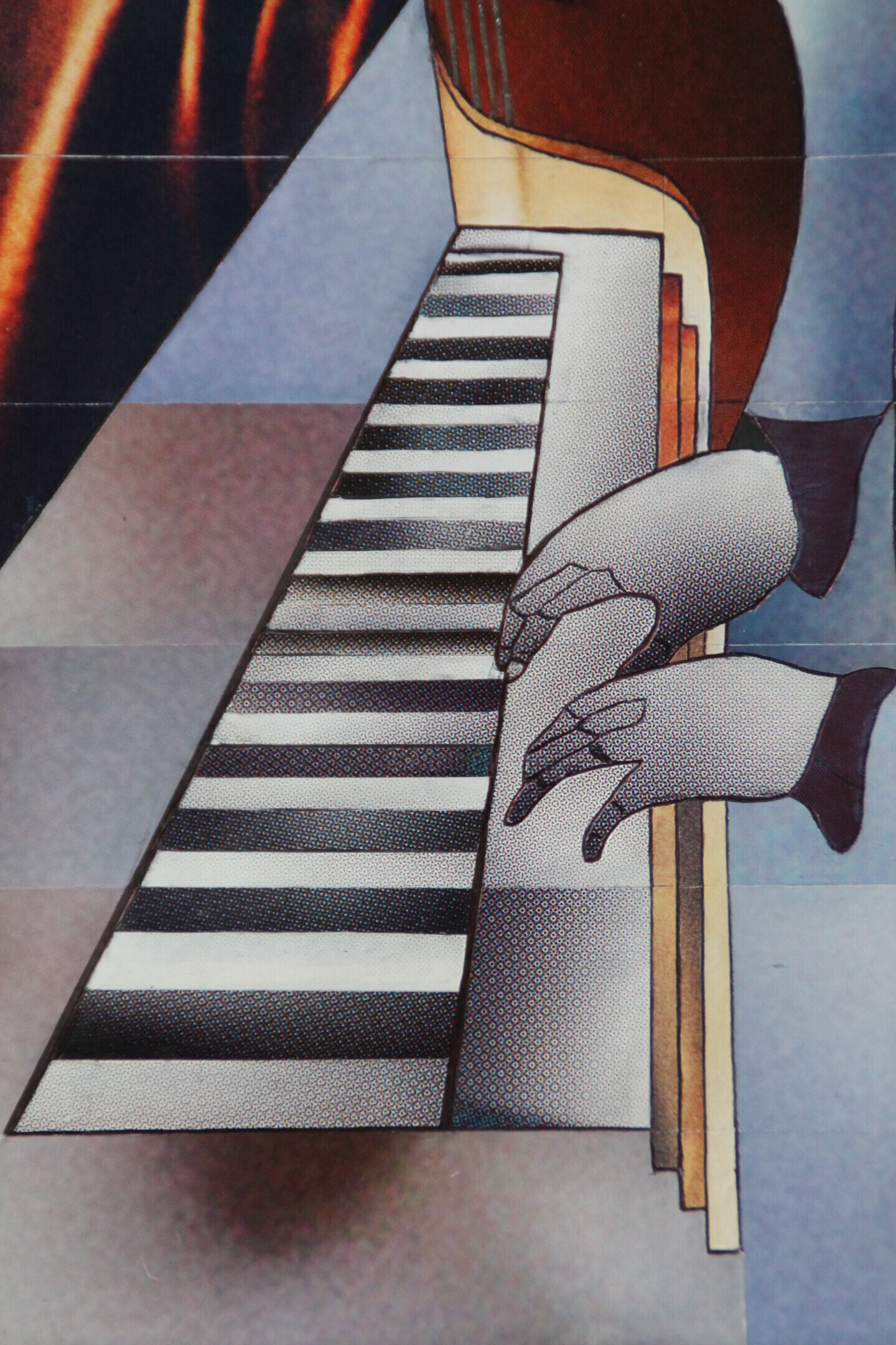 Le travail de COLLAGE effectué par l'artiste semble unique par le fait qu'il ne découpe pas de figurines dans les magazines, mais il fait son propre dessin sur un support rigide et se servira