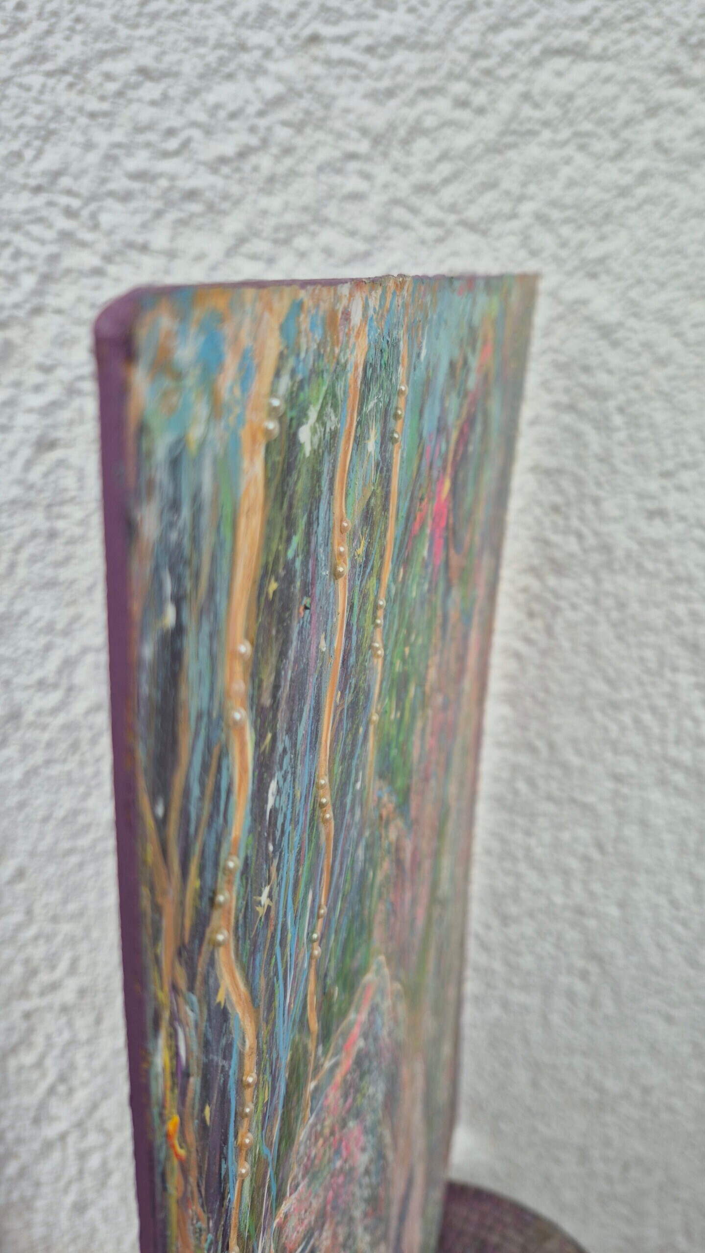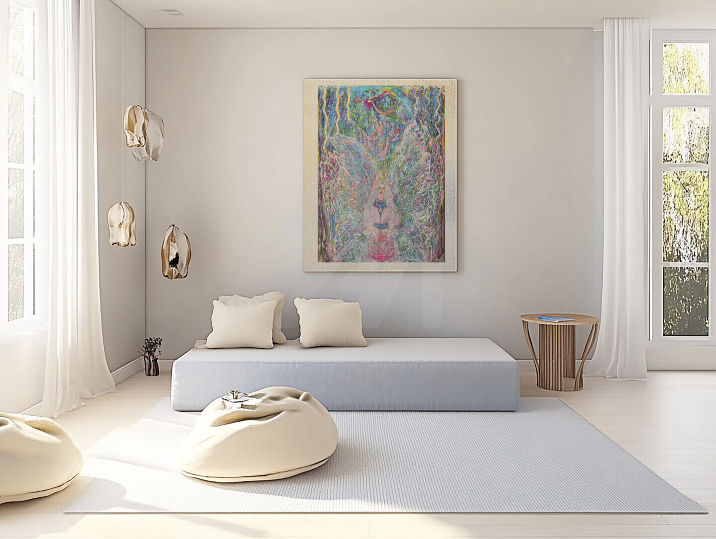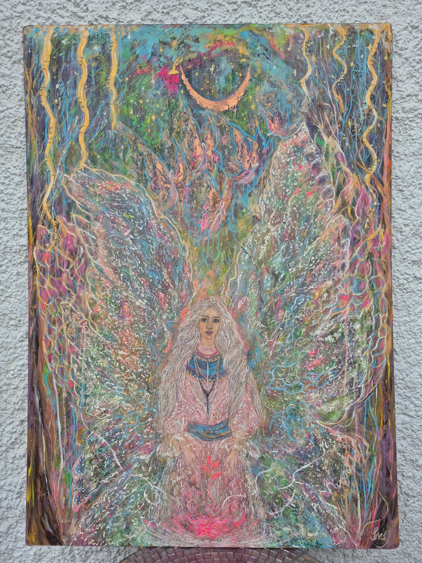 This painting depicts a young woman fairy with long, flowing blonde hair. She has vibrant, abstract butterfly wings . Above her head, a crescent moon and stars shimmer, adding a touch of celestial wonder. Blending elements of symbolism and abstraction, the artwork merges reality with the mystical. Rich, saturated colors fill the composition, creating an atmosphere of magic, spirituality, and ethereal beauty.