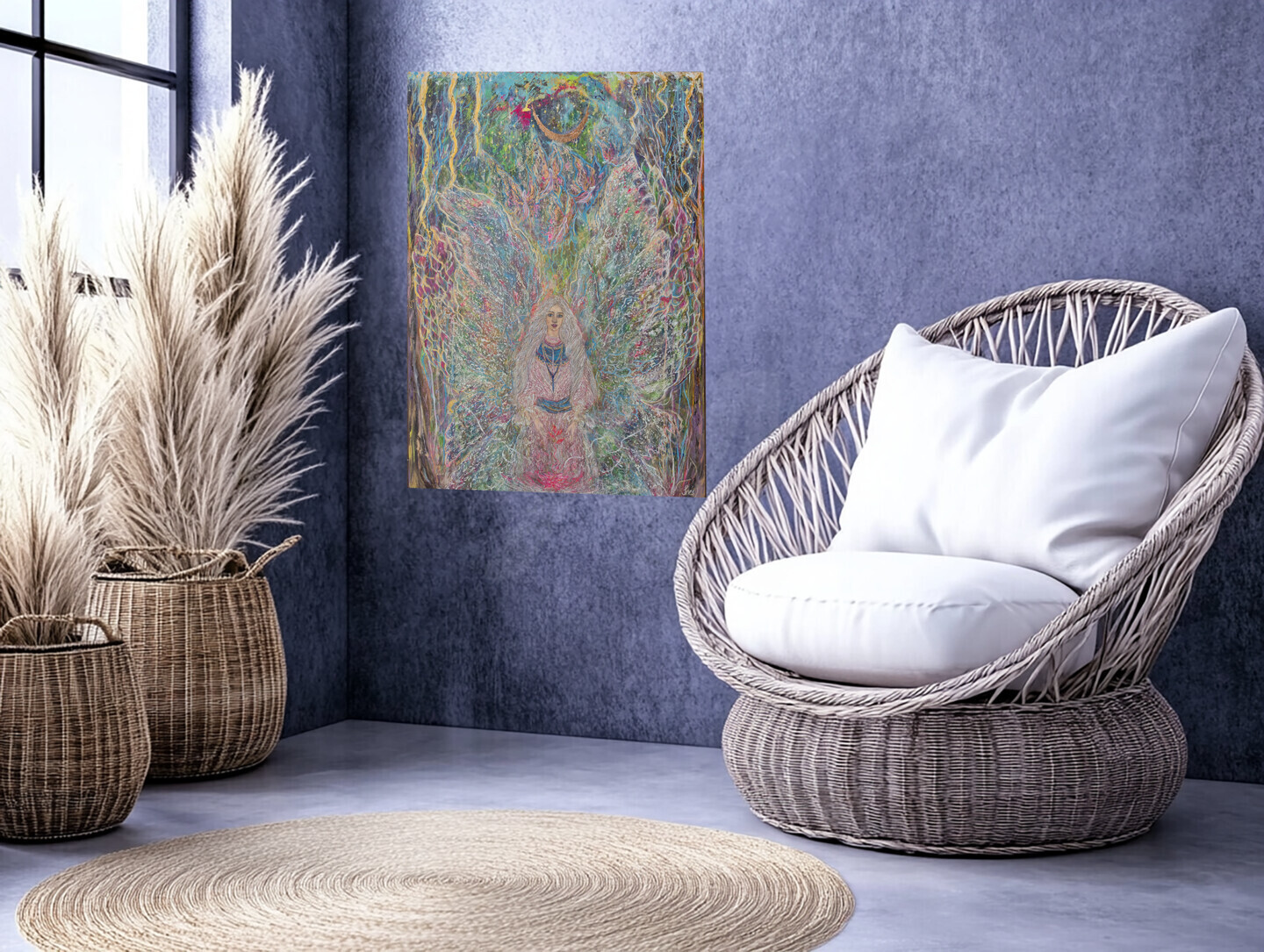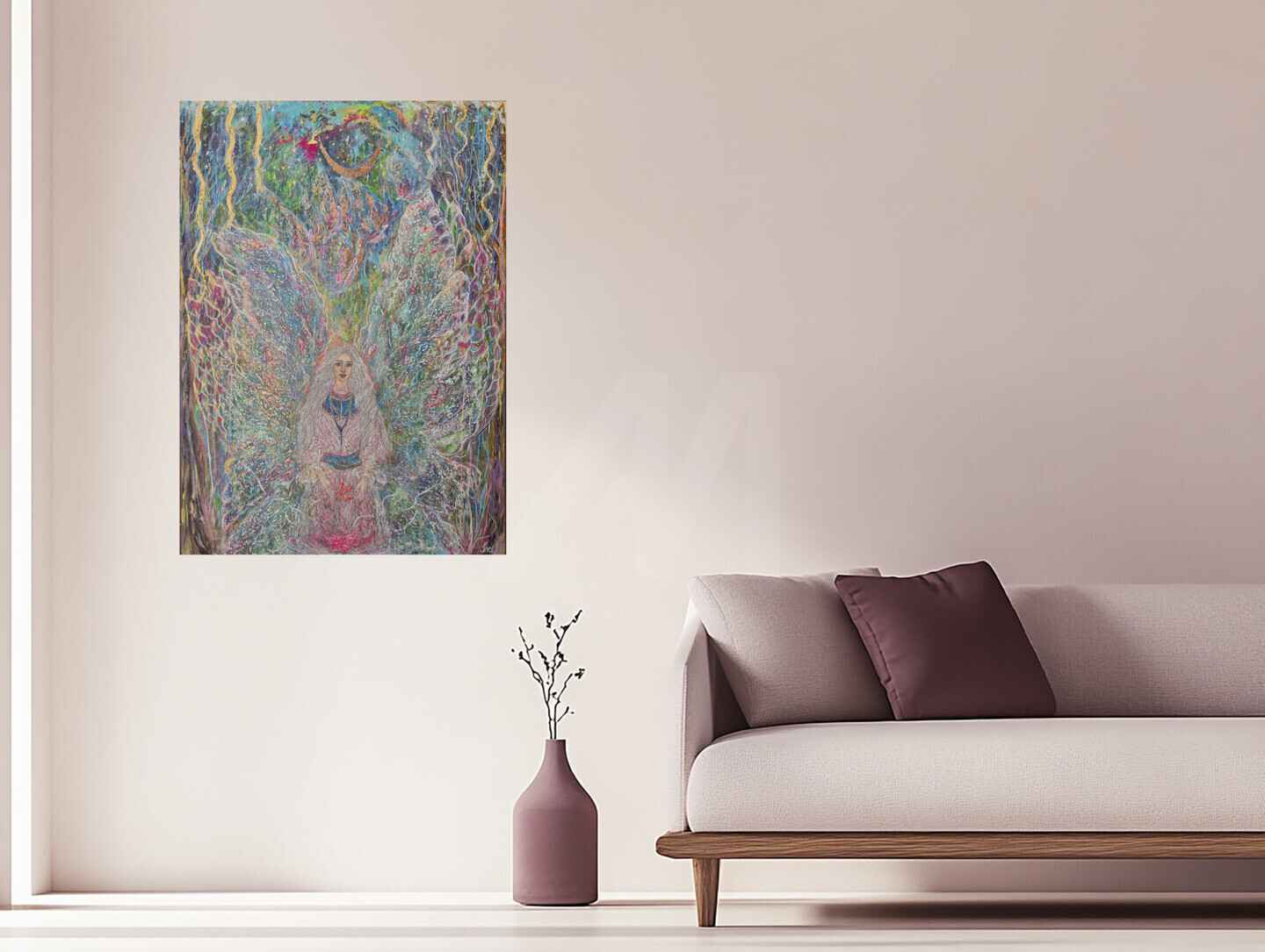 This painting depicts a young woman fairy with long, flowing blonde hair. She has vibrant, abstract butterfly wings. Above her head, a crescent moon and stars shimmer, adding a touch of celestial wonder. Blending elements of symbolism and abstraction, the artwork merges reality with the mystical. Rich, saturated colors fill the composition, creating...