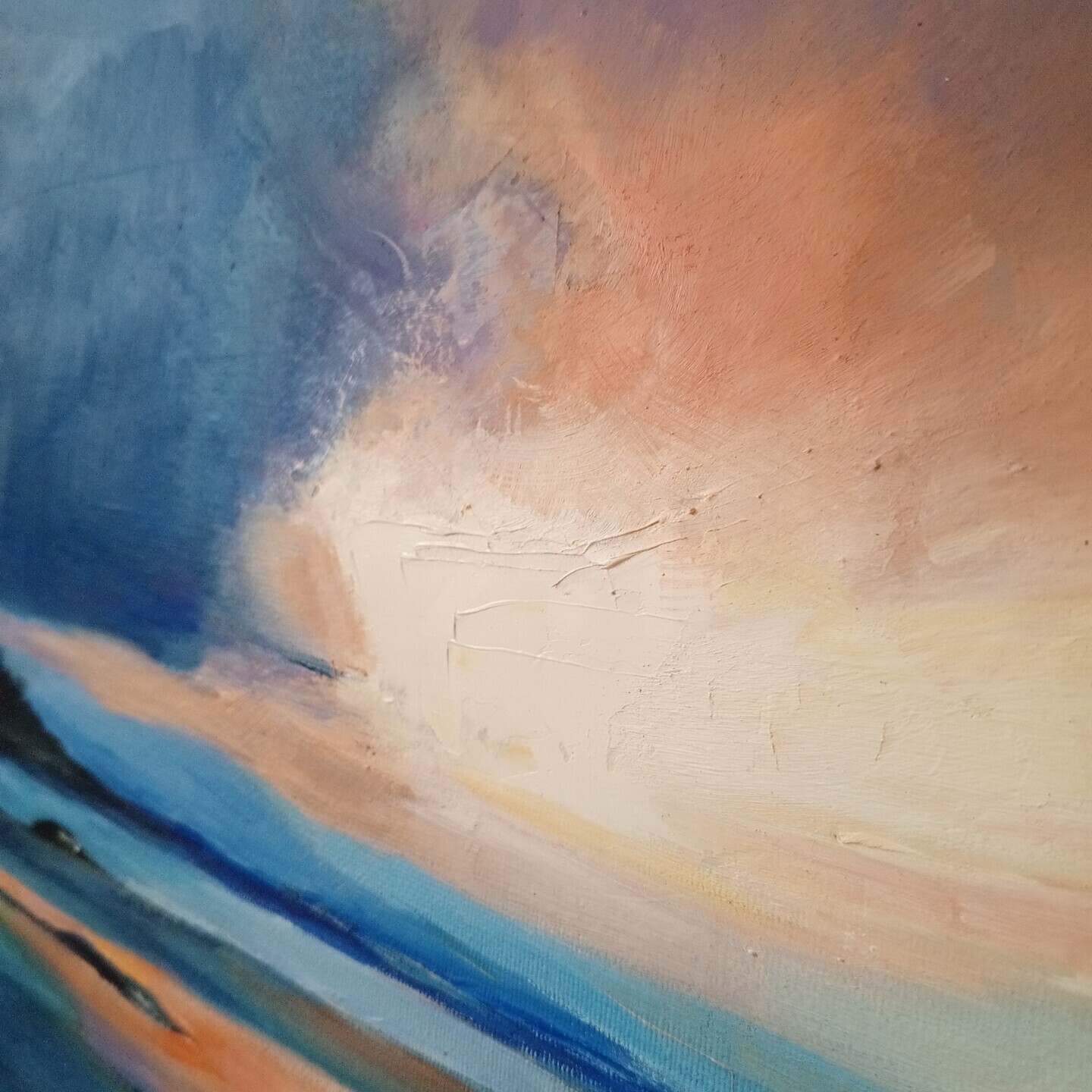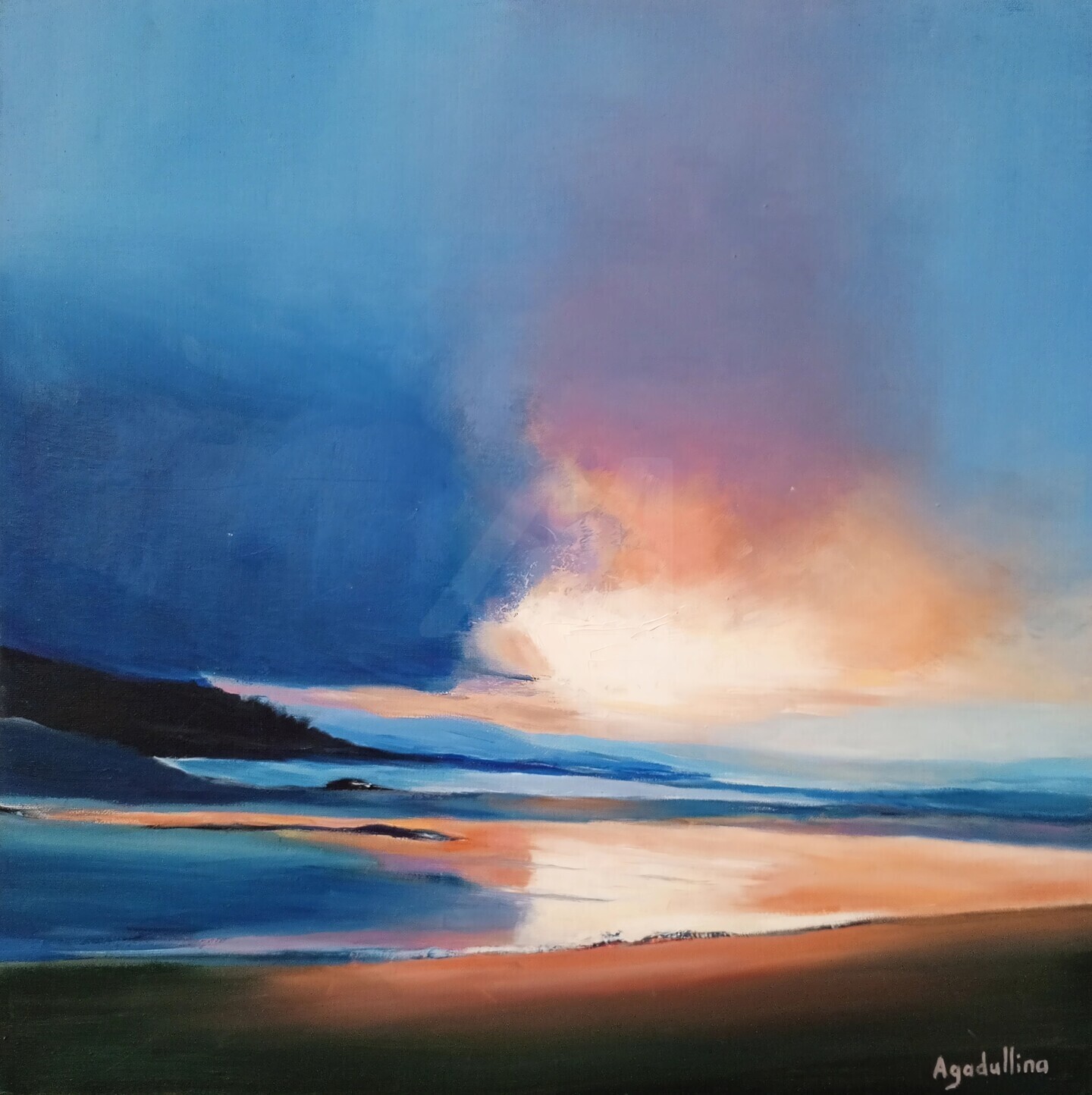 I paint not a “view from the shore,” but a state of being—what I experience here and now. Sometimes it’s dense blue and violet masses of cloud; sometimes it’s thin peach bands of sunset, and between them a ray that finds its way. It’s important to me to leave the viewer space to breathe: to be able to stand inside my landscapes, hear the murmur, feel the freshness, and take away a little inner quiet. If one of my paintings has given you this feeling, then we have met exactly where nature wanted us to.