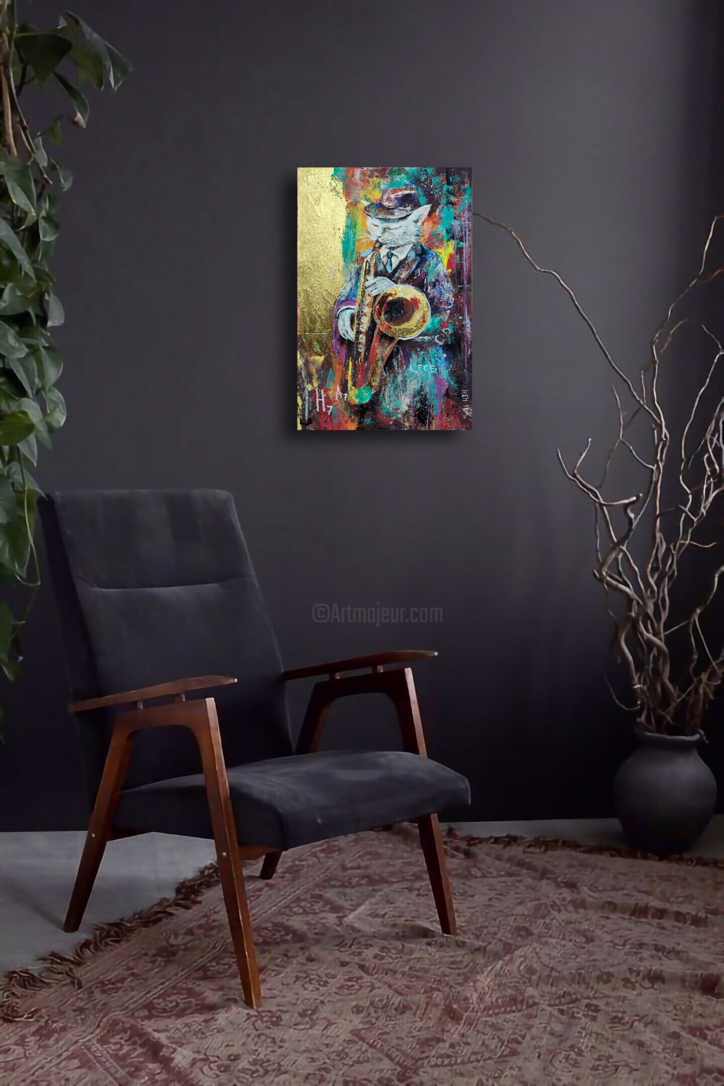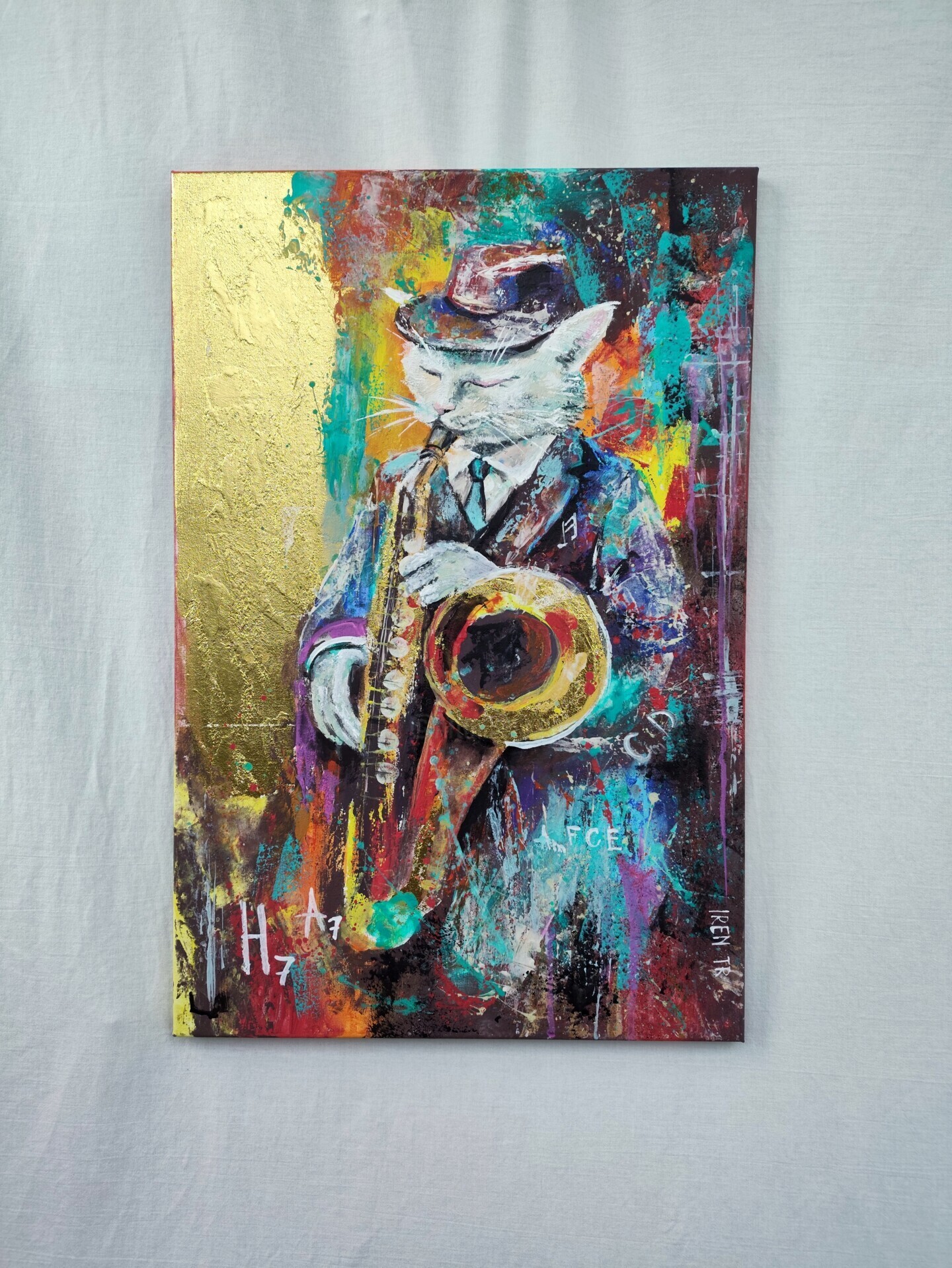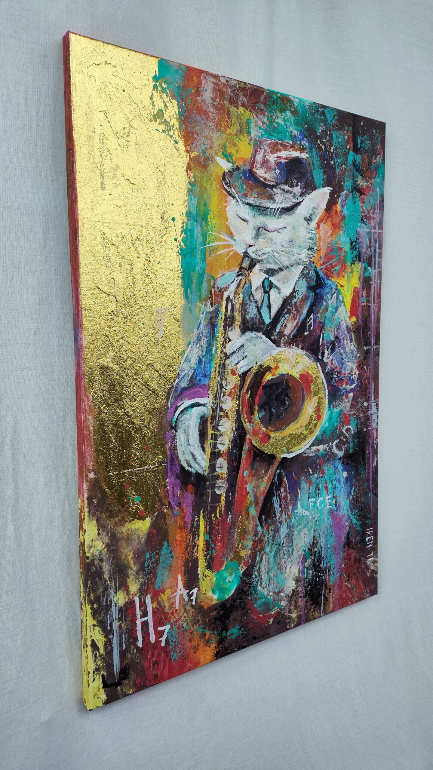 Art image bankCat Saxophone Painting Funky Jazz Animal Art Gold Leaf Acrylic Cat 40X60 Canvas Cat Painting Music Themed Wall Art