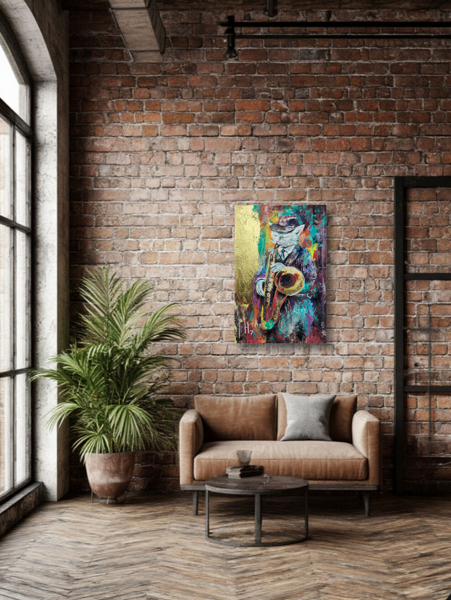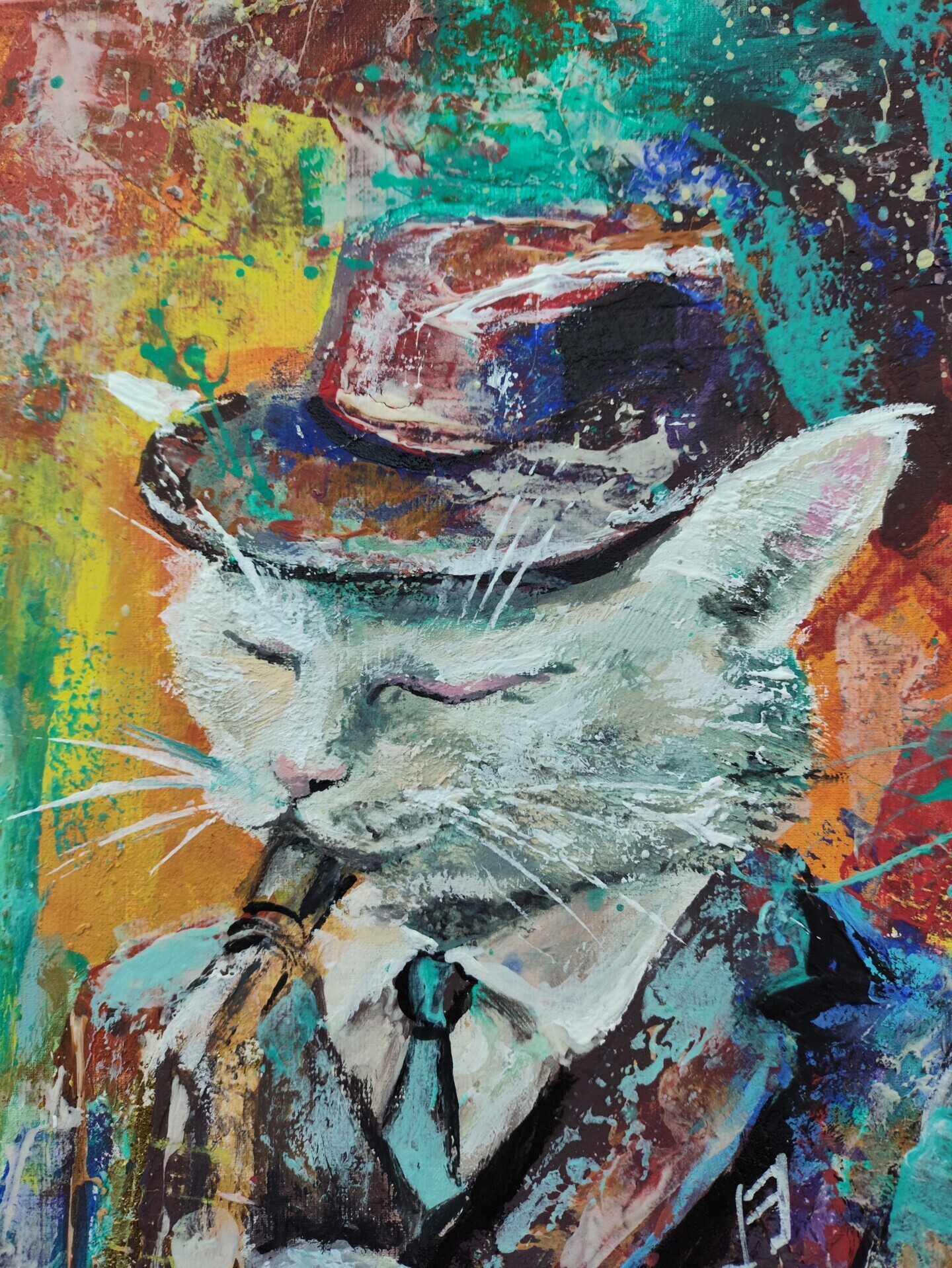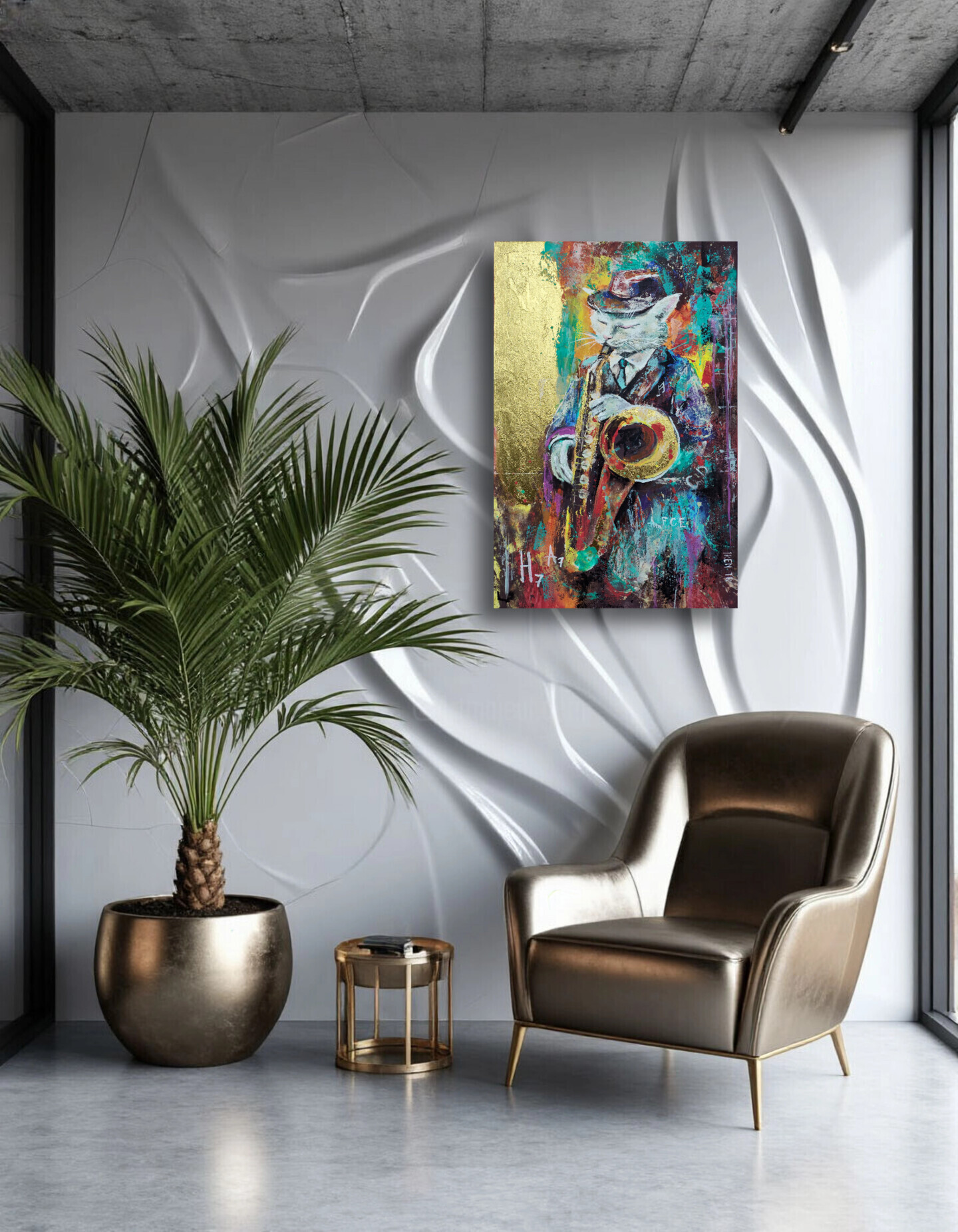 Art image bankCat Saxophone Painting Funky Jazz Animal Art Gold Leaf Acrylic Cat 40X60 Canvas Cat Painting Music Themed Wall Art