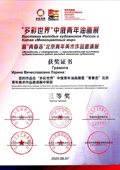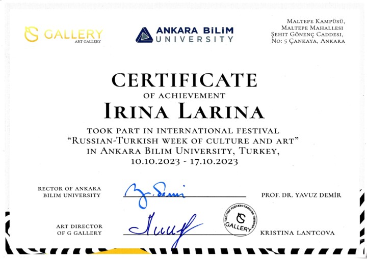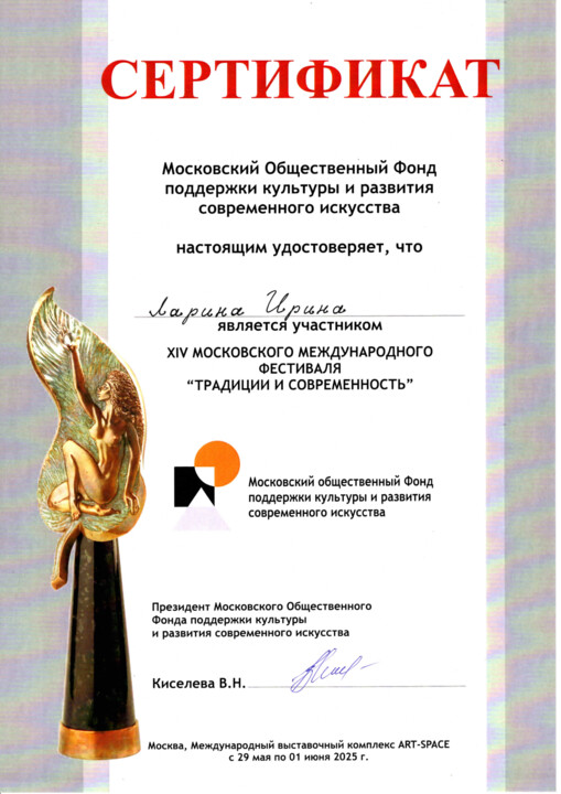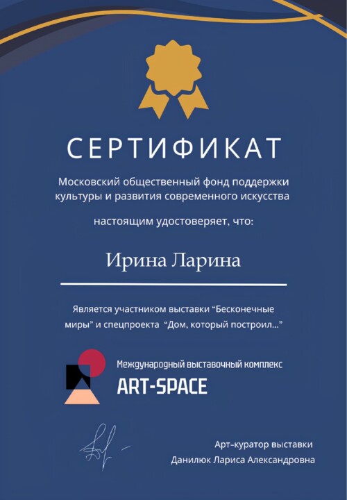 Ларина Ирина Вячеславовна — современная российская художница, родилась в 1988 году в Зеленограде, Москва. Ее художественная основа была сформирована в ходе дополнительного художественного образования в период с 2004 по 2006 год под руководством различных выдающихся художников. Позднее она окончила Национальный исследовательский университет электронных технологий по специальности «Дизайн среды», где живопись была важным направлением ее обучения. После окончания учебы она много работала в качестве графического, экологического и ландшафтного дизайнера, прежде чем вернуться к живописи в 2022 году.