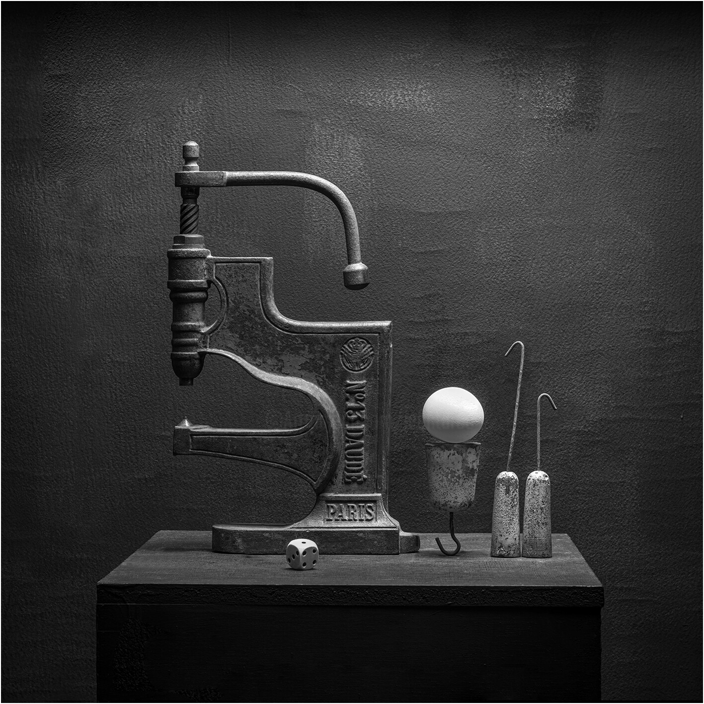 Nature morte numéro 16 soixante : « À la presse à rivets Daudé-Paris n° 13, à l'œuf, au dé et aux poids »