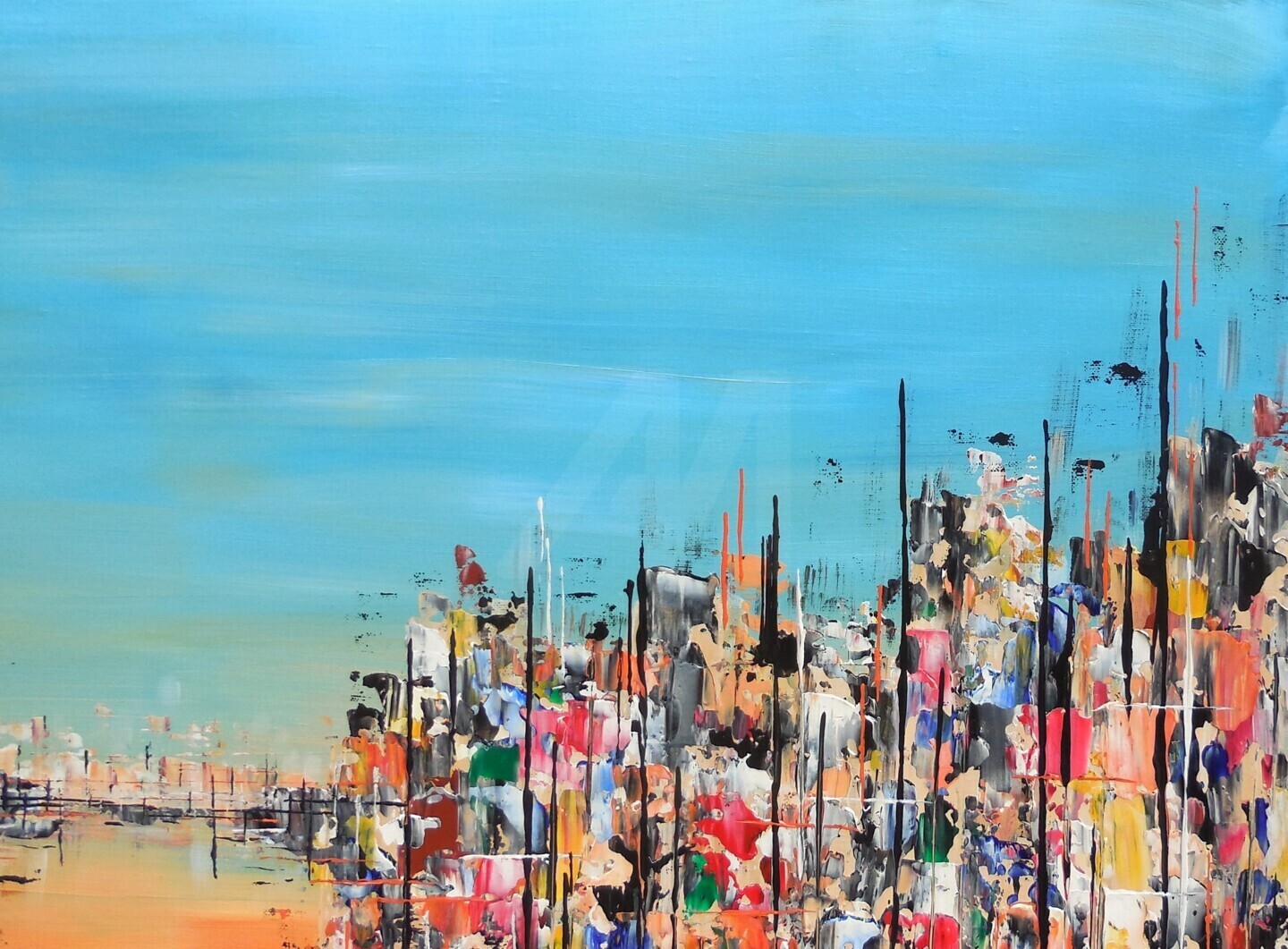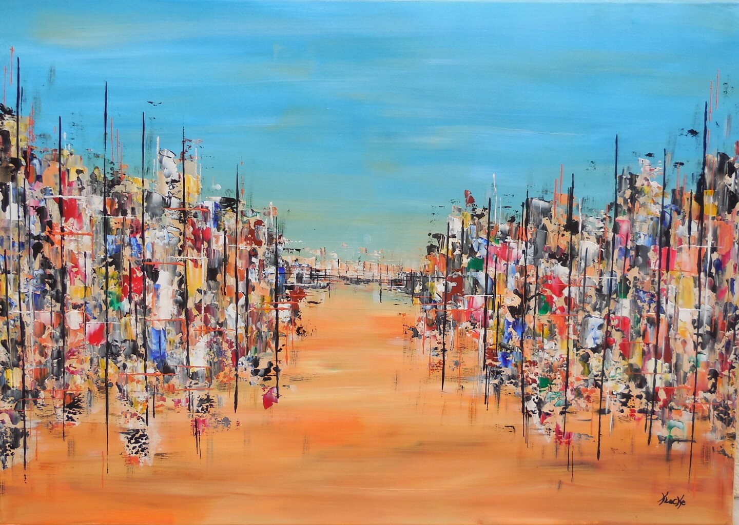 La couleur reste toujours très présente : la palette déployée est chatoyante, vive. Je m’intéresse de plus en plus aux lignes et aux effets de perspective. La ligne horizontale est souvent utilisée pour représenter l’horizon ce qui évoque à mes yeux le repos, le calme et la tranquillité. La ligne diagonale, aussi appelée la ligne oblique, symbolise le mouvement et le dynamisme. La ligne verticale symbolise la simplicité, mais aussi la rigueur et la détermination.