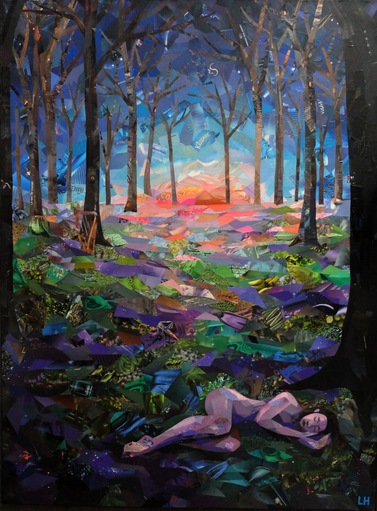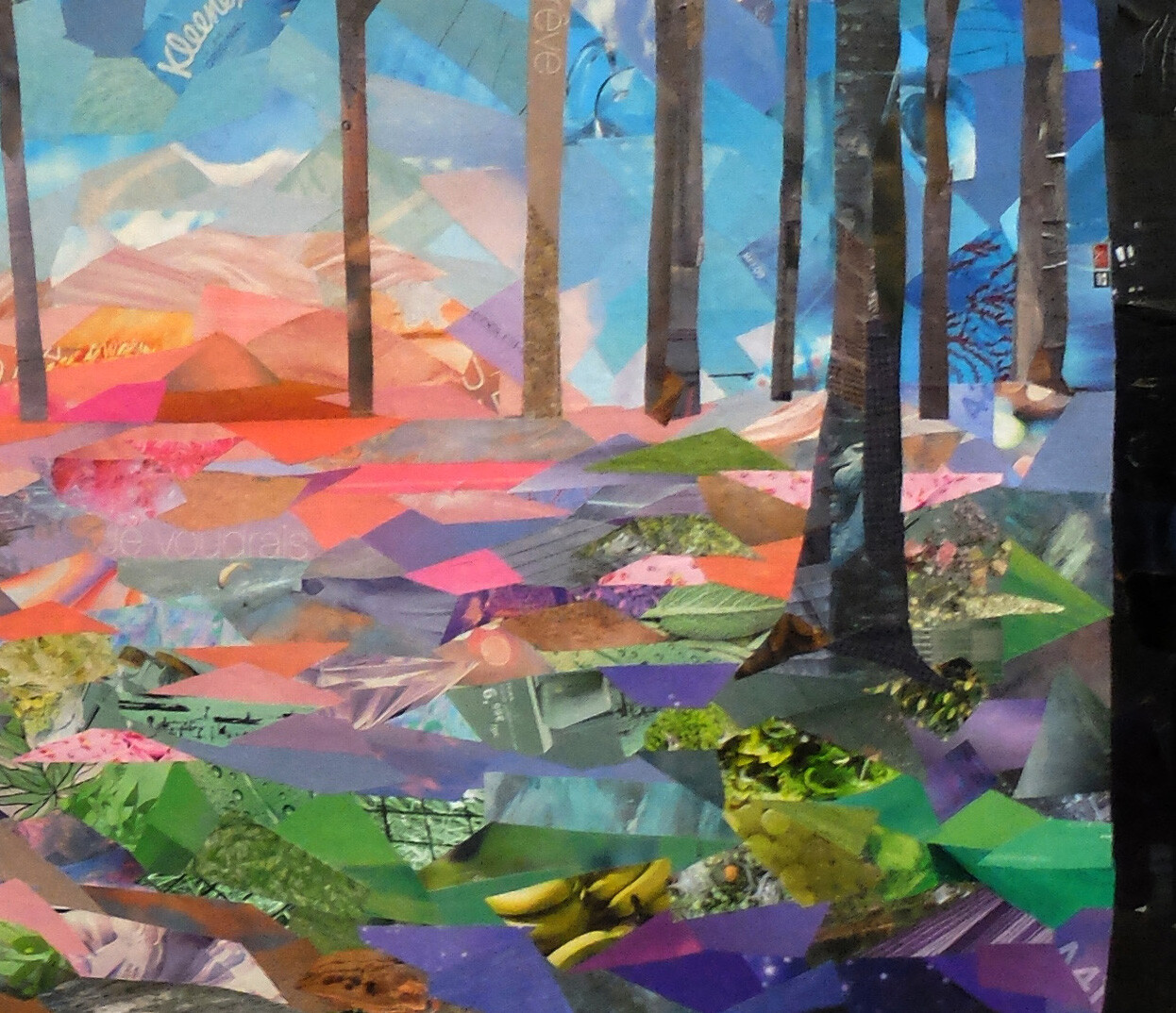 When we see her canvases representing immense forests for the first time, it seems to us that we are seeing paintings. And then when we get closer, we realize that they are actually made up of a multitude of small pieces of paper, different logos, images, objects, words from our daily lives emerge from these undergrowth. The encounter with a work by Laurence Hochin always happens in two stages, from a distance where we appreciate the subject represented then we want to see more closely and there surprised, we get lost in the details.