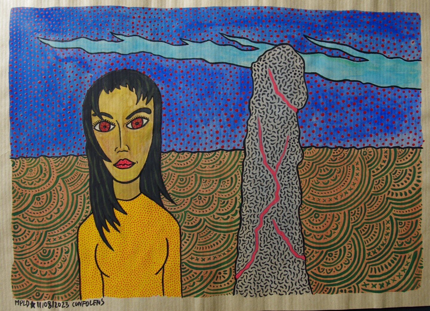 Sanat resim bankasıArtiste pluridisciplinaire maniant le pinceau et le crayon depuis toujours, l’univers artistique de Laurent Mangepapier s’apparente de prime abord à de l’art naïf, où le figuratif saute aux yeux, tout comme la couleur, franche et vive. Une certaine candeur se dégage des formes arrondies et douces, finement rehaussées d’une multitude de pointillés Plus qu’un ornement, ceux ci s’enrichissent de symboles, d’inscriptions, de signes primitifs Le regard peint fixe et captive les mains, ouvertes et tendues comme des offrandes, invitent à entrer dans la danse . Laurent Mangepapier travaille sur de nombreux supports papier, bois, ardoises, mannequins de couture, qui prennent sous ses doigts des allures enchanteresses pour nous emmener sur ses chemins de prédilection la mort, la féminité, l’Histoire, les mythes, sont les thématiques qui lui sont chères . L’œuvre conjugue les têtes de mort en pose espiègle, les visages sages à l’horreur ensanglantée, ou des volutes délicates entourant des pierres tombales Loin de la gravité angoissante et sombre d’une évocation funèbre, la grande faucheuse a des airs de calavera mexicaine à l’allure plaisante, tantôt drôle, tantôt enjolivée de broderies fleuries . Les femmes ont une place privilégiée tout au long de l’aventure artistique de Laurent Mangepapier Tantôt fées, tantôt sorcières, parfois humaines, douces ou porteuses d’une blessure, elles se font reines et envoûtantes, consolantes et puissantes . Çà et là, le spectateur rencontre des légendes, des symboles, des passages oubliés de l’Histoire qui se veulent moins être une critique facile de notre société qu’un engagement à la réflexion personnelle . Les portraits font face, parfois auréolés d’or, tels des icônes au doux parfum byzantin . Les anges et les saints livrent leur message ésotérique à qui saura le décrypter .