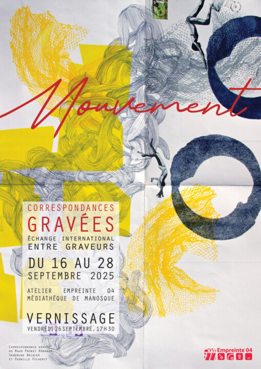 Très heureuse de participer pour la troisième année consécutive à cet formidable exposition qui montre au public, mais aussi aux différents protagonistes, des gravures -sur la thématique du mouvement- réalisées chacune par 4 graveurs par le biais d'échanges épistolaires. 110 graveurs au total!
