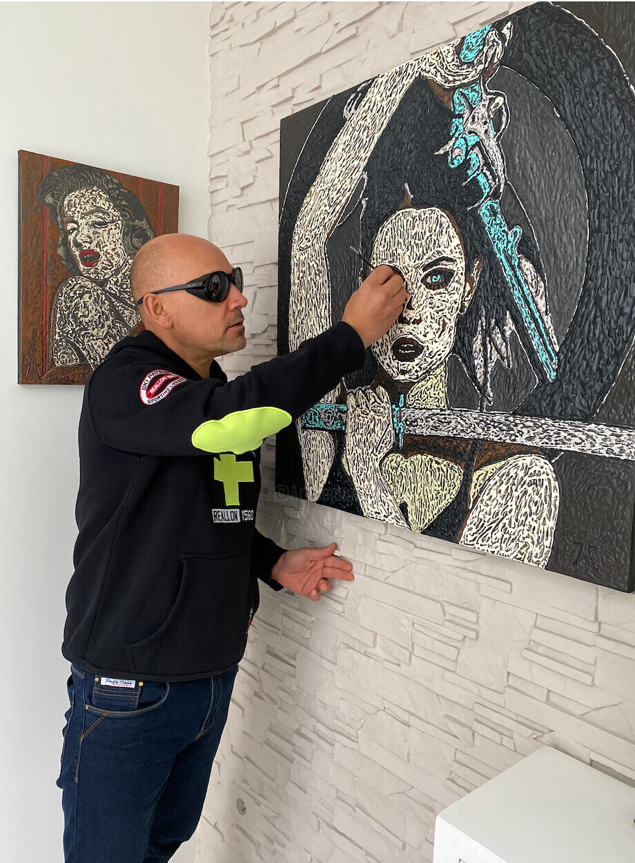 La clé nécessaire pour comprendre est l’œil fixé sur le niveau à bulle qui perturbe et dépasse l’entendement. Les choses profondes intérieures en accord et correspondance se révèlent à l’extérieur au réel transcendant. Une façon détournée sans œillères, qui invite à porter l’attention sur ce que nous avons l'habitude de voir. Le décalé dans un autre regard ouvre la Boite de Pandore et remet en question certains supérieurs illusoires, en nouvelle réflexion qui insupporte et perturbe ces gens trop rigides, dénués d’humour et de savoir vivre. Paradoxalement le décalé Hors Norme et non académique vise l’ambition d’atteindre le véritable équilibre. Mes Sculptures inox ont été créés afin de pouvoir accrocher sur des supports mes Œuvres Acryliques/Toiles, dans un Art Contemporain, au respect de quatre règles fondamentales de l'ART INDIGÈNE ancestral. Une application au sol, un travail sur les pigments, une absence de signature supplantée par un logo adéquat et comme son Créateur libre sans limite, ni cadrées par qui que ce soit, ni encadrées par quoi que ce soit. En 2023 et 2025, Dépôt à l’Inpi et protection sur la Blockchain ancrage MDA-DATA International, de mes Sculptures Inox Droite et Gauche Châssis-Décalé-Marjinal / Châssis-Éventail-Décalé-Marjinal. Clin d’œil en avant-première aux News Créations Série Bulles au salon Art Contemporain de Paris. Un authentique bouclier énergétique et spirituel en représentation de légèreté et plaisirs simples de la vie. L’Univers d’Élégance Éventail, délicat et raffiné, protège contre les néfastes Influences Extérieures, de Manière Subtile se révèle en dualité une œuvre, un message, suivant le côté que regarde le spectateur. Associées à de nouvelles Œuvres acryliques baptisées ‘Molécules Collagène’, un premier travail de fond épais, finalisés de pigments différents, l’approche se compare à l’esthéticienne. L’Œuvre accomplie laisse apparaitre, de nombreuses barres avec aux extrémités, la présence de Sphériques. Idem aux protéines vitales de notre organisme, démontrent que reliées ensembles, est bénéfique. Comme la Matière immortalise la naissance d’un tableau, toute création de l’Esprit reste légitime en débat, la connaissance hermétique révèle en extrait que tout ce qui est en haut est comme tout ce qui est en bas...