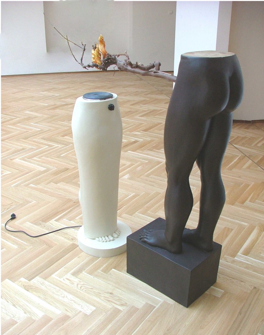 She has found the theme for her sculptures and sculpture installations in archetypally viewed polarity given by the woman and man principle. Somewhat ironically she observes transformations of both polarities in the changing society. Inspired by fairy tales, historical non-fiction, folklore, cartoon, sci-fi, and others, the artist uses and transforms the existing language forms into a new sculpture. The leitmotif is a heterogeneous couple of figures who acquire a symbolic meaning. They are the reason behind any action, duration, ceasing, and renewal of life cycles. “Prince” and “Princess” are ideal attribution prototypes combining the physical and spiritual ideals. In the non-descriptive geometric form, the central (usually a circle) and the vertical (a column, shaft) form a symbol transcription of the female and male sexuality.
