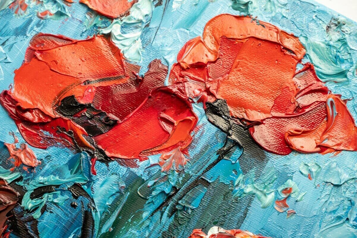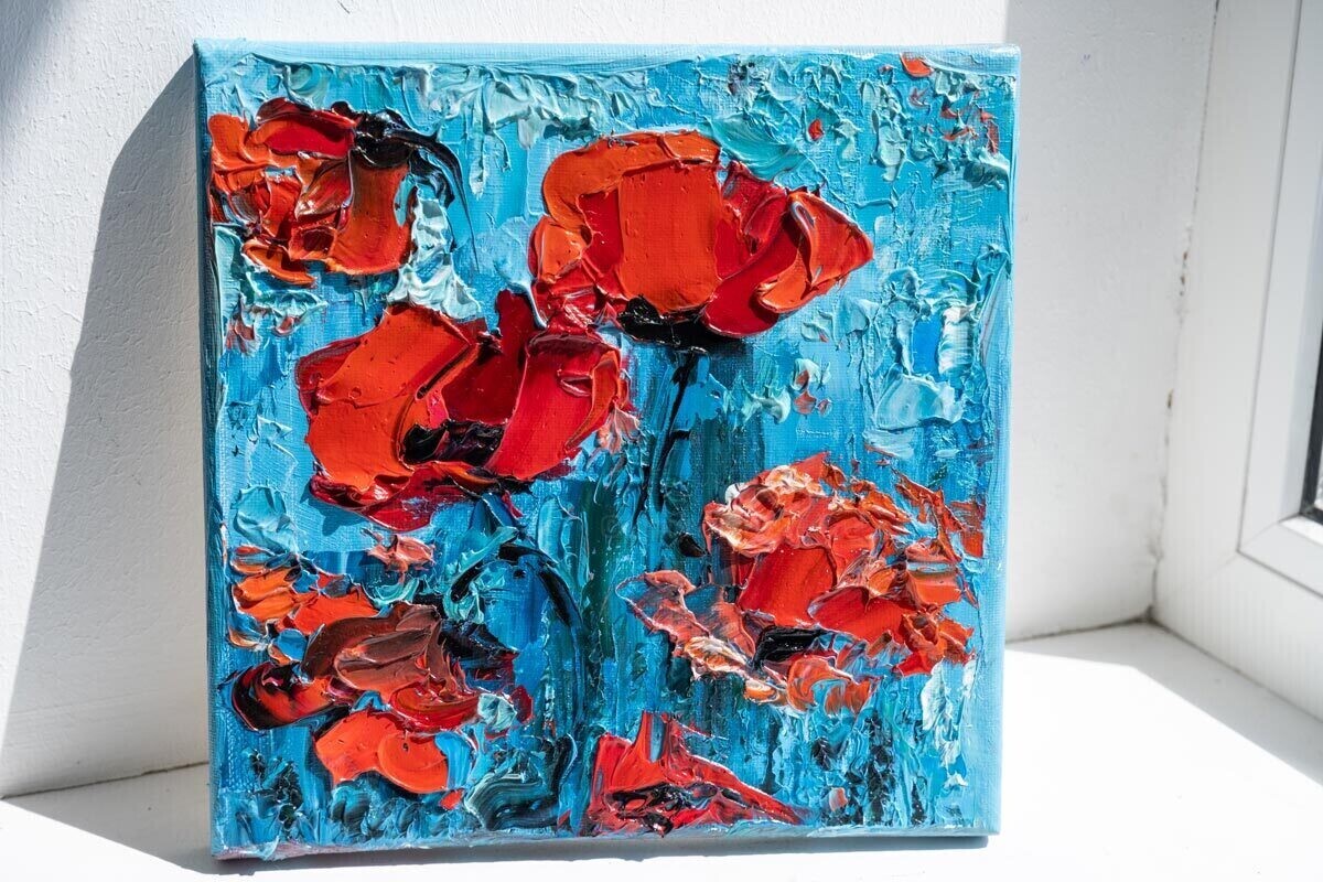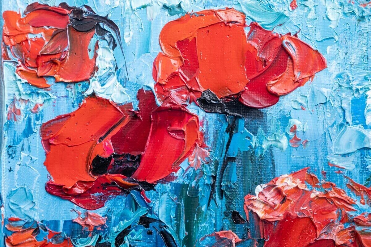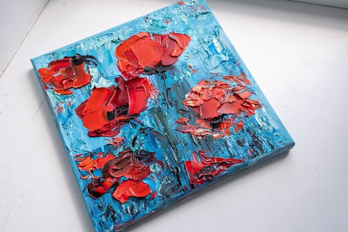 Banco de imagens de arteRed Poppy ArtworkImpasto Floral PaintingExpressionist Oil ArtBlue Background DecorTextured Palette Knife Art