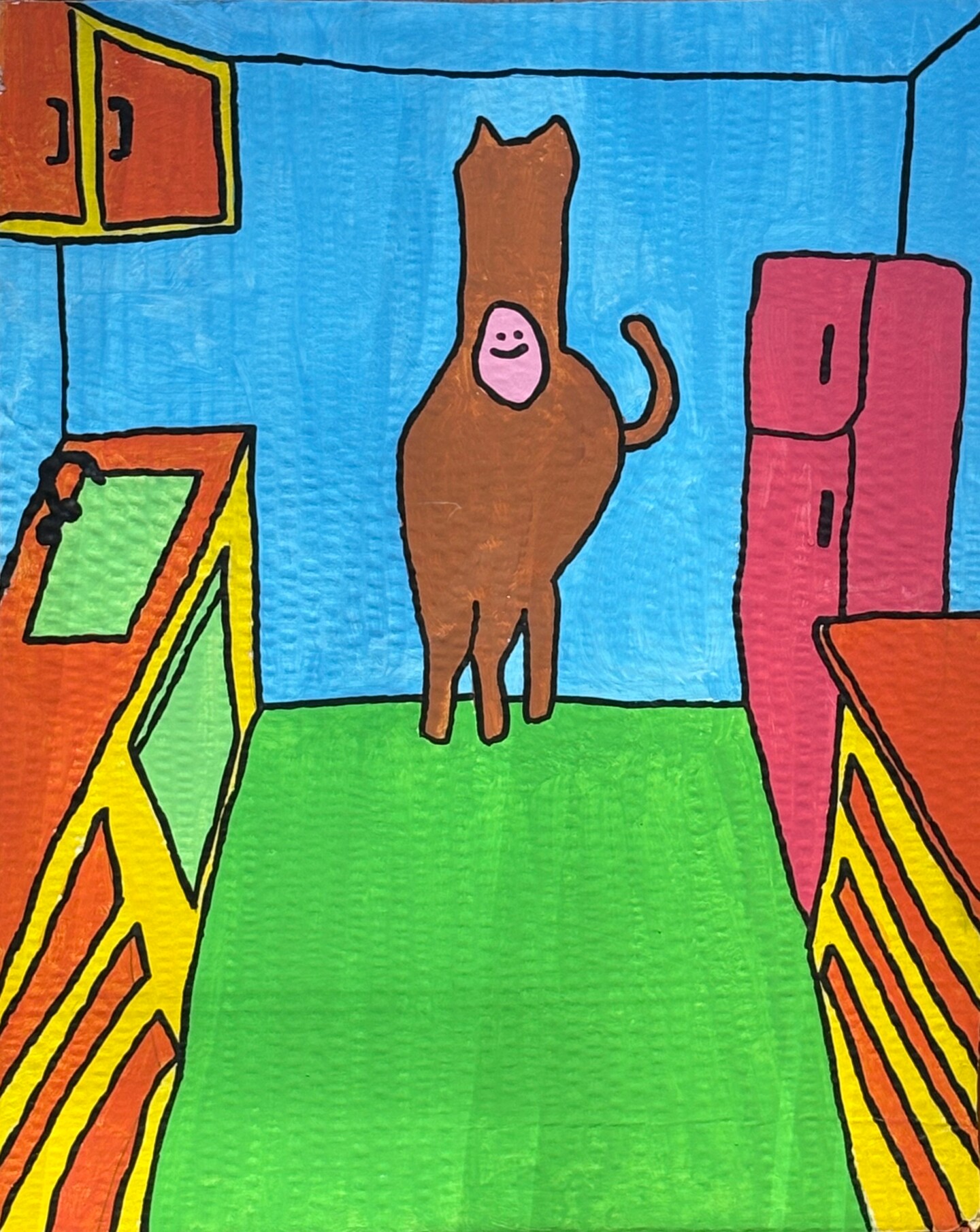 Le carton est une matière fragile, comme moi, c'est donc le support idéal pour m'exprimer. Toutes mes oeuvres sont des peintures à la gouache sur des cartons abandonnés de ma ville.