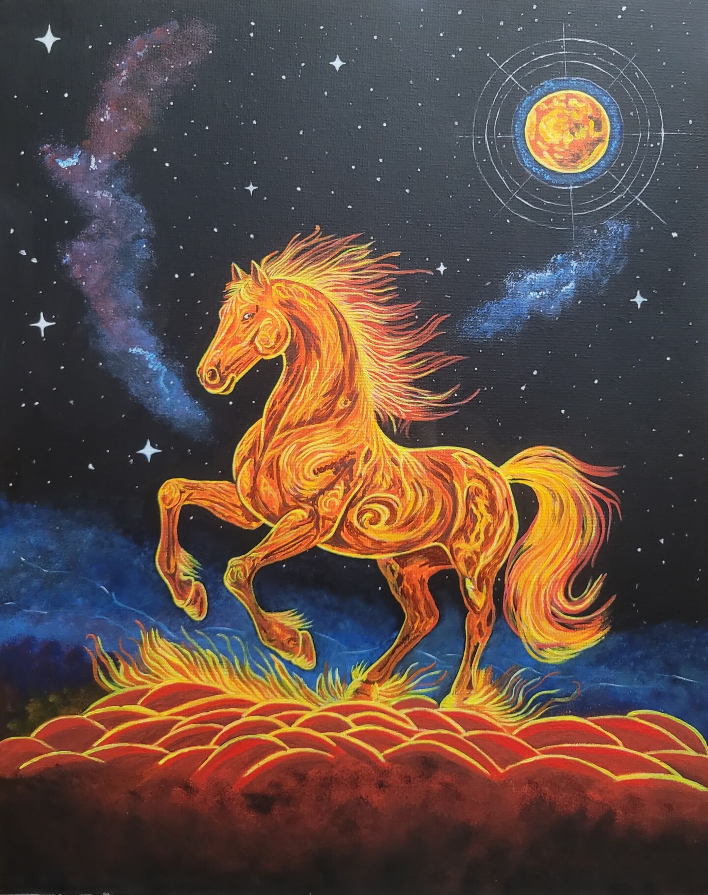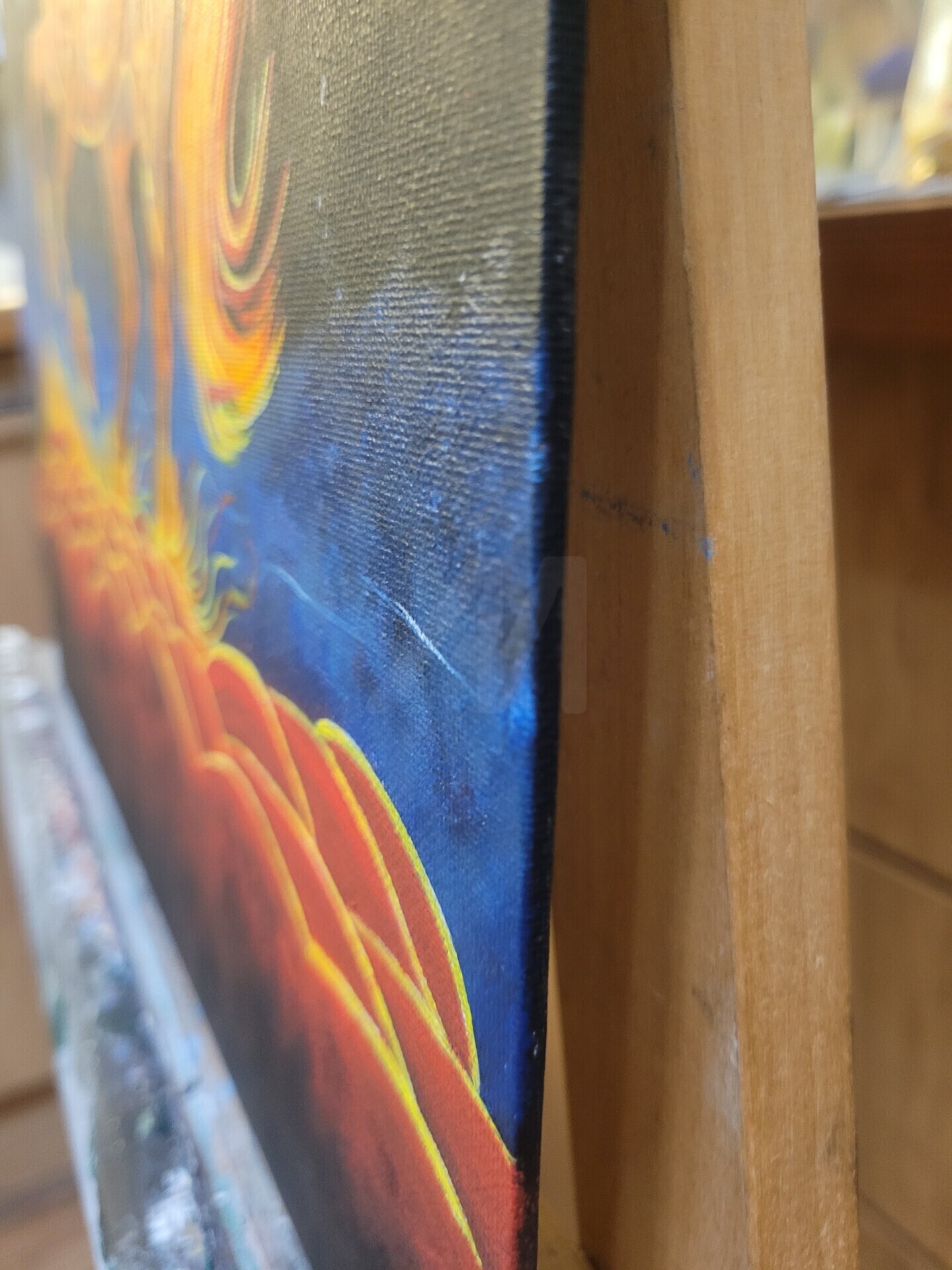 She specializes in hyperrealism, creating large-scale canvases with acrylics, texture paste, and gold leaf, often limiting her palette to the powerful combination of black, red, and white. Her works—whether landscapes, sacred geometry, or contour drawings—strive not merely to depict, but to convey a sense of the viewer's full immersion within the painting.