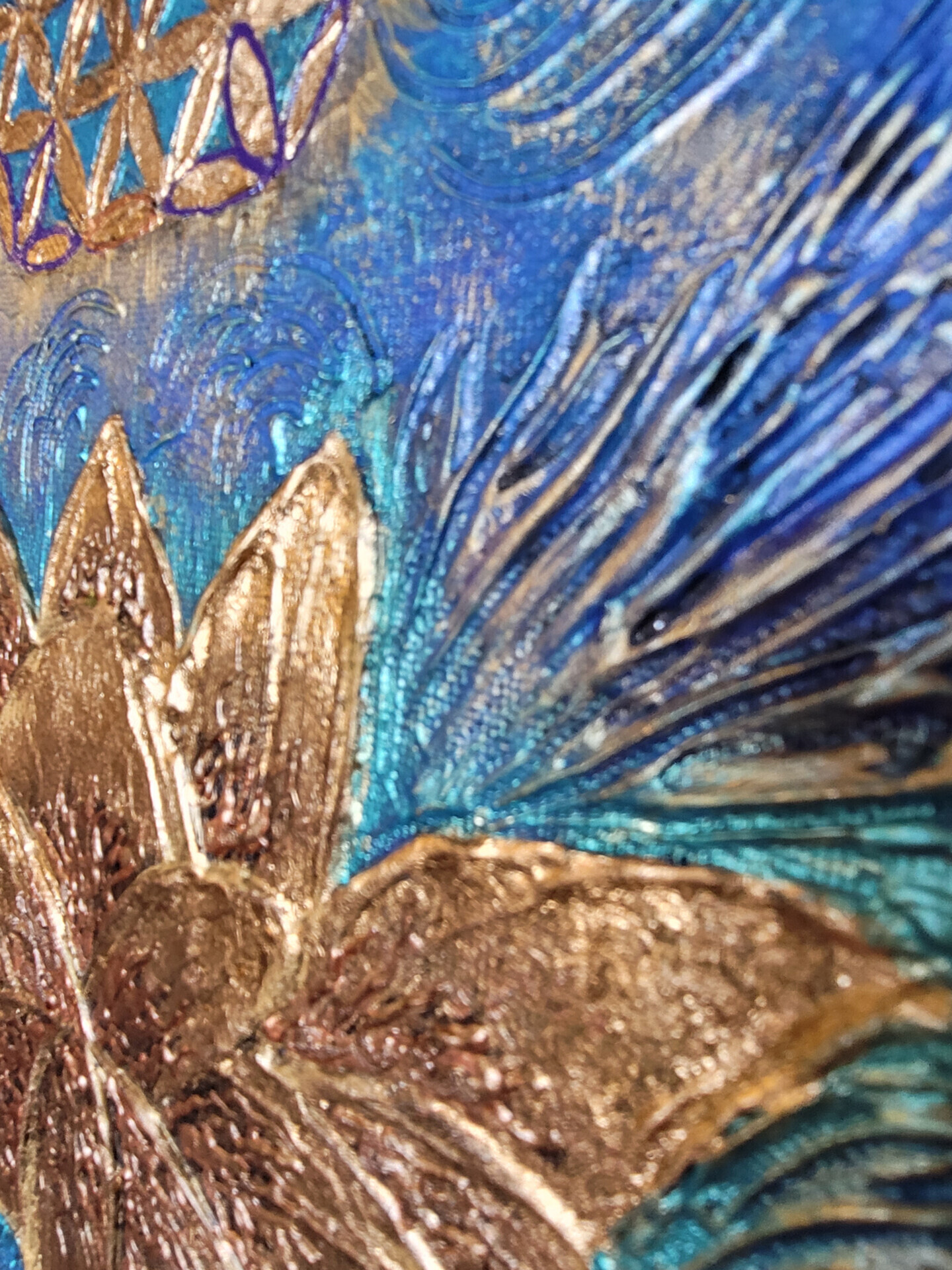 In my work, I combine the power of hyperrealism with the tactile magic of texture paste and the shimmer of gold leaf. The paste gives my images a physical, tangible reality, while the gold leaf becomes an inner light that reveals the magic in every narrative. This synthesis creates an effect of complete presence, inviting the viewer to step into the painting.