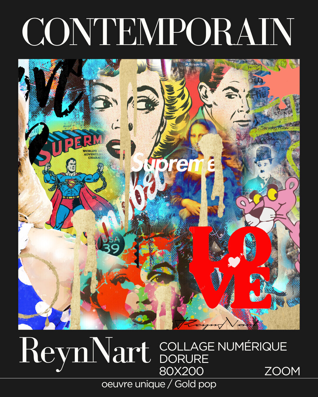 Art image bankReynnart est un artiste visuel émergent, travaillant principalement sur alu, toile et en sculpture. Son univers artistique se structure autour de montages numériques enrichis de feuille d’or véritable, combinant techniques modernes et détails précieux
