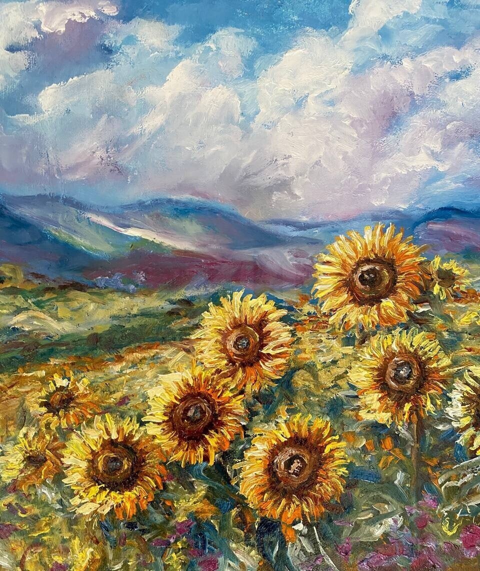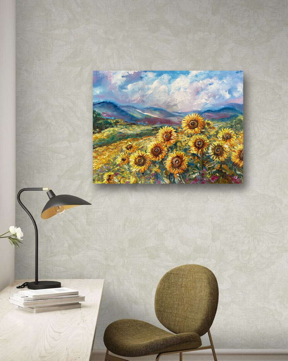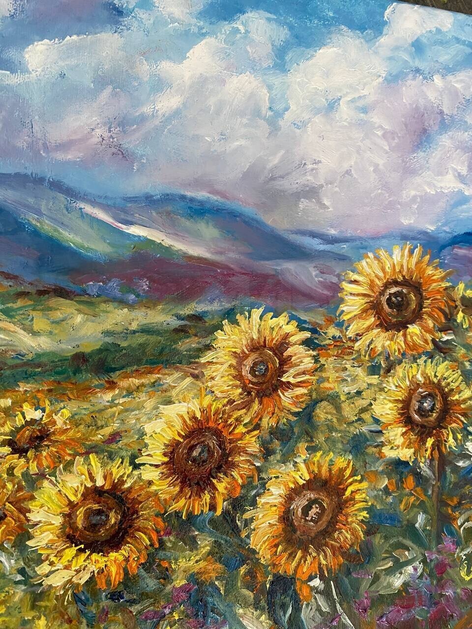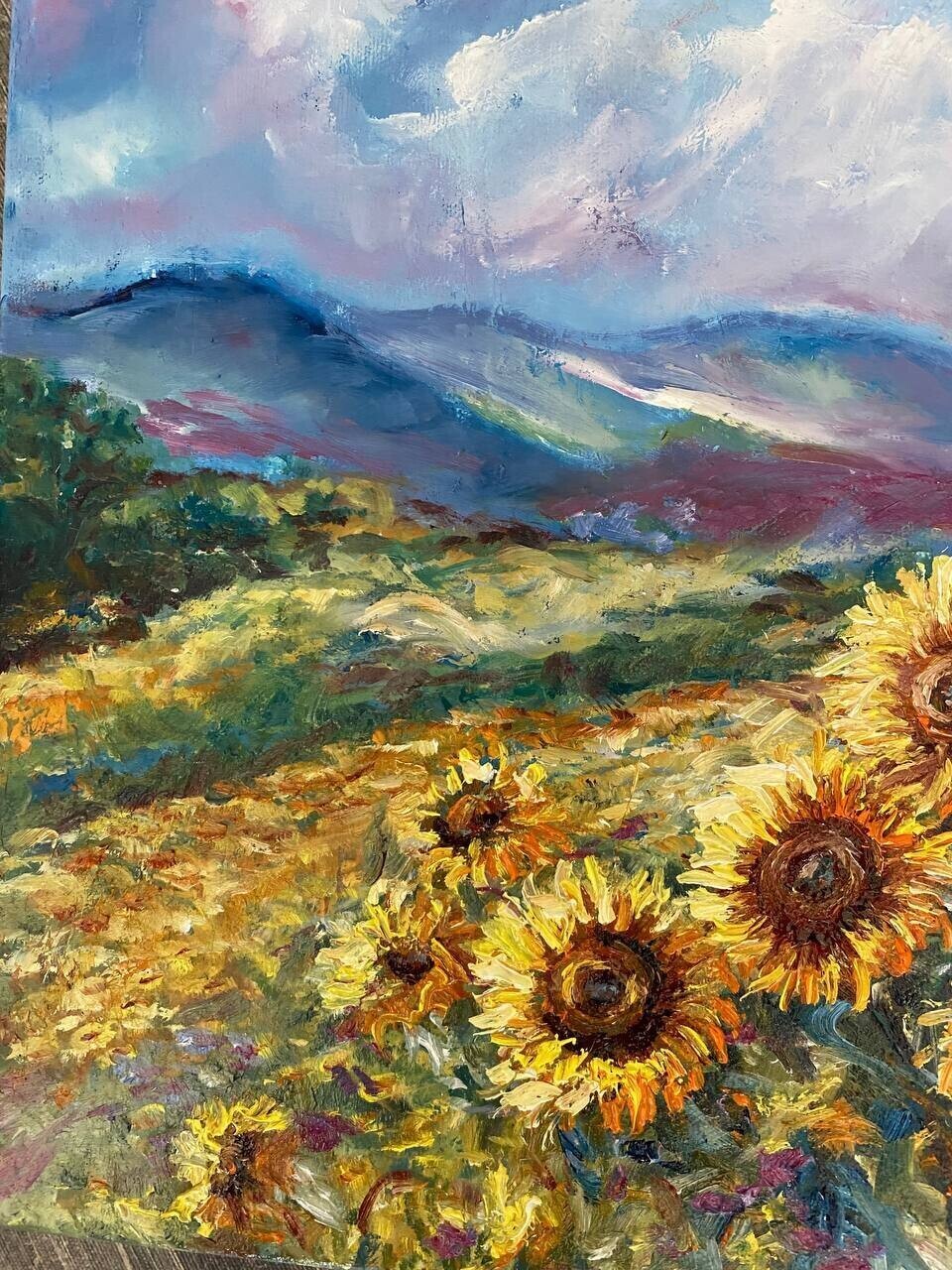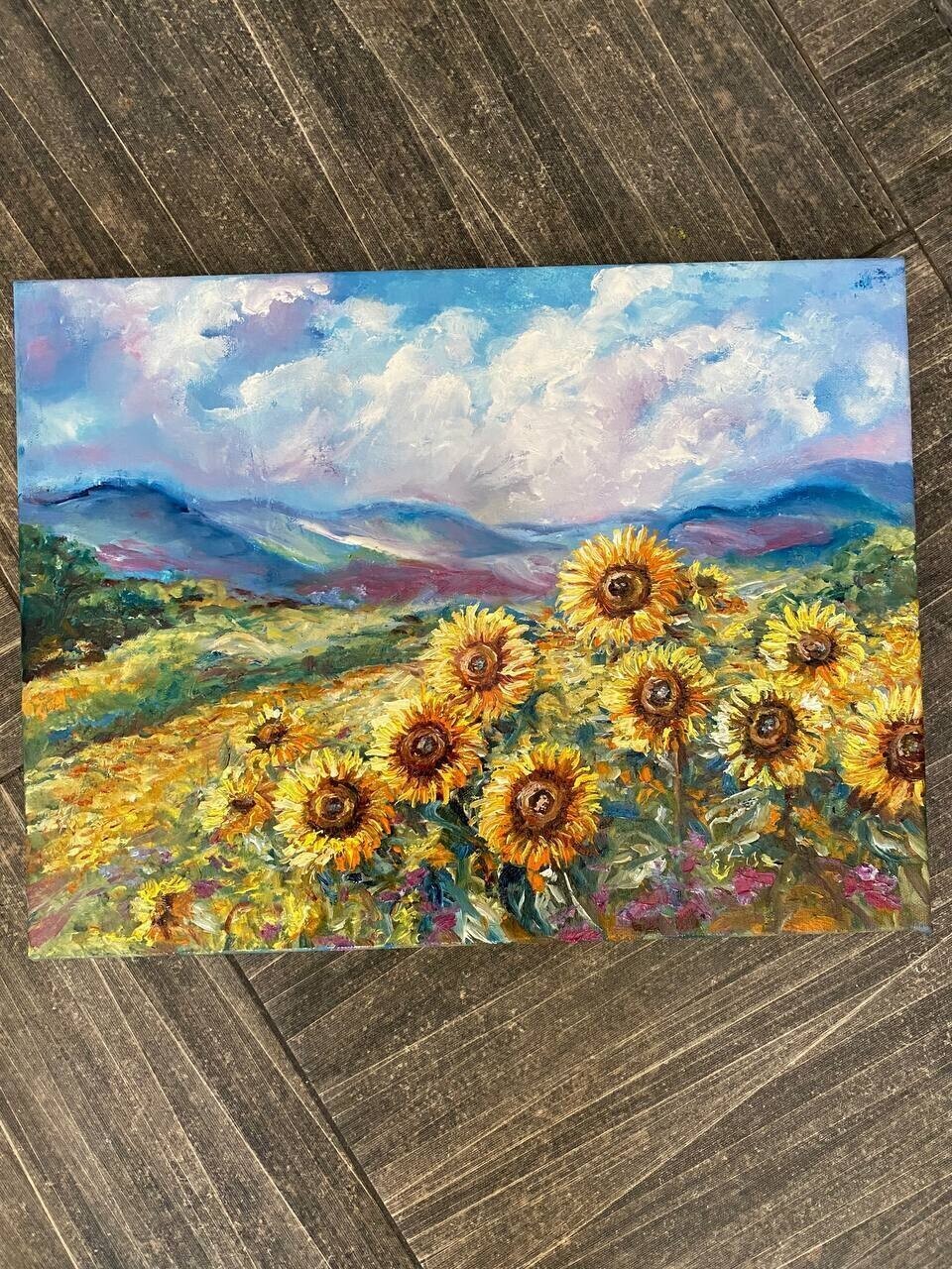 Sunflower in the field, countryside, mountains, field, landscape, oil paints, original painting on canvas, handmade, the painting is in stock and will be shipped immediately after purchase. About this artwork: Classification, Techniques & Styles. Oil. Paint consisting of pigments bound with linseed oil or carnations. The traditional technique consists...