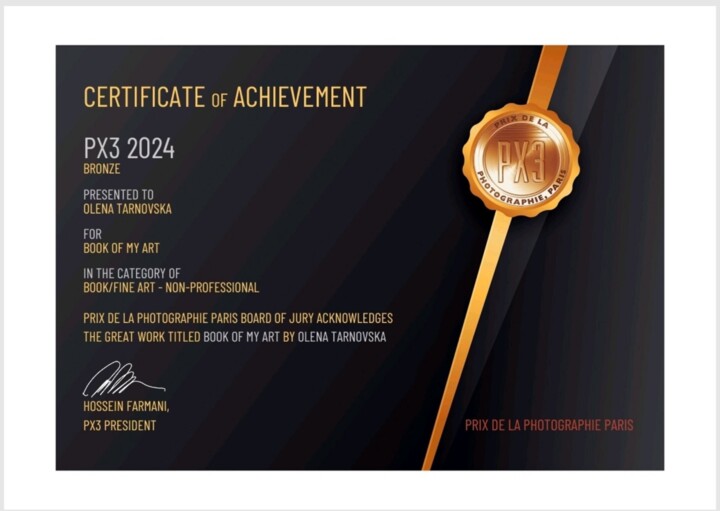 Ukrainian photographer and visual artist who lives and works in Italy. Art and photography occupied an important place in her life since childhood. A lawyer by profession, Olena gratefully calls the Kyiv School of Photography her photographic alma mater. For her, photography is one of the ways of living creativity. "Beauty is in the eye of the beholder." Noticing details, the inconspicuous, discovering combinations and paradoxes, echoing elements, she gets aesthetic pleasure and shares this through her works. Shows the fascinating in the ordinary. In photography, she admires diversity, explores the aesthetics of different genres and directions. Shadows, the combination of textures and colors, the beauty of surface imperfections, the visual effects that occur at certain angles and in light rays, the harmony of black and white and the atmosphere created by color. Olena also experiments with Artificial Intelligence, ceramics and drawing. Olena's photo books, series, and individual works have been awarded honorable mentions, nominations, and winning awards at such international competitions as Prix de la Photographie de Paris (Px3), International Photography Awards, International Black and White Spider Awards, Tokyo International Foto Awards, London International Creative Competition, International Color Awards. Many of Olena's photographs are featured in various exhibitions at The Glasgow Gallery of Photography.