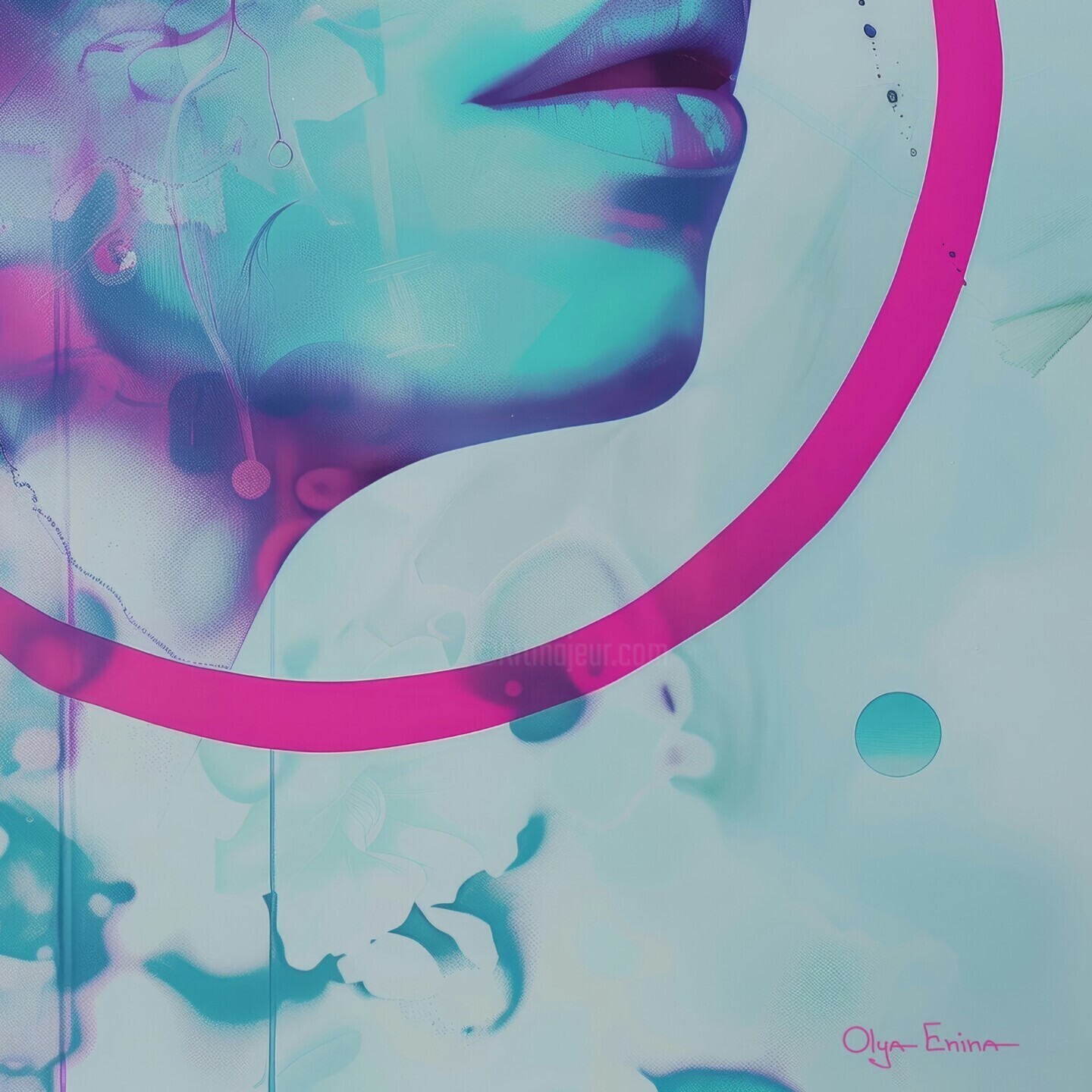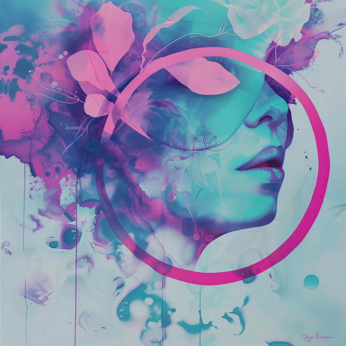 Her fascination with the juxtaposition of opposites stems from a deep interest in how life's chaotic moments coexist with periods of stability. In her paintings, the use of pink and blue symbolizes these opposing forces while highlighting their inseparability—much like how moments of upheaval and calm blend to form the wholeness of existence. Olya constructs geometric shapes like circles, lines, and squares to represent the order we seek, while abstract elements disrupt them, mirroring the unpredictability of life.