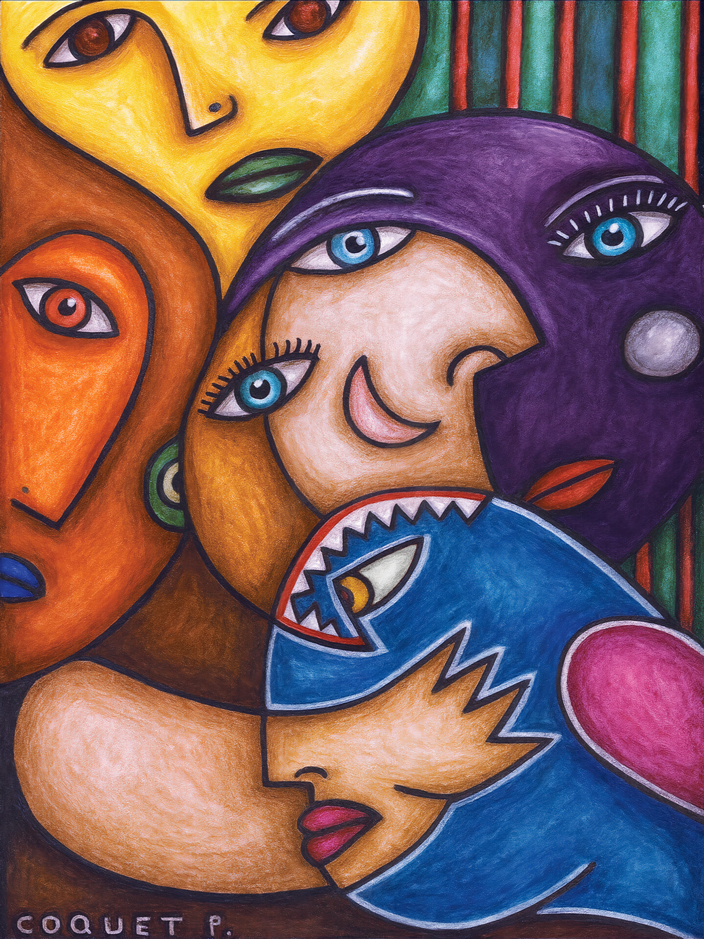 Dans ma dernière période artistique, mes dessins sont principalement constitués de visages, de mains, de bras, du soleil, de quelques objets et des animaux (oiseaux, poissons, serpents). J'ai eu l'idée d'associer l'art et les formes géométriques que l'on retrouve dans les mathématiques. Ainsi, je dessine des contours de visages, de mains, d'objets tangents les uns aux autres. J'ai appelé cette forme d'art : "Le tangentisme".