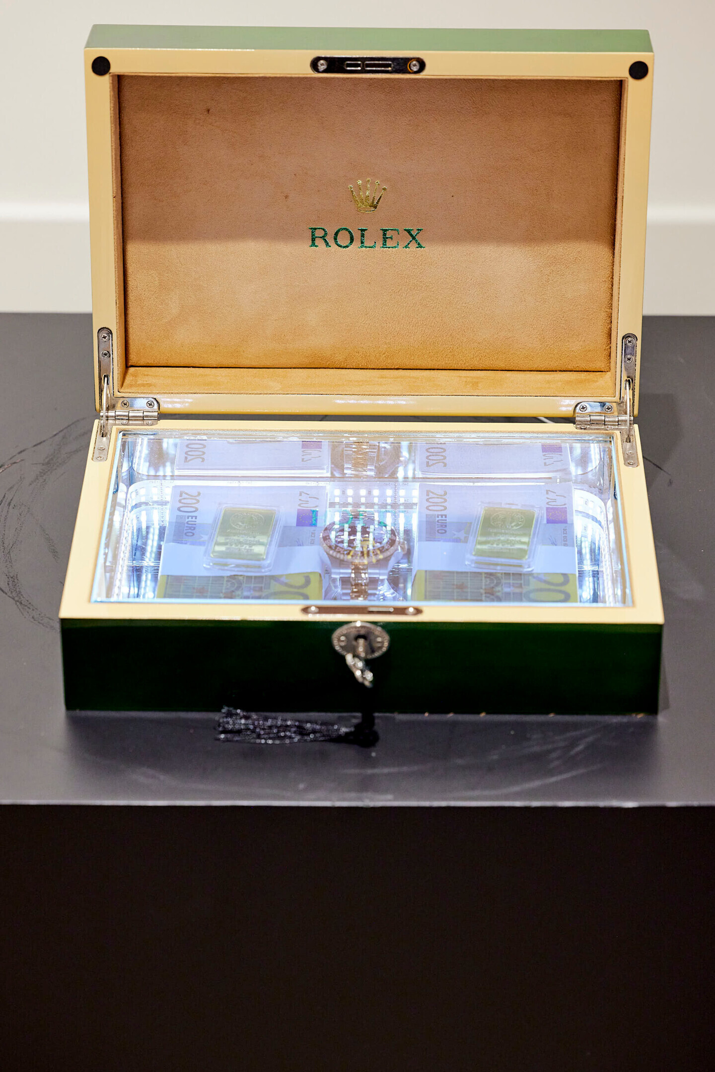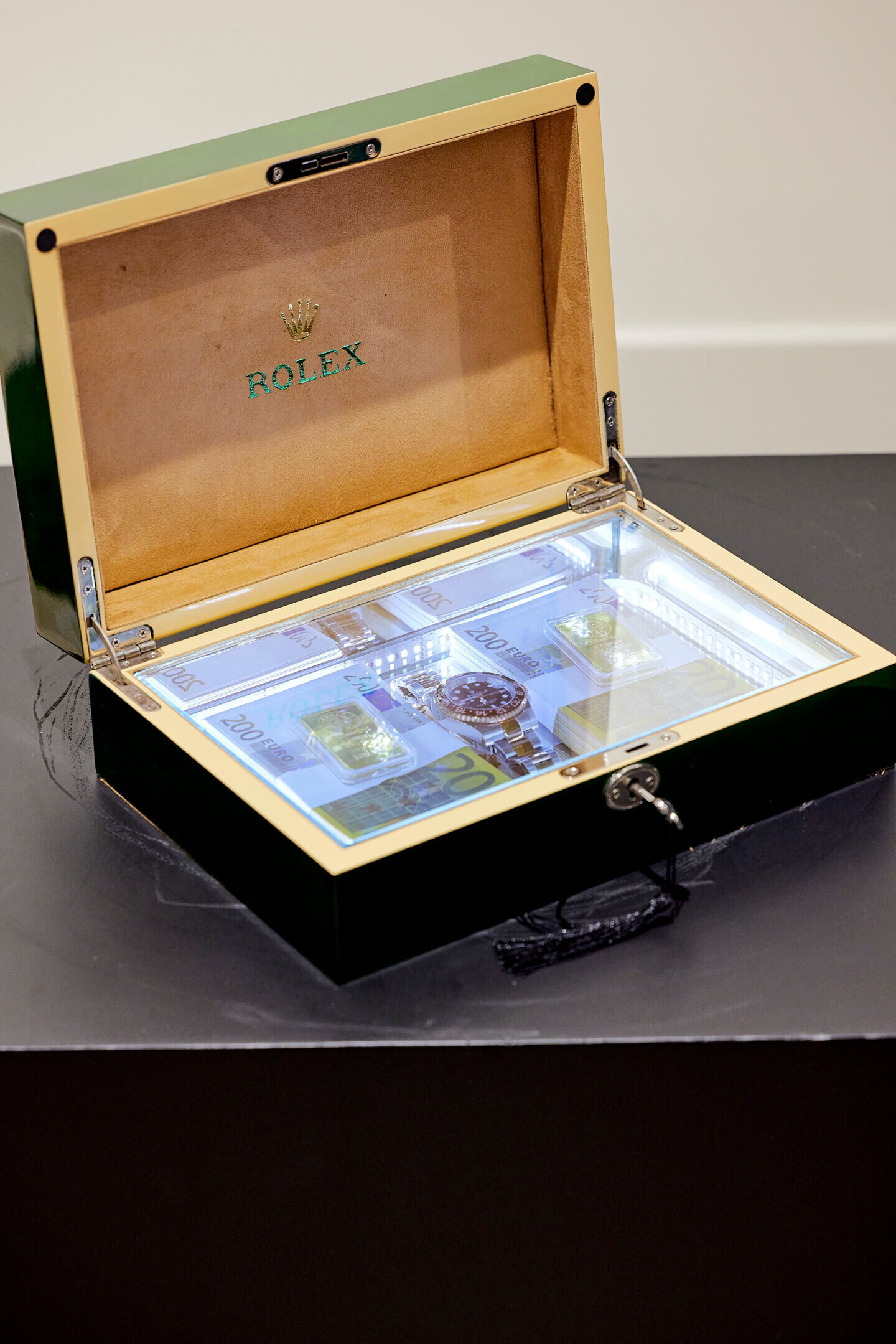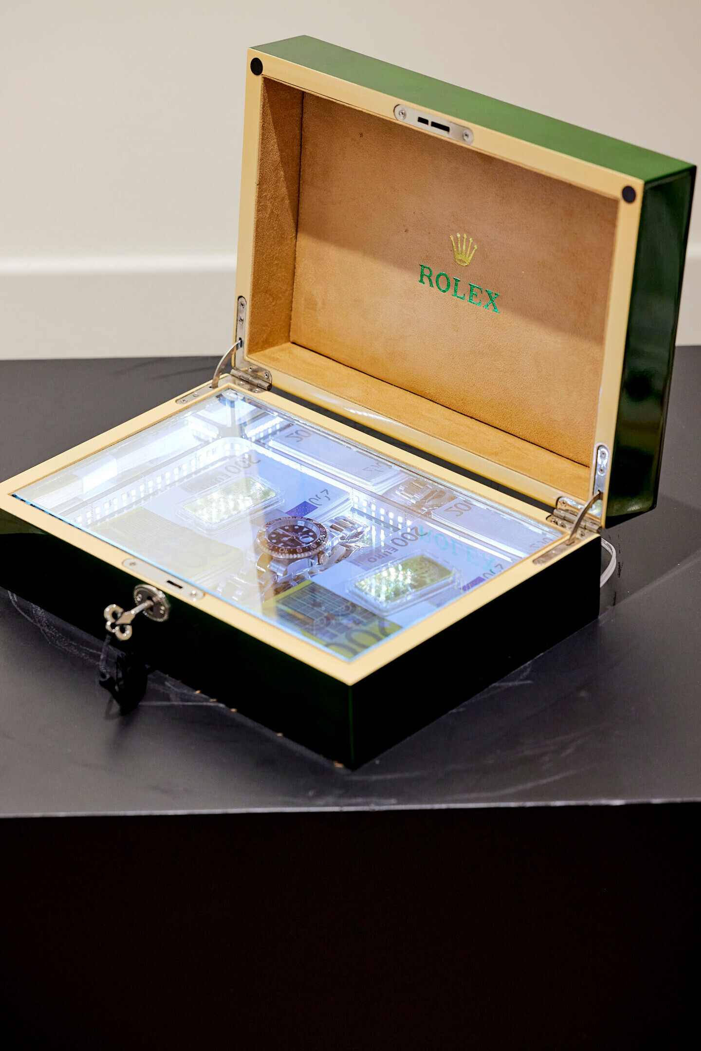 Working with unconventional materials such as marble, Rolex watch boxes, and other rare or restricted objects, Phantom Art produces artworks that exist in a gray zone between what is celebrated and what is forbidden. Each piece raises questions about value, possession, and the fragile line that separates art from contraband.