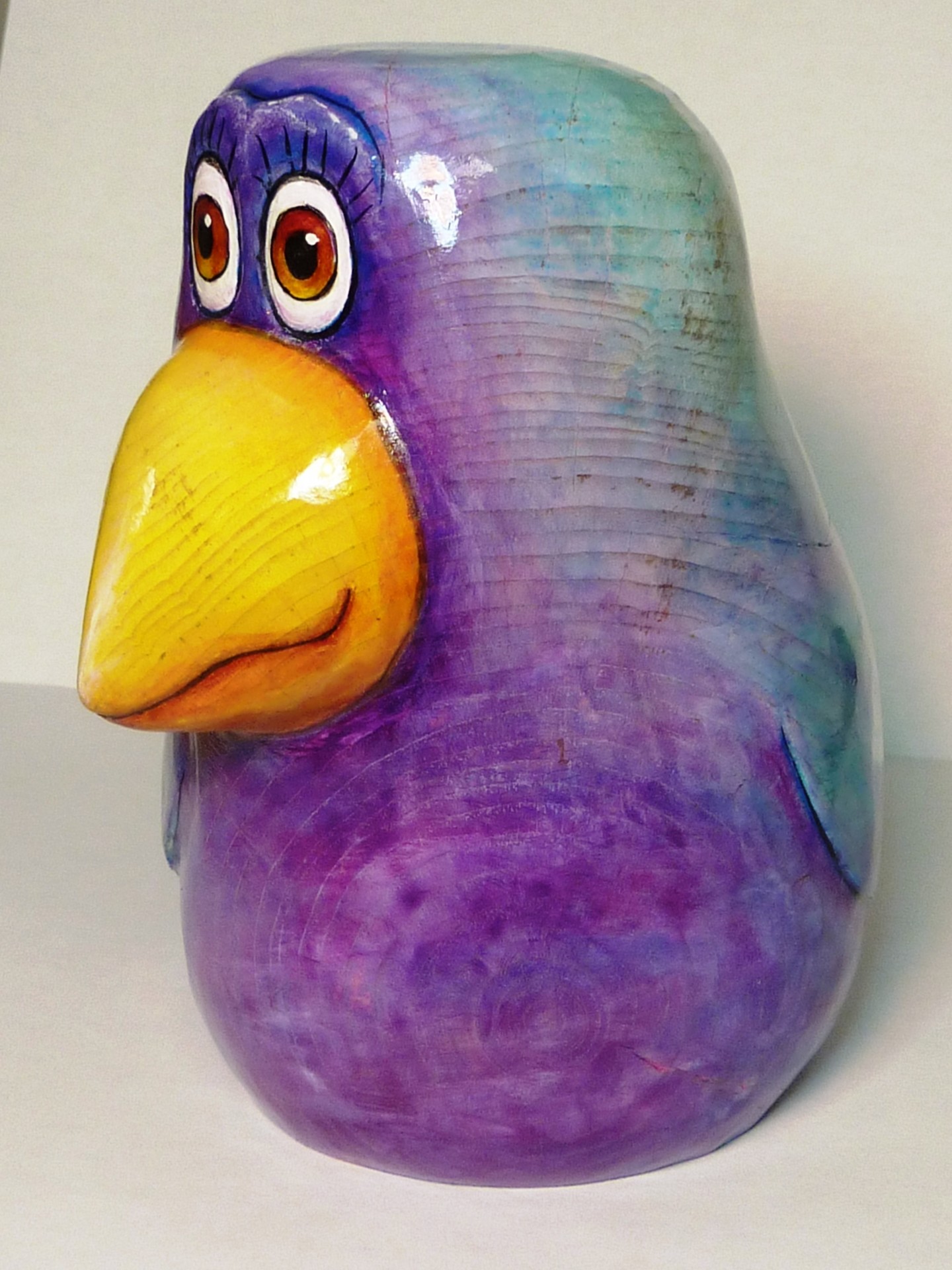 La sculpture sur bois, d’un style particulier, est un des résultats de cette liberté. Je récupère du bois de grève, je dessine le personnage, je le sculpte et je lui donne des couleurs avec des lavis d’acrylique et ce, le plus souvent avec humour.