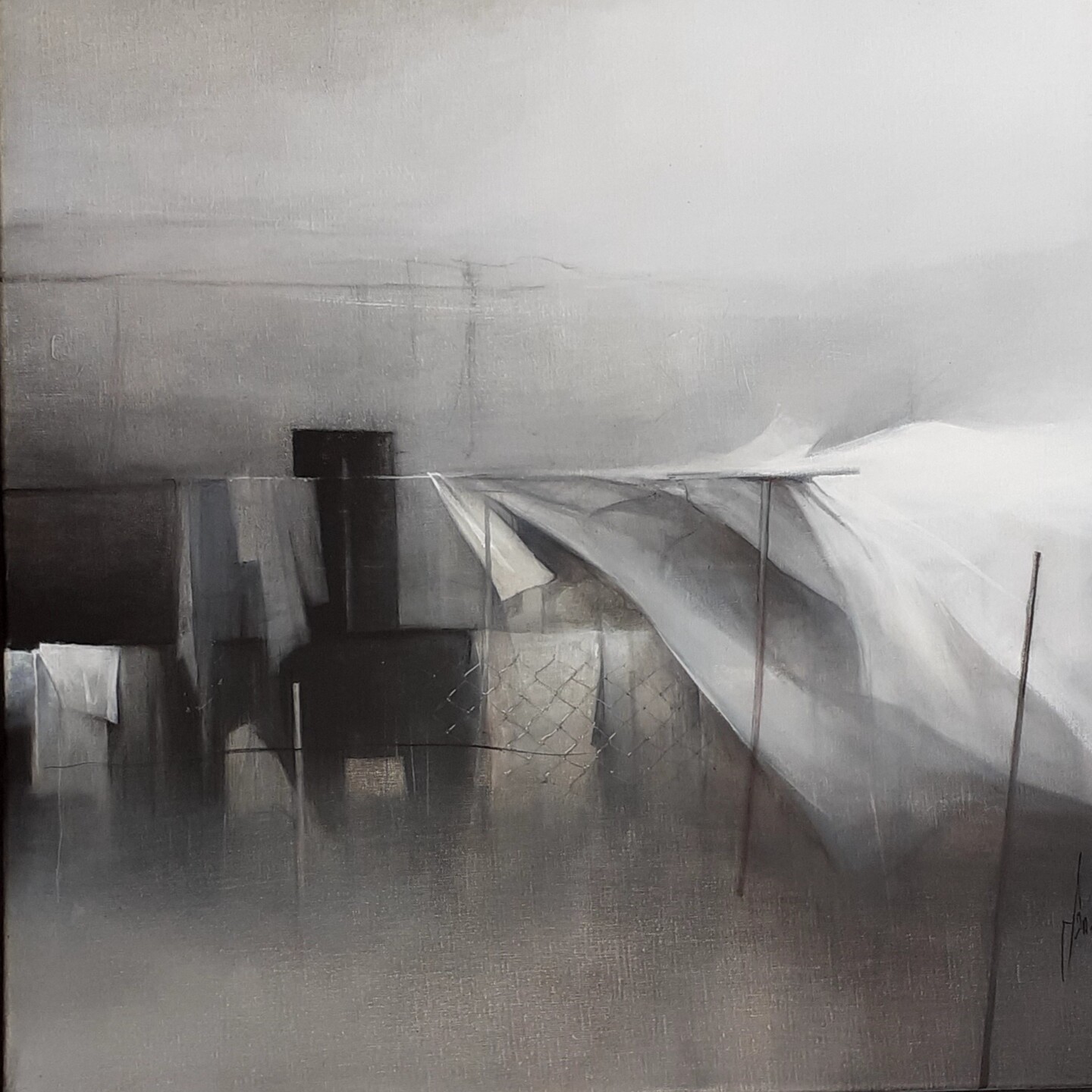 Mes inspirations viennent essentiellement de mes voyages ou de souvenirs d'enfance quand j'allais étendre le linge avec ma grand-mère que j'interprête, principalement, sur des grands formats carrés, notamment pour jouer avec la perspective et la composition