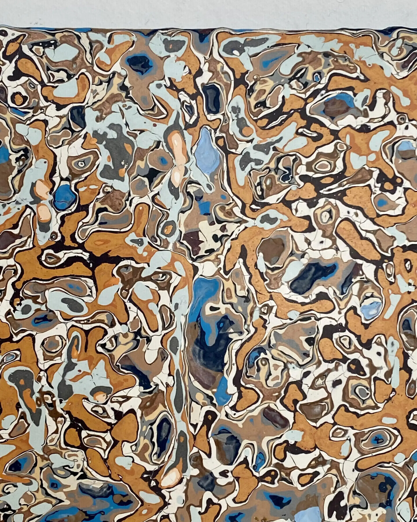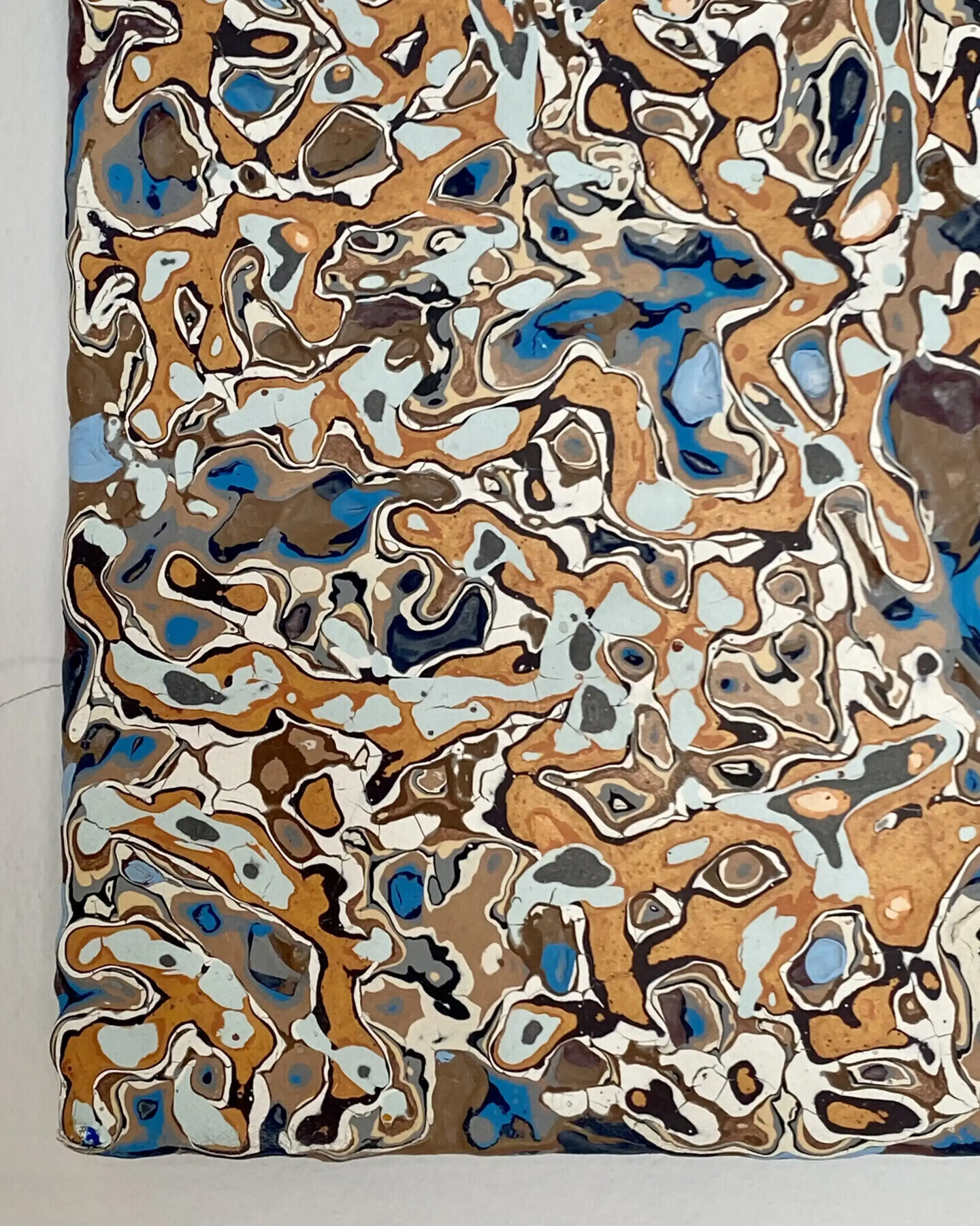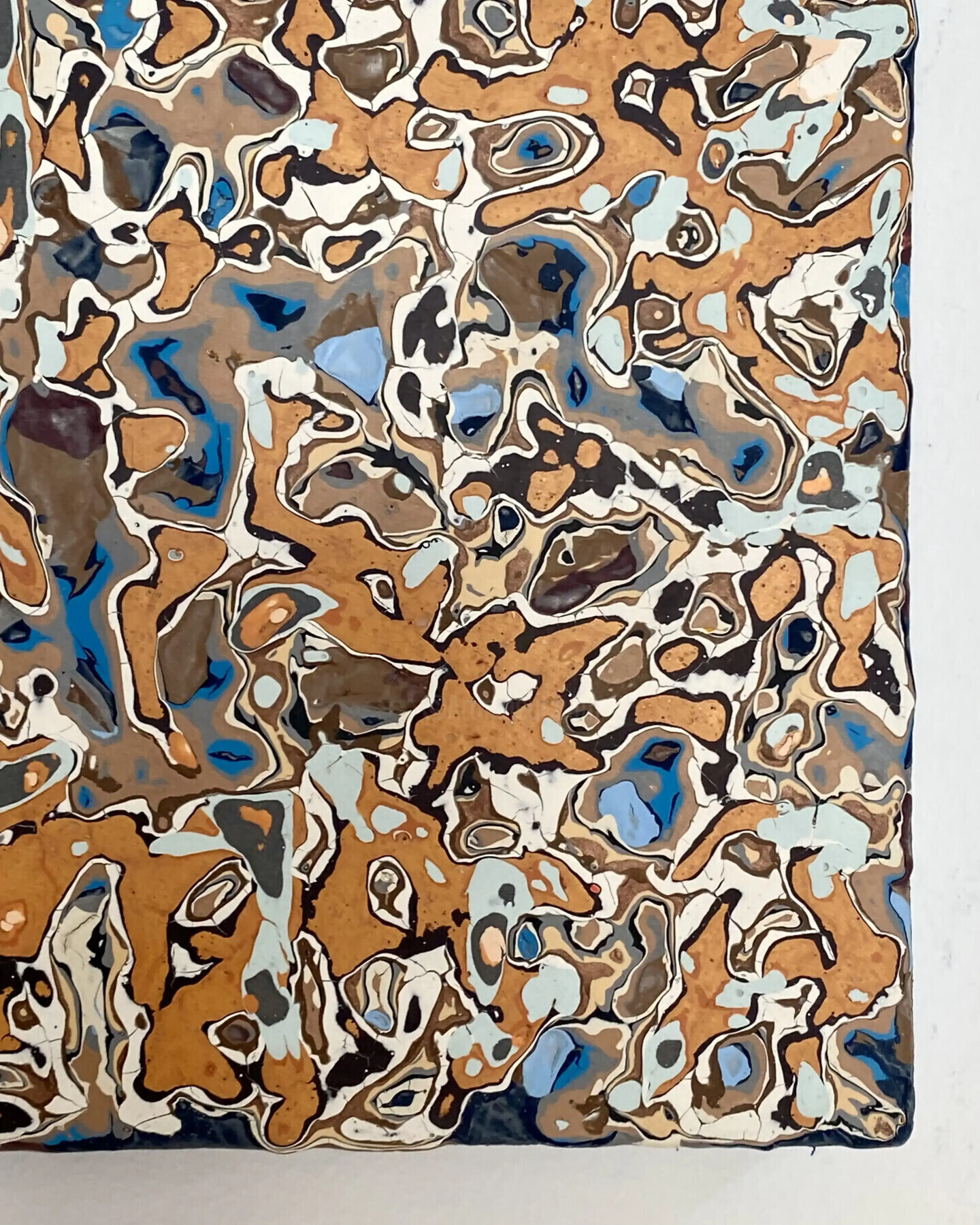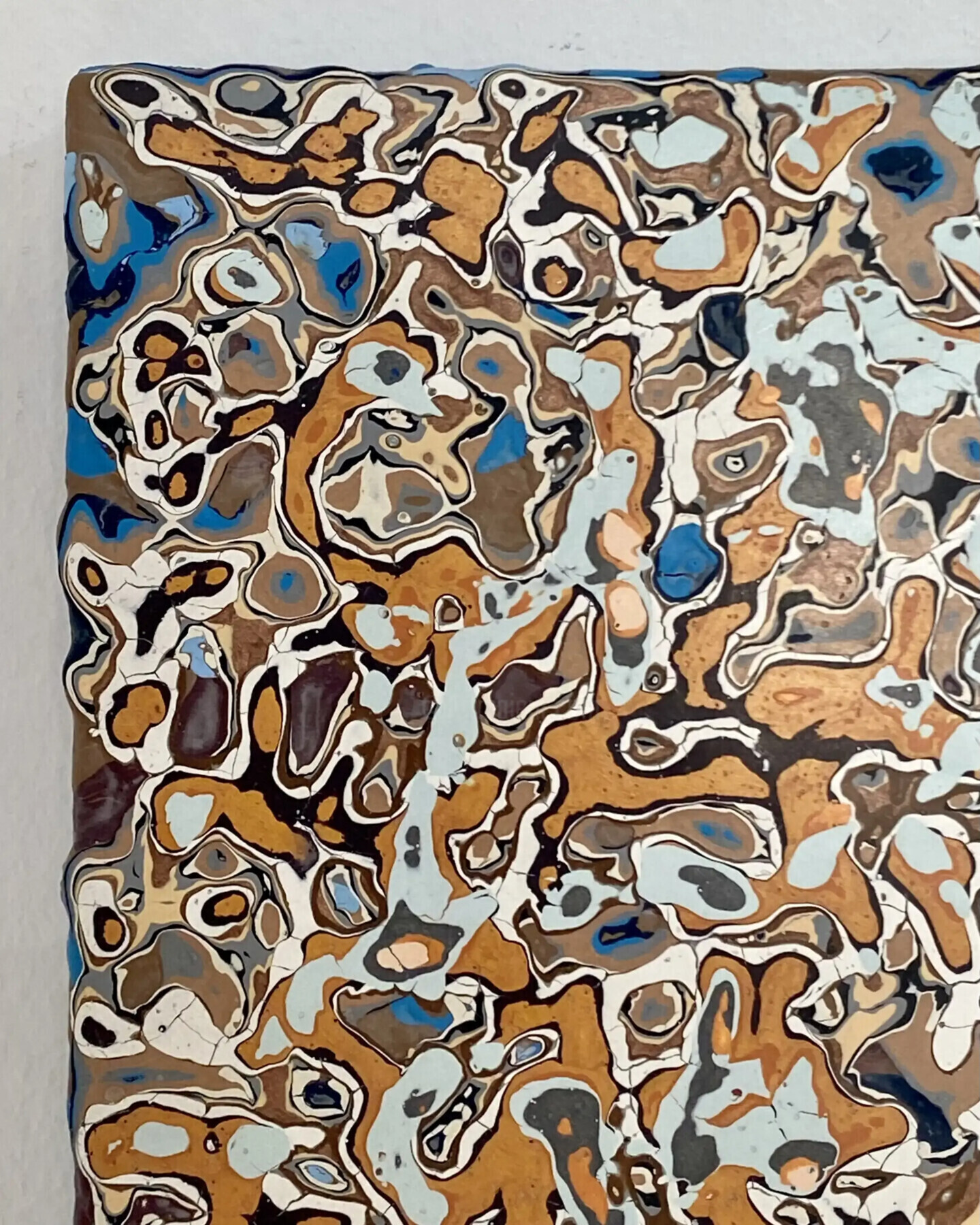 Shimizu construit des couches de multiples couleurs par des mouvements pleins d’énergie, faisant ressortir son impact sur les matériaux. Ces couches sont ensuite « déconstruites » par le ponçage. Les strates, invisibles dans un premier temps, sont alors dévoilées.