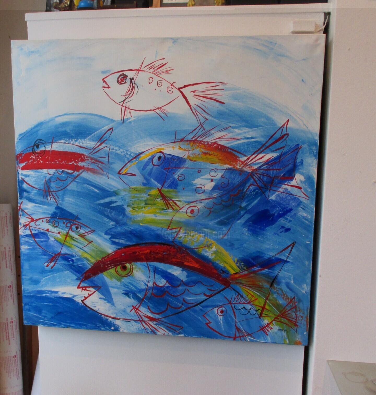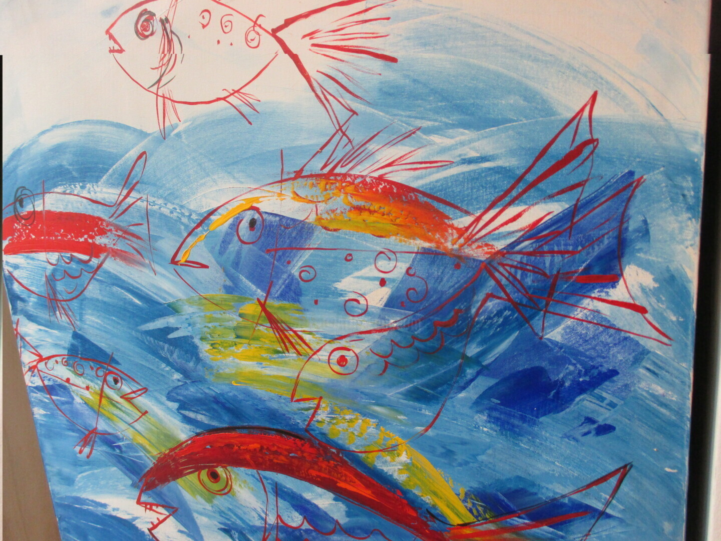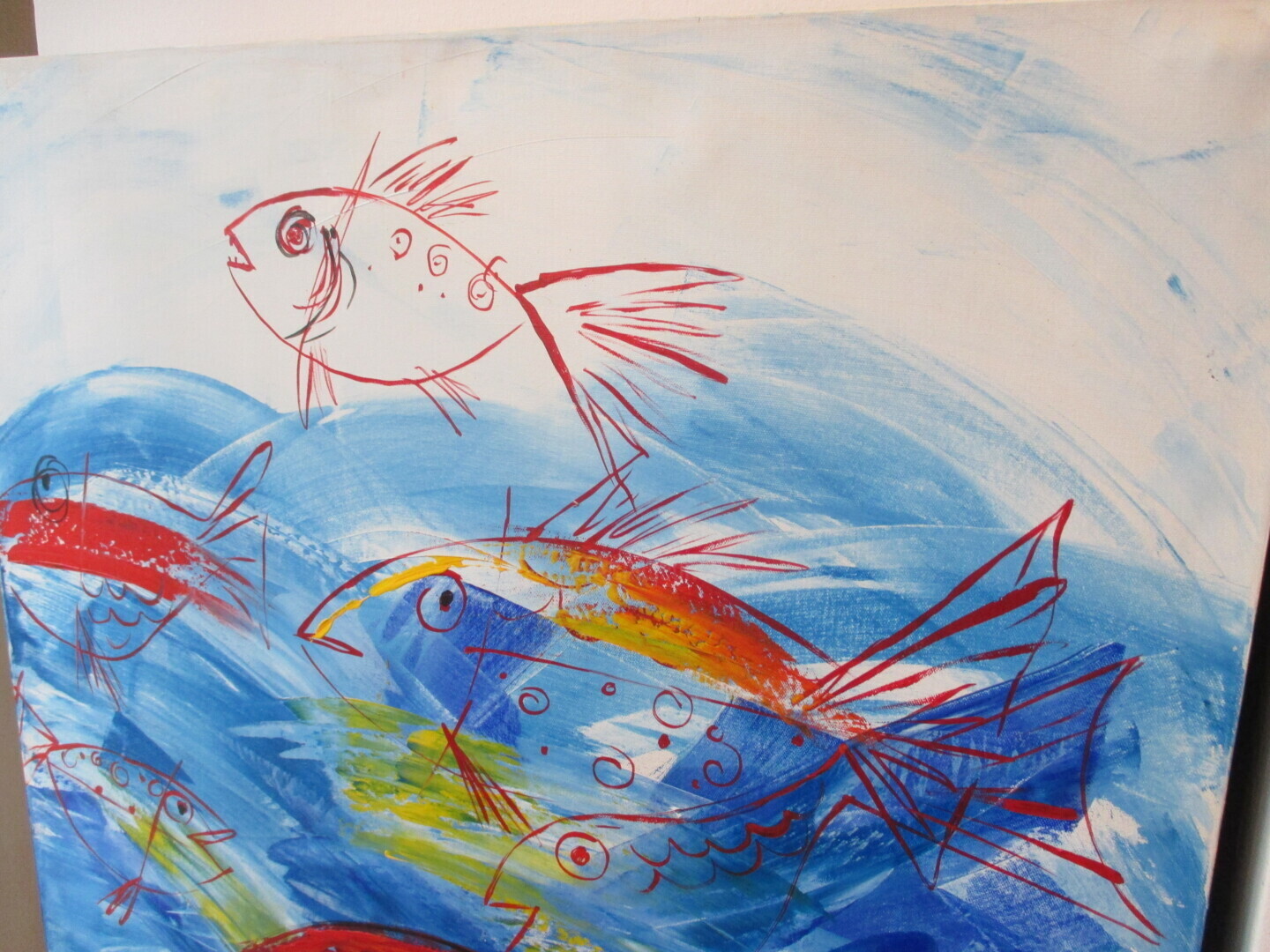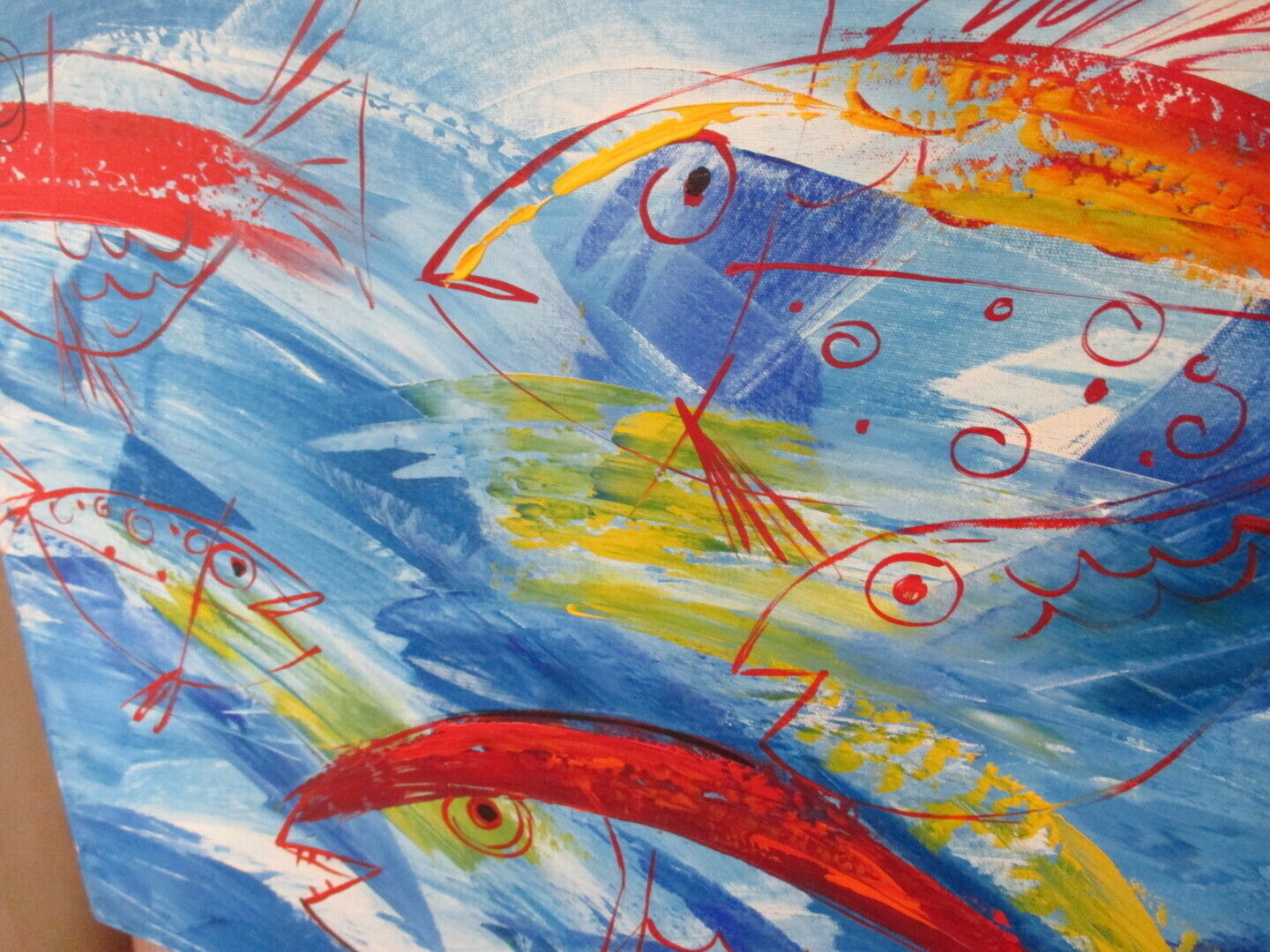Zeichnerische Akzente sind auch immer in ihren Arbeiten auch auf Leinwand zu sehen - ob mediterrane Städte, Tierzeichnungen oder Menschen in Mengen - der schnelle reduzierte Strich aus der Acryltube erzählt expressive kleine Geschichten mit Lebensfreude.