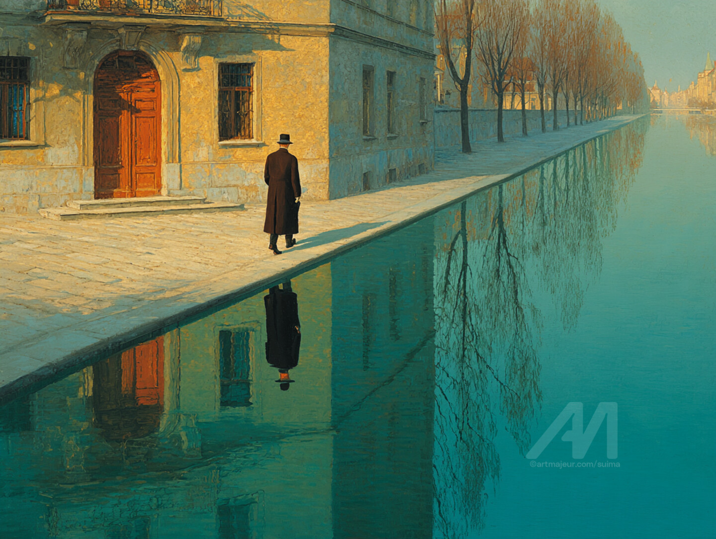 This work depicts a scholar-like figure against the serene reflection of a beautiful blue-green water surface. A bold composition, with a straight path leading into the distance, invites the viewer on a contemplative walk. Its tranquil tones and calm atmosphere evoke a sense of introspection, offering a quiet escape from the noise of everyday life.
