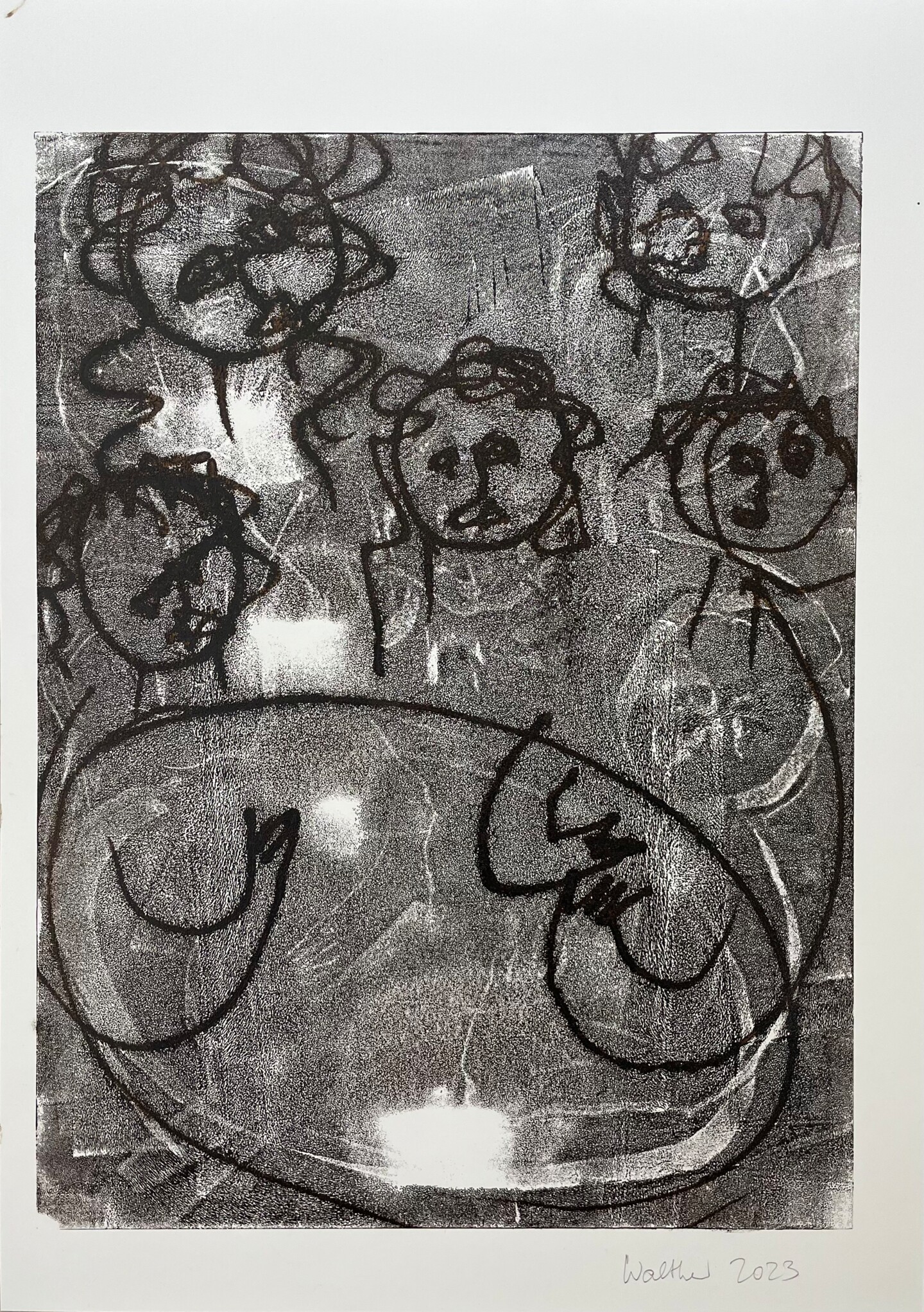 Allerdings versteht Walther ihre Arbeiten nicht als "Porträts". Es sind vielmehr Seelenvisionen und Charakterstudien. Dazu passt die schnelle, gestische, die Dinge instinktiv erfassende und intuitiv dahin werfende Arbeitsweise. Das Thema "Familie" reicht aber weiter. Denn Walther schöpft gleichermaßen aus der Erinnerung an Kindheits-Szenen mit zwei jüngeren Geschwistern. Und natürlich beobachtet sie alles, was nach Familie aussieht, im Alltag der Gegenwart. Hier wird die Arbeitsweise noch freier, noch experimenteller. Es entstehen geradezu legendäre Malereien, Skizzen und Monotypien, etwa zu den Themen "Fünfköpfige Familie" und "Patchwork-Familie".