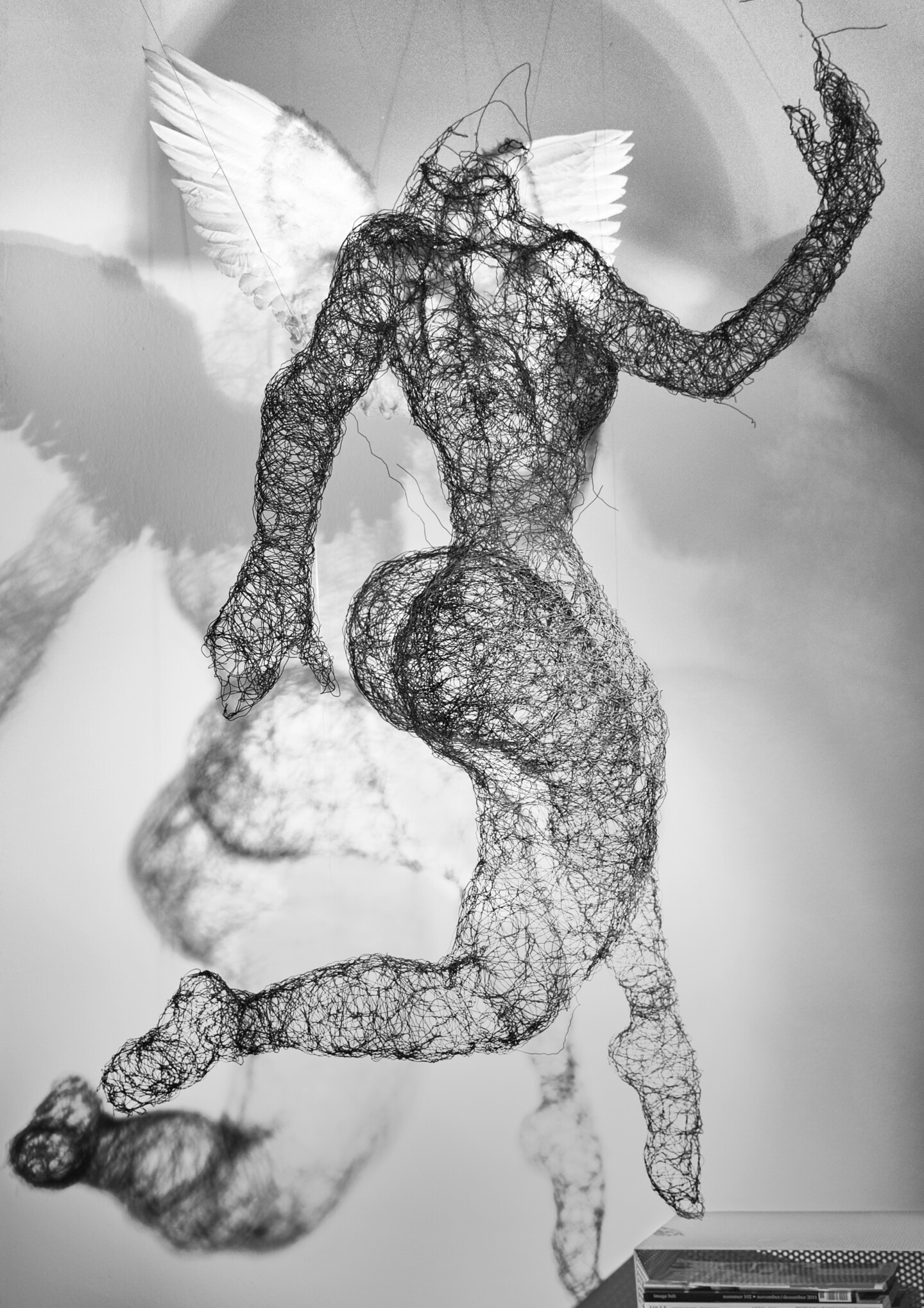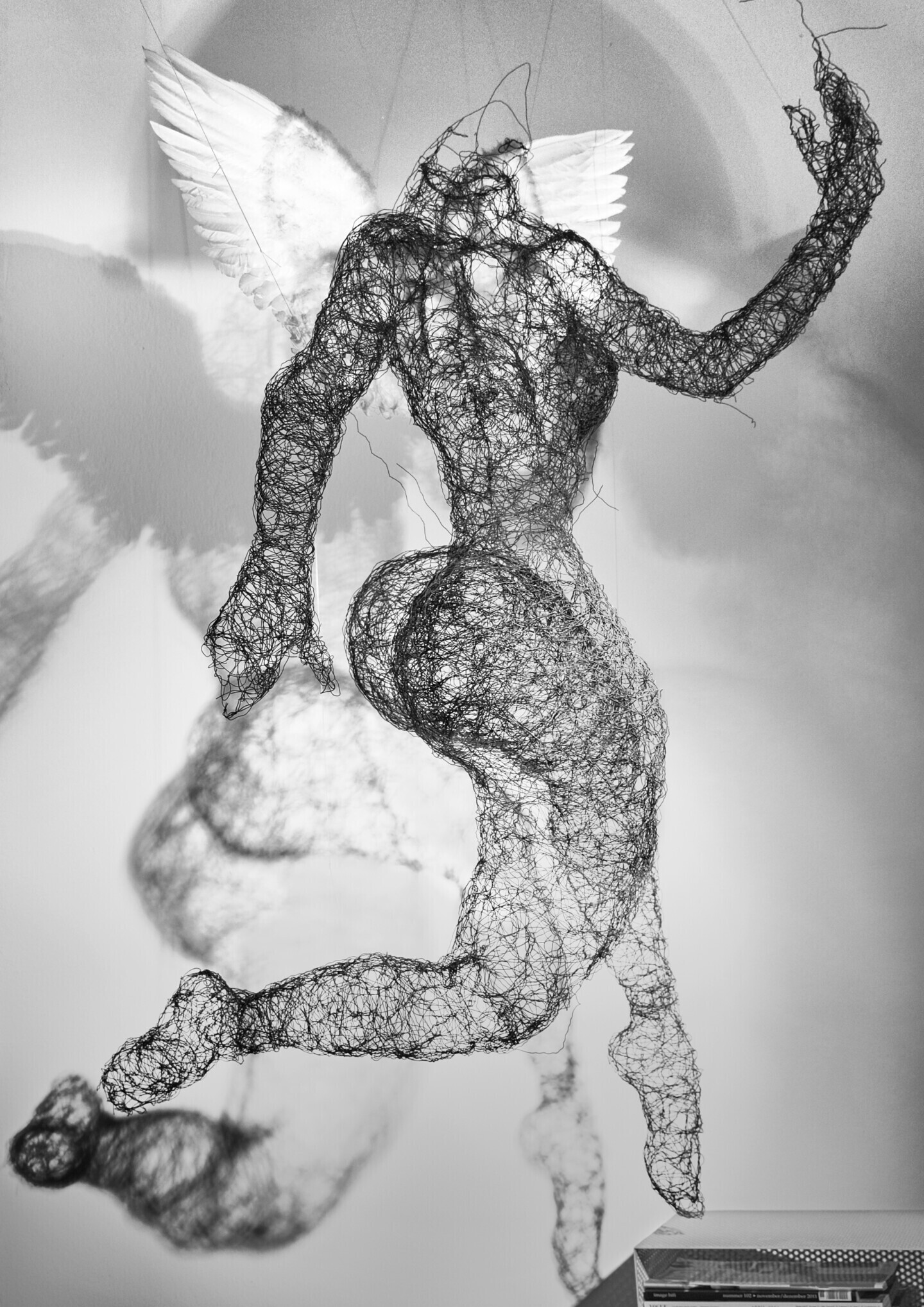 In dieser Skulptur fange ich die Essenz der Freiheit und des ungebändigten Geistes ein. Geschaffen aus geglühtem Eisendraht ist die schwebende Engelsfrau sowohl eine Feier der Stärke als auch der Zerbrechlichkeit. Ihre dynamische Pose und die fein ausgearbeiteten Flügel strahlen eine kraftvolle Leichtigkeit aus. Dieses Kunstwerk soll den Raum mit einem Gefühl des Aufbruchs und der Inspiration erfüllen. Es ist ein Symbol dafür, wie wir uns über das Alltägliche erheben und in unerwartete Höhen aufsteigen können.